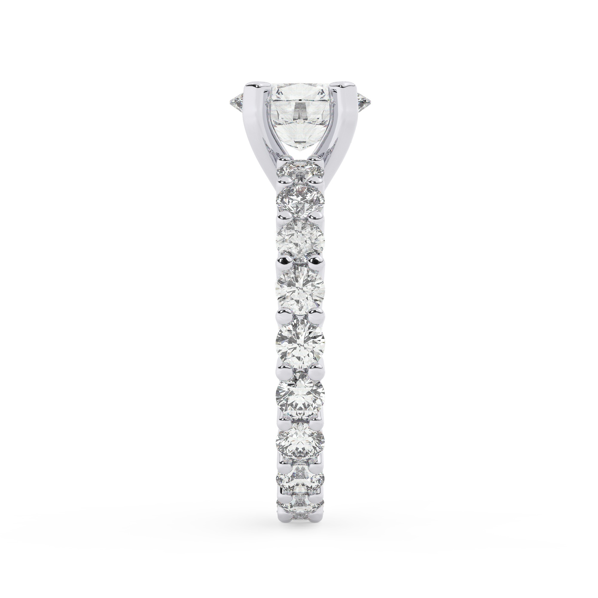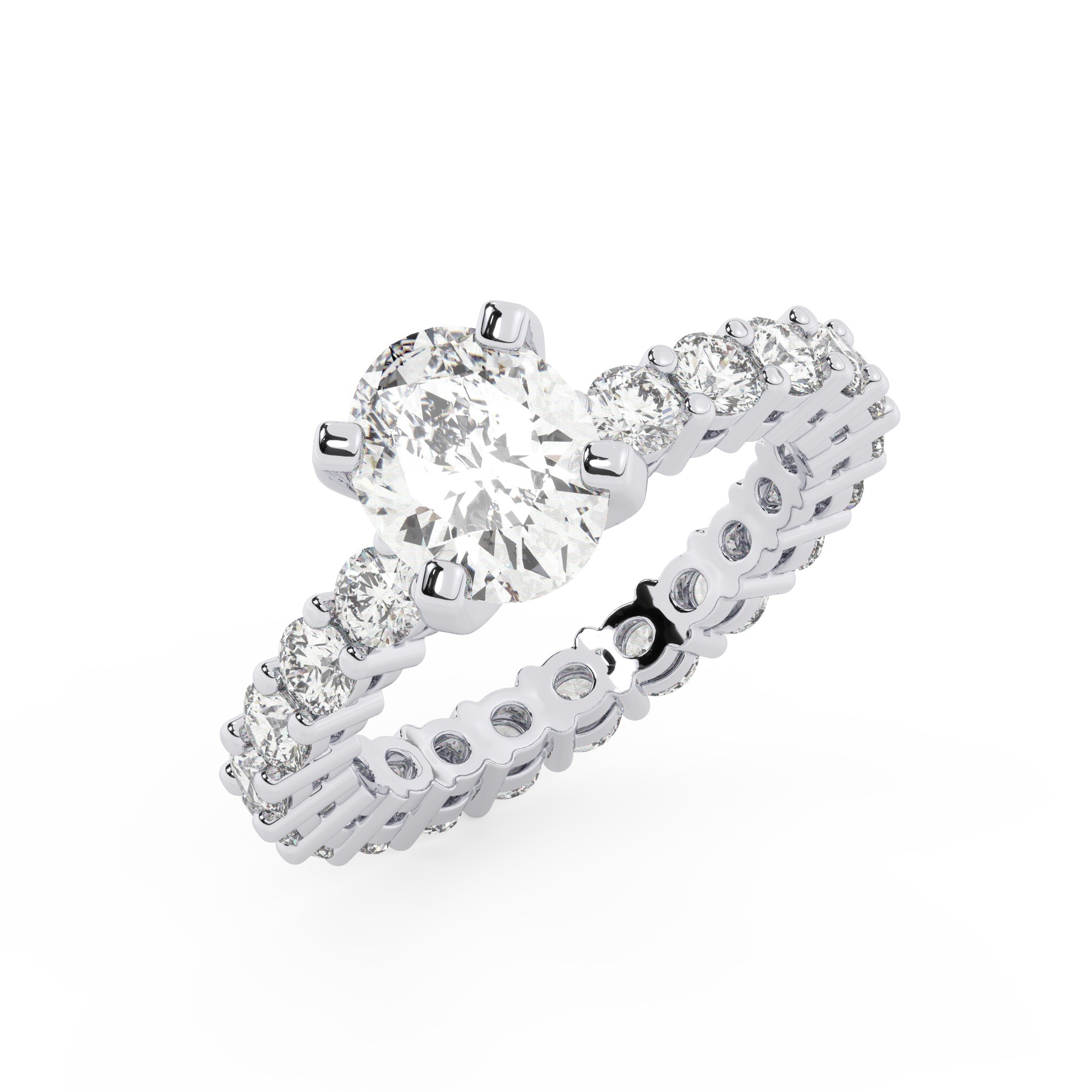 טבעת אירוסין סוליטר ויהלומים בצדדים איטרנטיני דגם 50044 כסף מצופה זהב לבן במרכז יהלום מעבדה 2.50 קראט בחיתוך אובל עם תעודה גמולוגית אירופאית IGI מסביב ובצדדים יהלומי מעבדה במשקל כולל של 1.80 קראט בחיתוך עגול