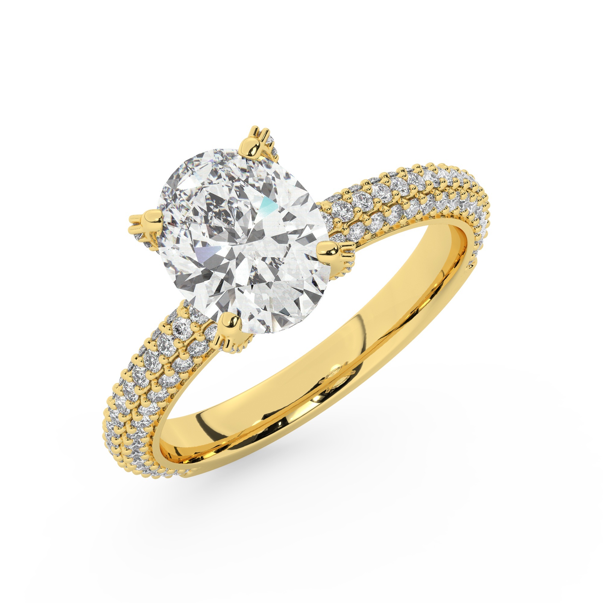 טבעת אירוסין מרהיבה בסגנון סוליטר עם יהלום מעבדה מרכזי 2.50 קראט בצורת אובל, מוקפת ב-117 יהלומים צדדיים, בשיבוץ כסף מצופה זהב צהוב. איכות גבוהה, עיצוב קלאסי ונוכחות יוקרתית ומרשימה.