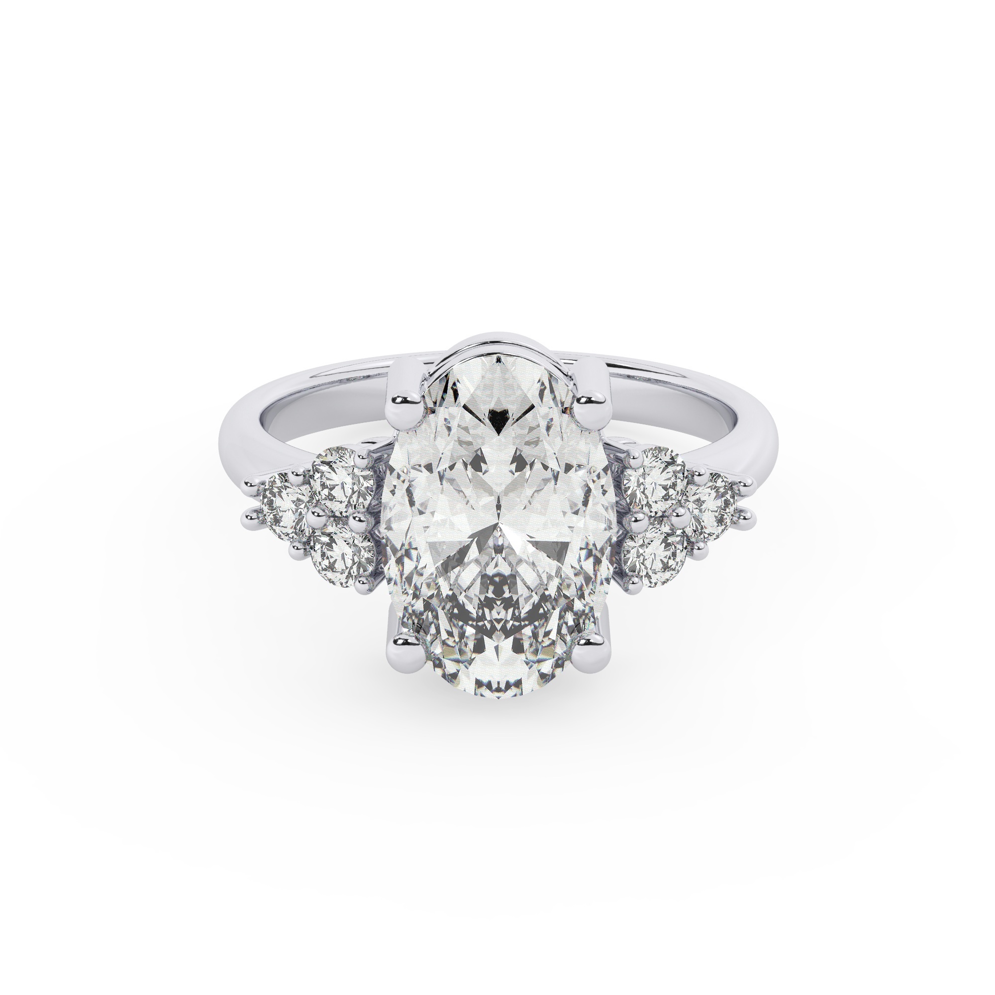 טבעת אירוסין סוליטר ויהלומים בצדדים דגם 50041 כסף מצופה זהב לבן במרכז יהלום מעבדה 3 קראט בחיתוך אובל עם תעודה גמולוגית אירופאית IGI מסביב ובצדדים יהלומי מעבדה במשקל כולל של 0.30 קראט בחיתוך עגול
