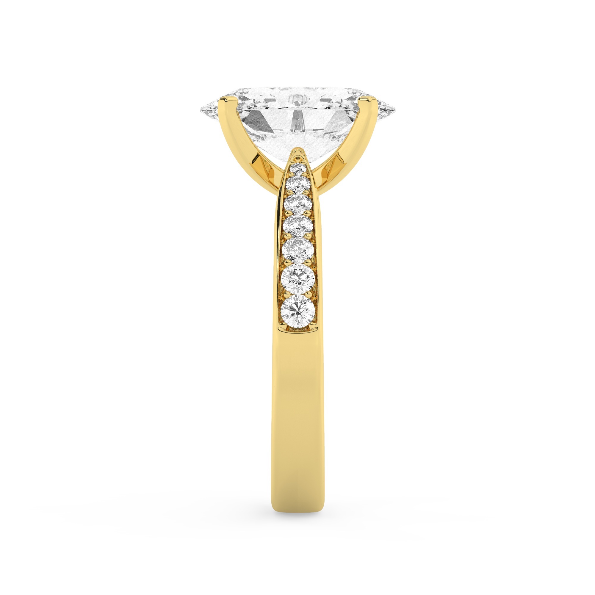 טבעת אירוסין סוליטר ויהלומים בצדדים דגם 50017 כסף מצופה זהב צהוב במרכז יהלום מעבדה 4 קראט בחיתוך אובל עם תעודה גמולוגית אירופאית IGI מסביב ובצדדים יהלומי מעבדה במשקל כולל של 0.15 קראט בחיתוך עגול
