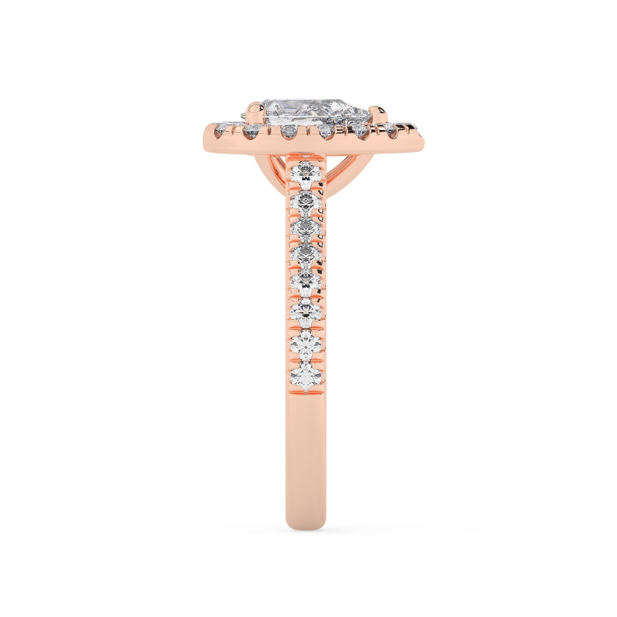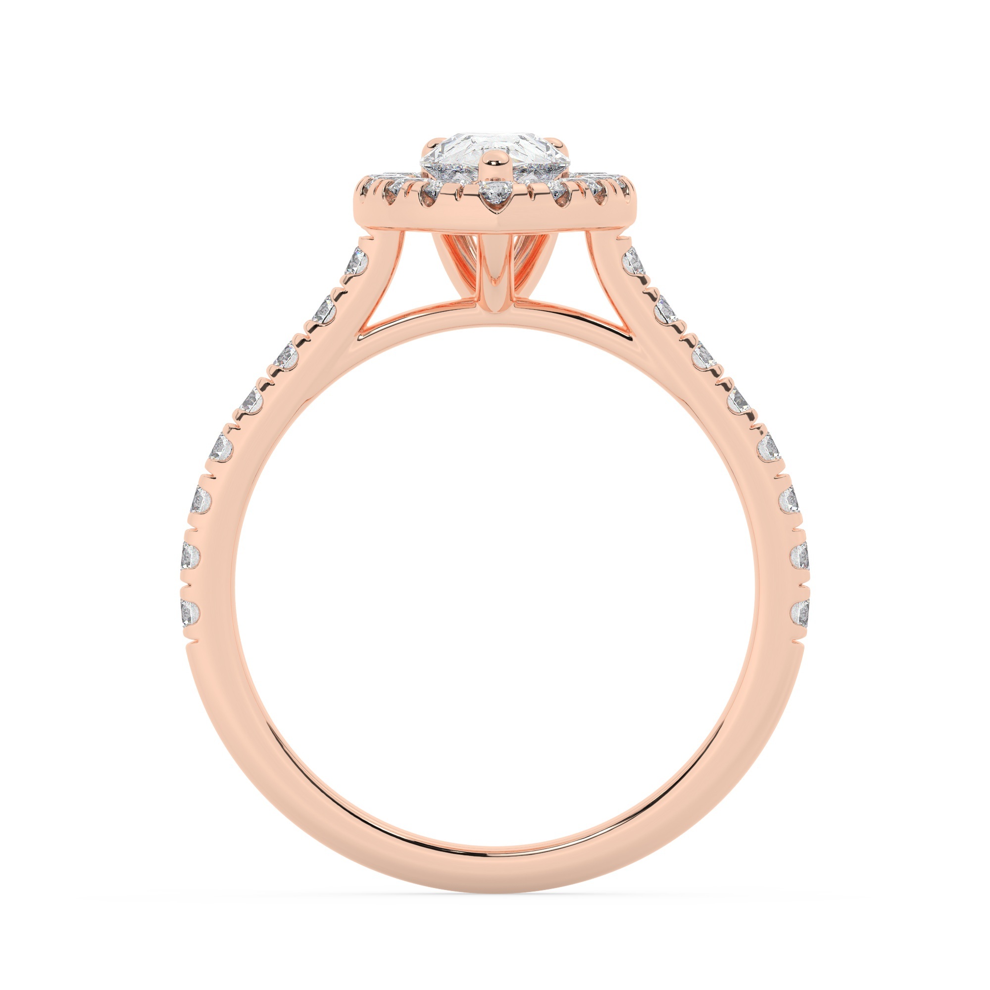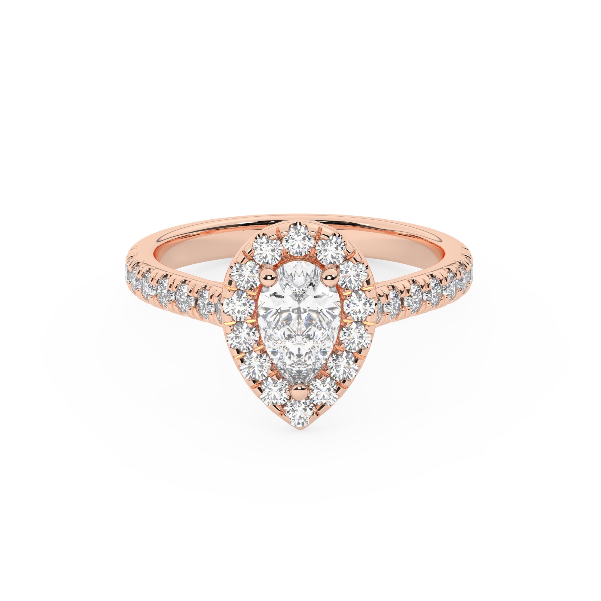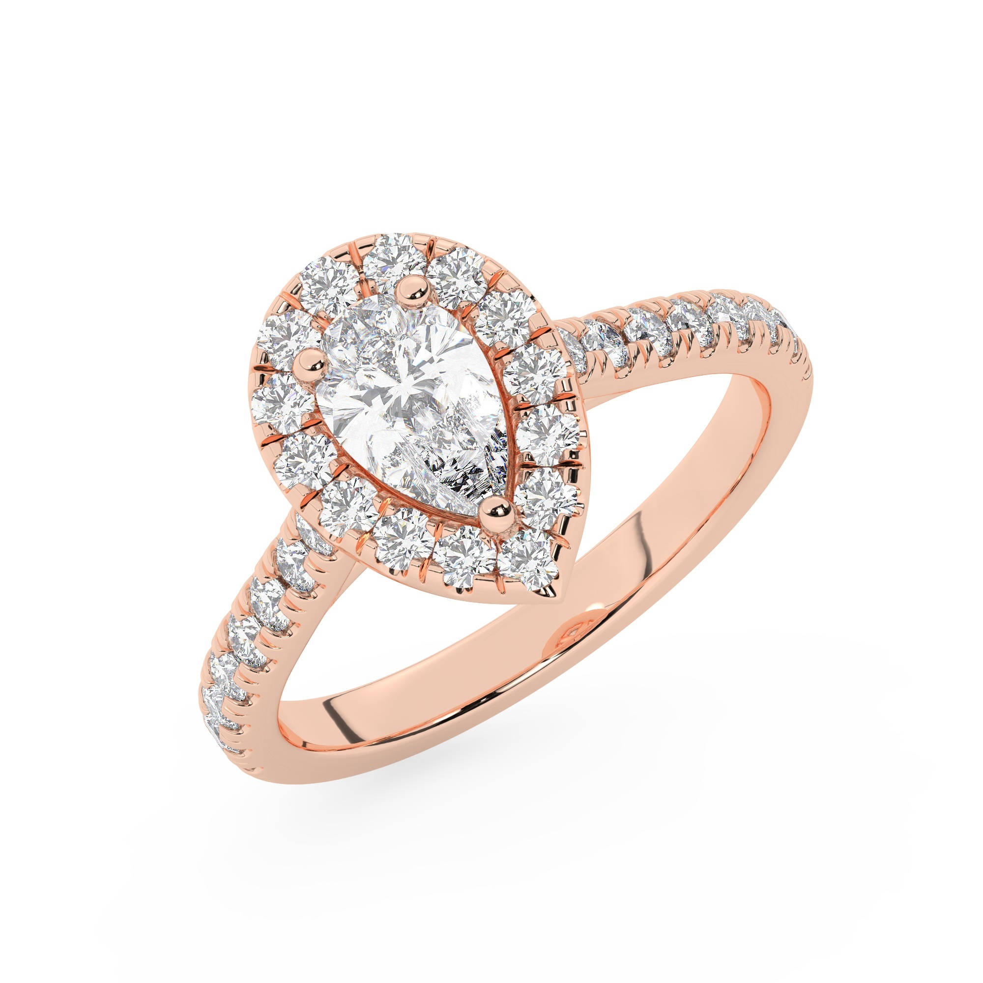 טבעת אירוסין היילו דגם 50026 כסף מצופה זהב אדום רוזגולד במרכז יהלום מעבדה 1 קראט בחיתוך טיפה עם תעודה גמולוגית אירופאית IGI מסביב ובצדדים יהלומי מעבדה במשקל כולל של 0.60 קראט בחיתוך עגול