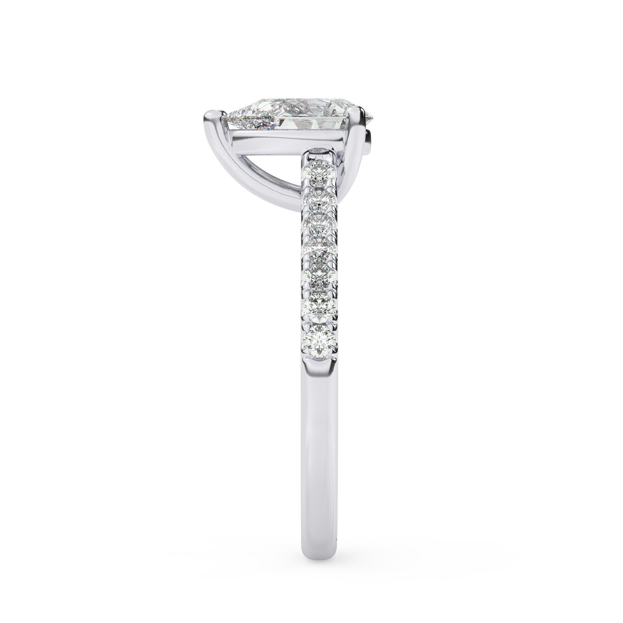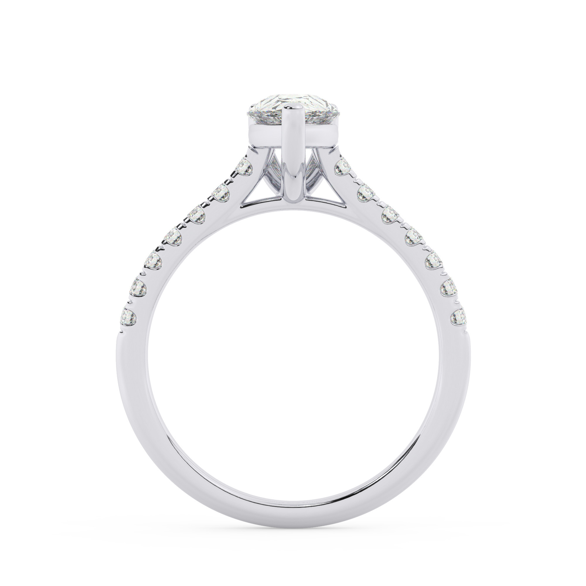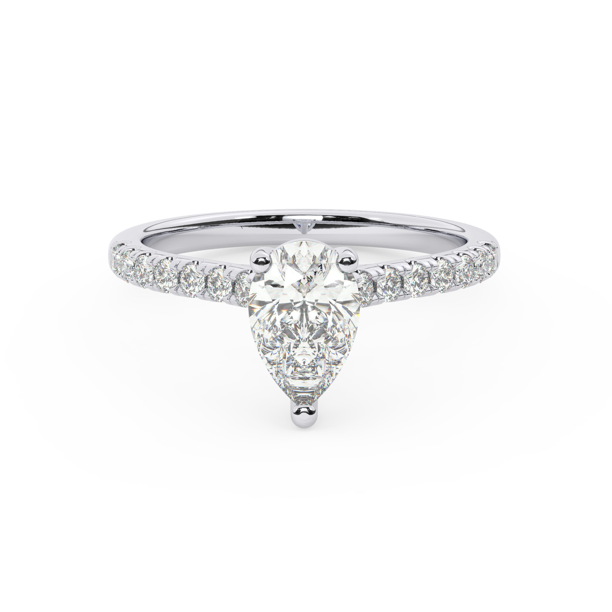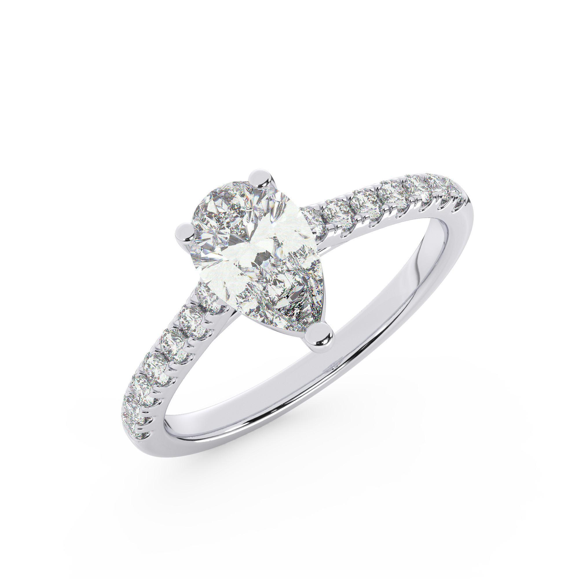 טבעת אירוסין סוליטר ויהלומים בצדדים דגם 50019 כסף מצופה זהב לבן במרכז יהלום מעבדה 1 קראט בחיתוך טיפה עם תעודה גמולוגית אירופאית IGI מסביב ובצדדים יהלומי מעבדה במשקל כולל של 0.28 קראט בחיתוך עגול