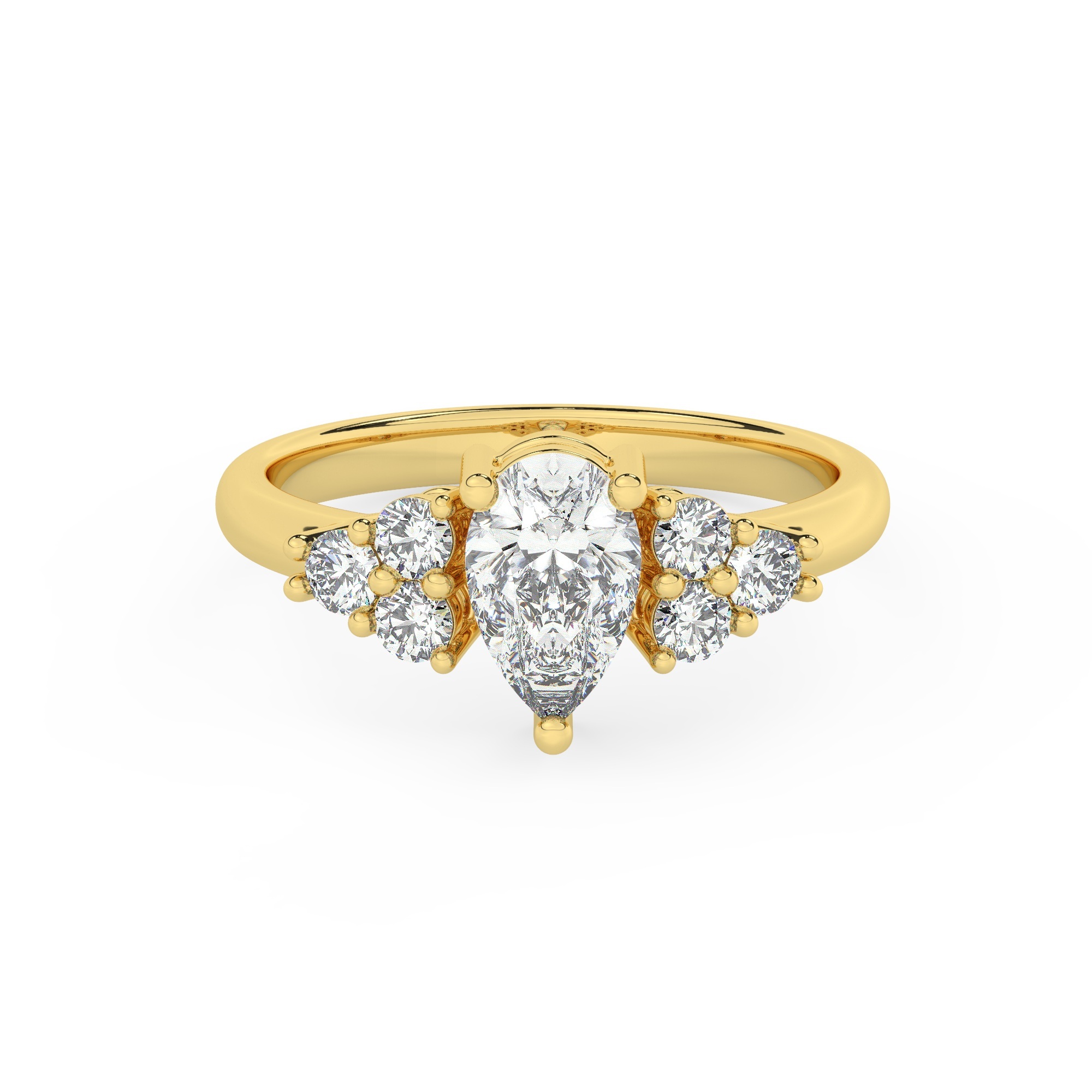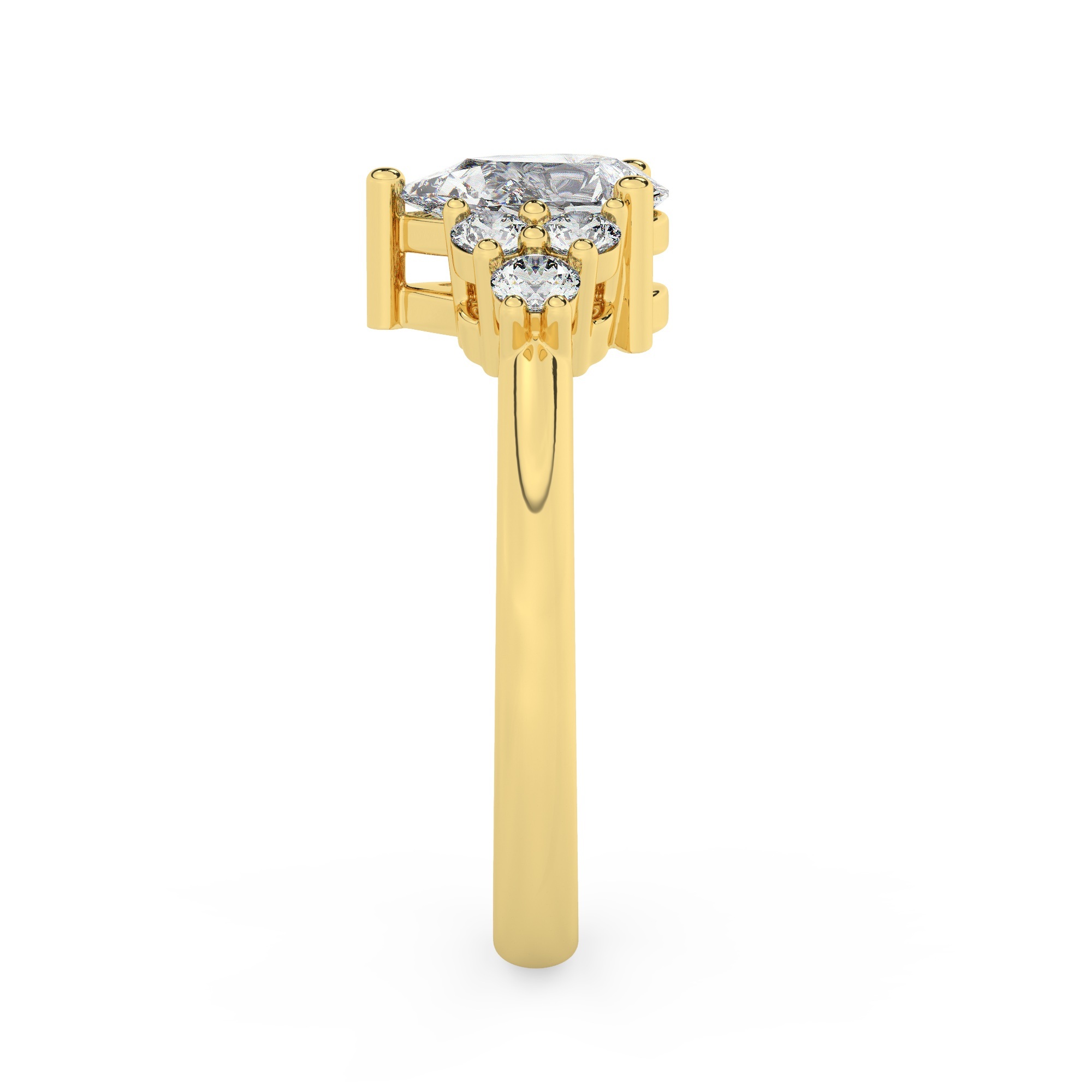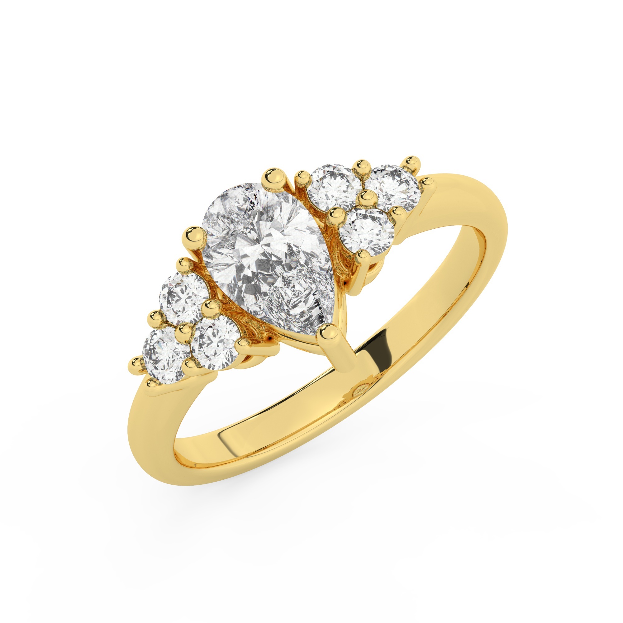 טבעת אירוסין סוליטר ויהלומים בצדדים דגם 50041 כסף מצופה זהב צהוב במרכז יהלום מעבדה 1 קראט בחיתוך טיפה עם תעודה גמולוגית אירופאית IGI מסביב ובצדדים יהלומי מעבדה במשקל כולל של 0.30 קראט בחיתוך עגול