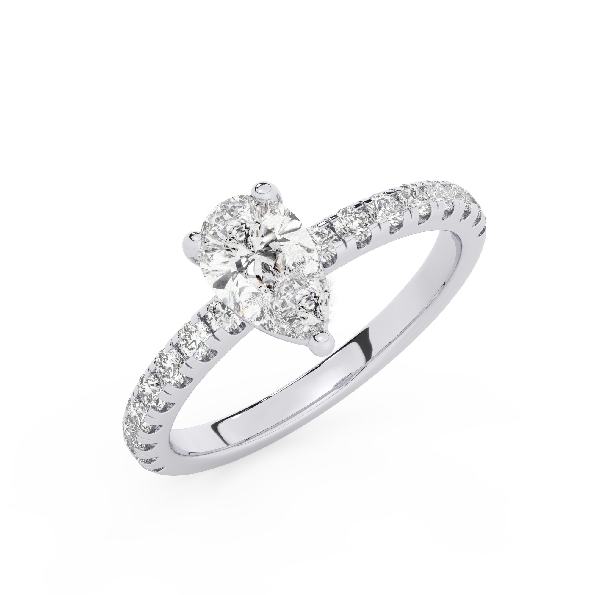 טבעת אירוסין סוליטר ויהלומים בצדדים דגם 50037 כסף מצופה זהב לבן במרכז יהלום מעבדה 1.50 קראט בחיתוך טיפה עם תעודה גמולוגית אירופאית IGI מסביב ובצדדים יהלומי מעבדה במשקל כולל של 0.32 קראט בחיתוך עגול