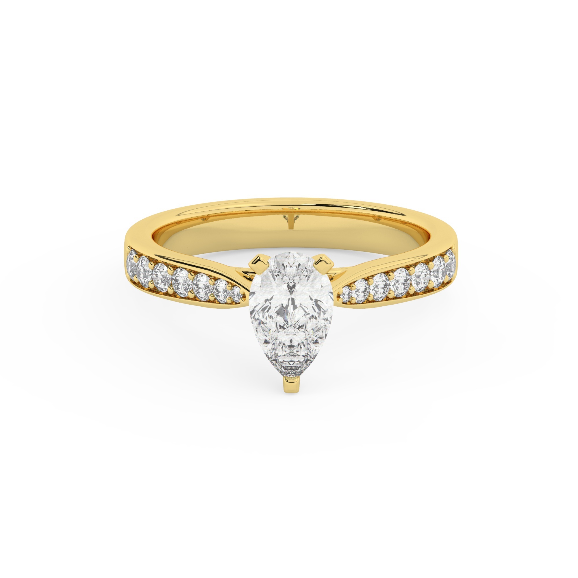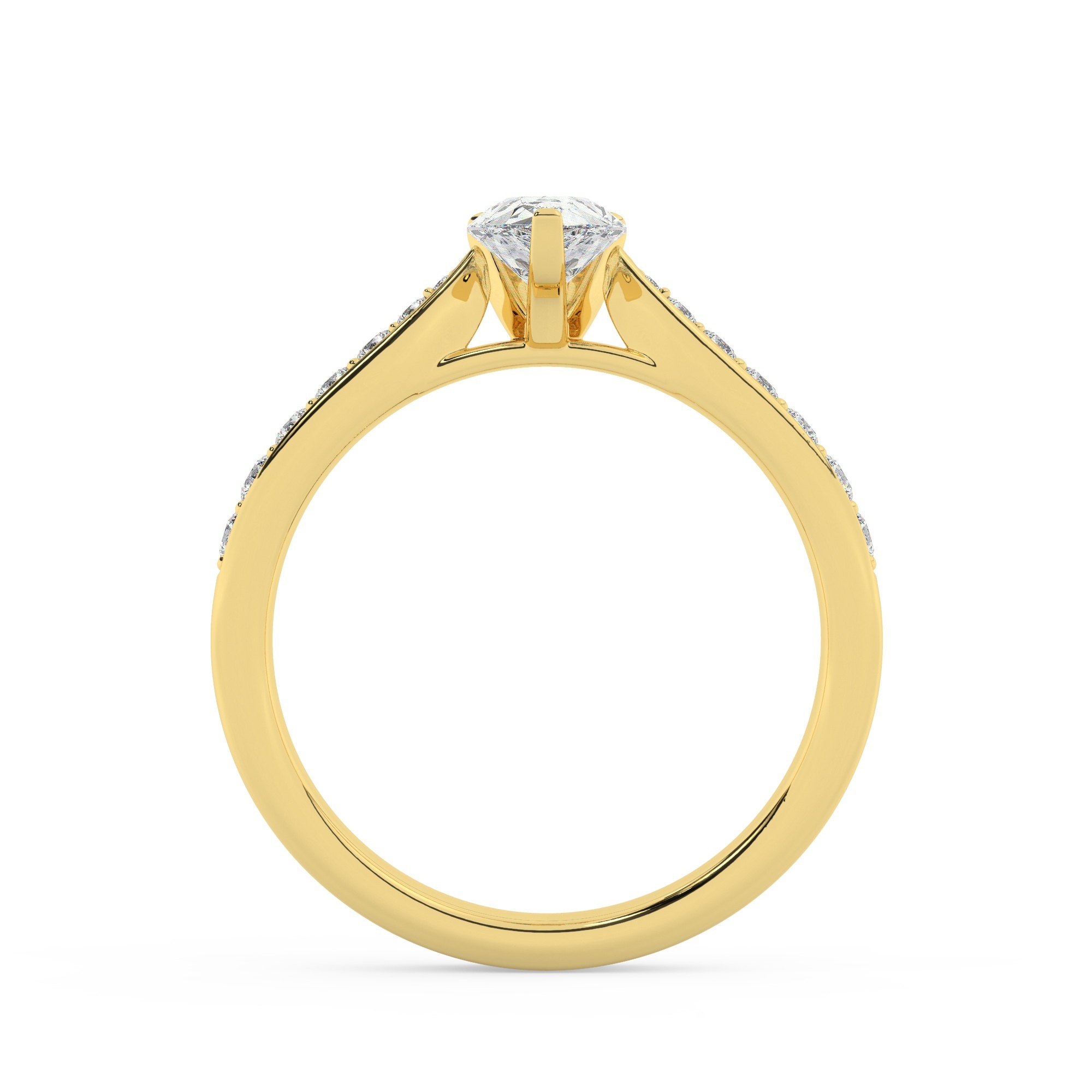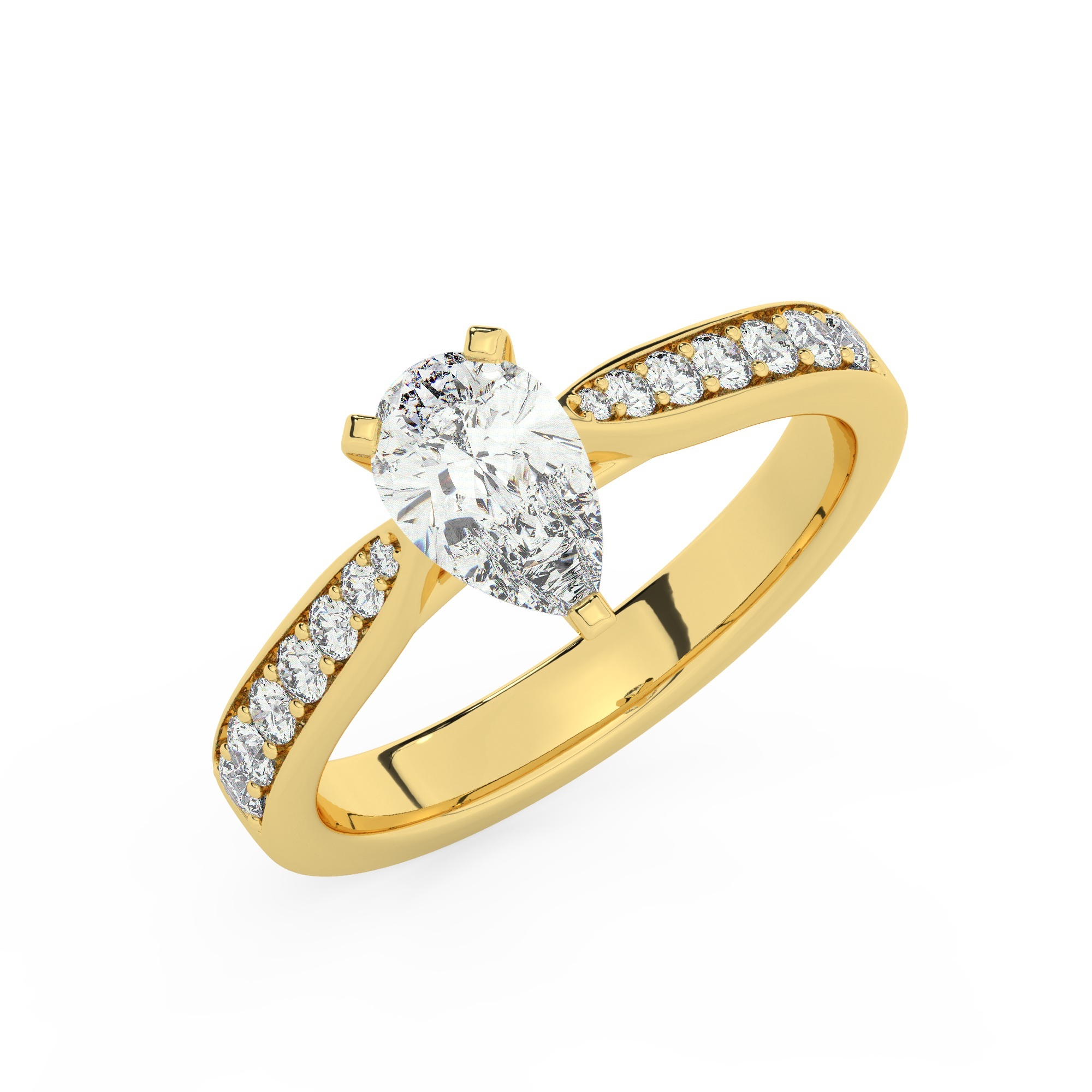טבעת אירוסין סוליטר ויהלומים בצדדים דגם 50017 כסף מצופה זהב צהוב במרכז יהלום מעבדה 1.50 קראט בחיתוך טיפה עם תעודה גמולוגית אירופאית IGI מסביב ובצדדים יהלומי מעבדה במשקל כולל של 0.15 קראט בחיתוך עגול