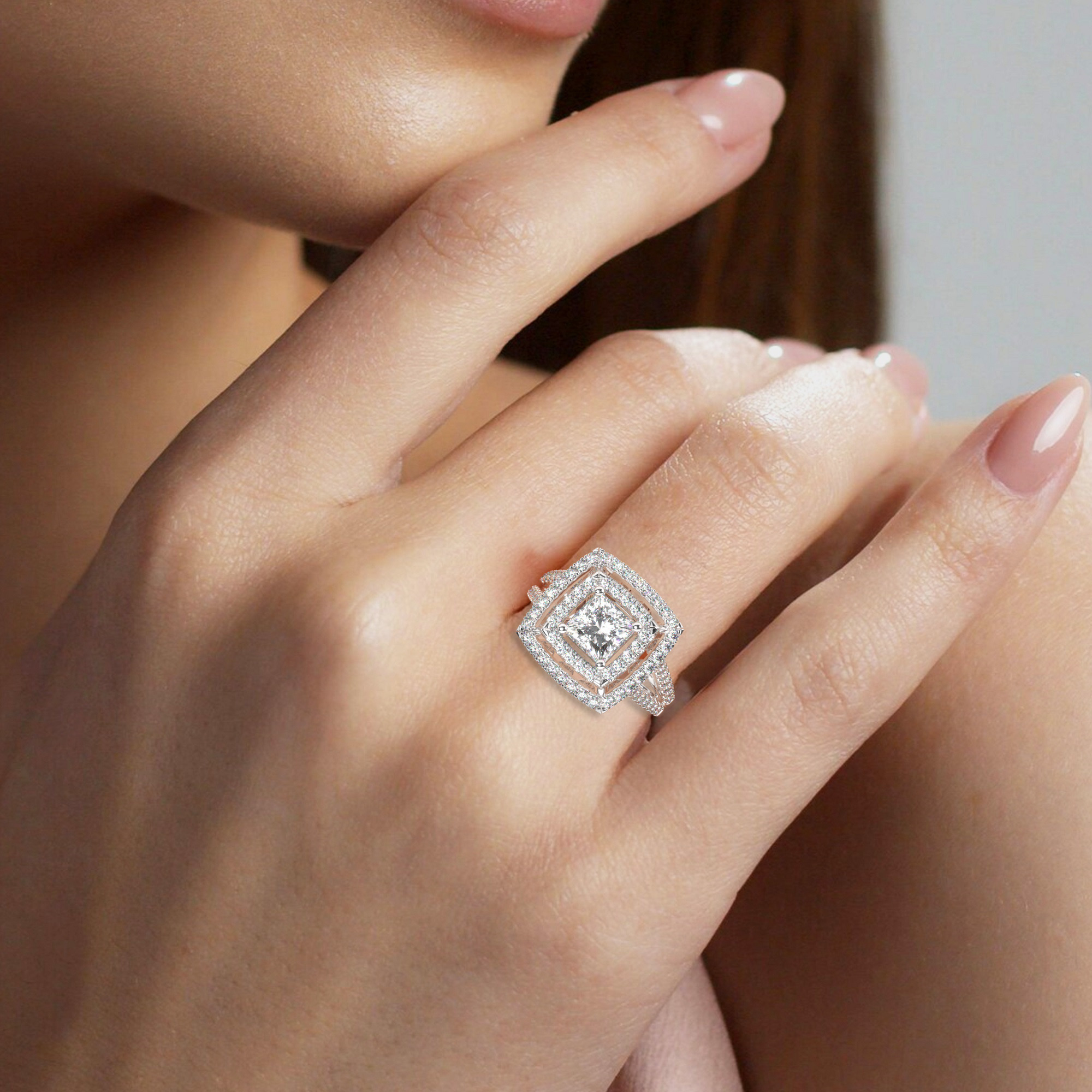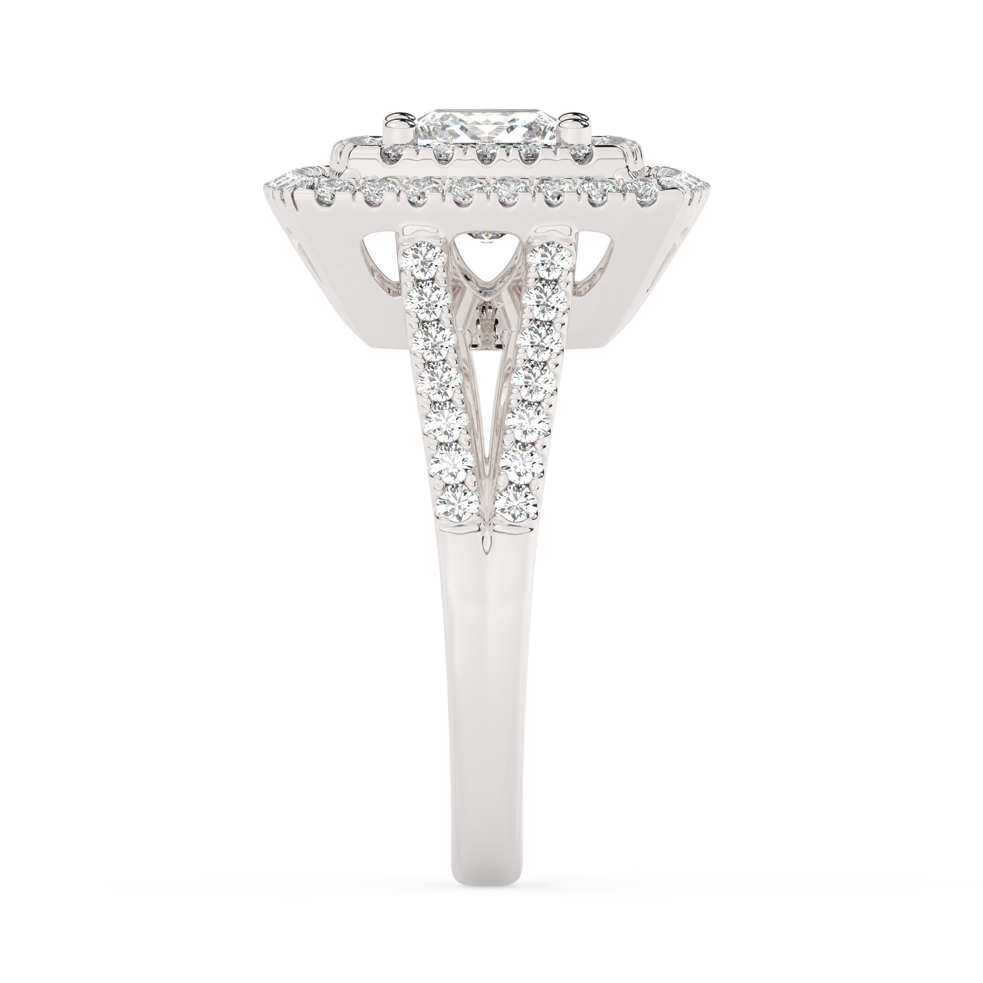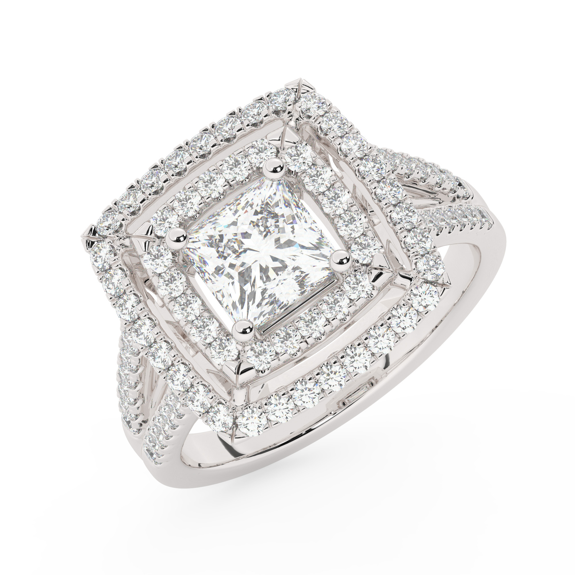 טבעת אירוסין היילו דגם 50025 כסף מצופה זהב לבן במרכז יהלום מעבדה 0.75 קראט בחיתוך פרינסס עם תעודה גמולוגית מסביב ובצדדים יהלומי מעבדה במשקל כולל של 0.62 קראט בחיתוך עגול
