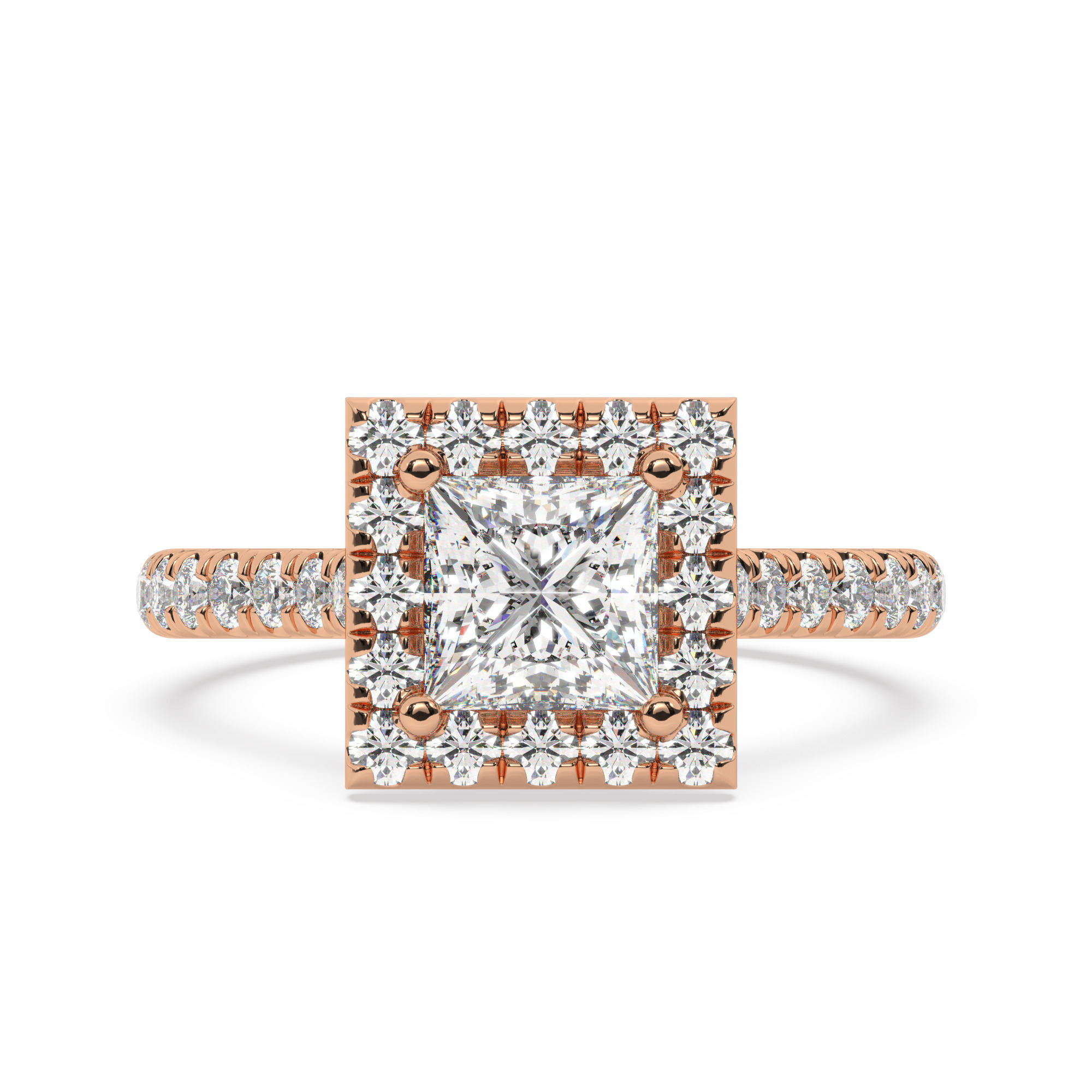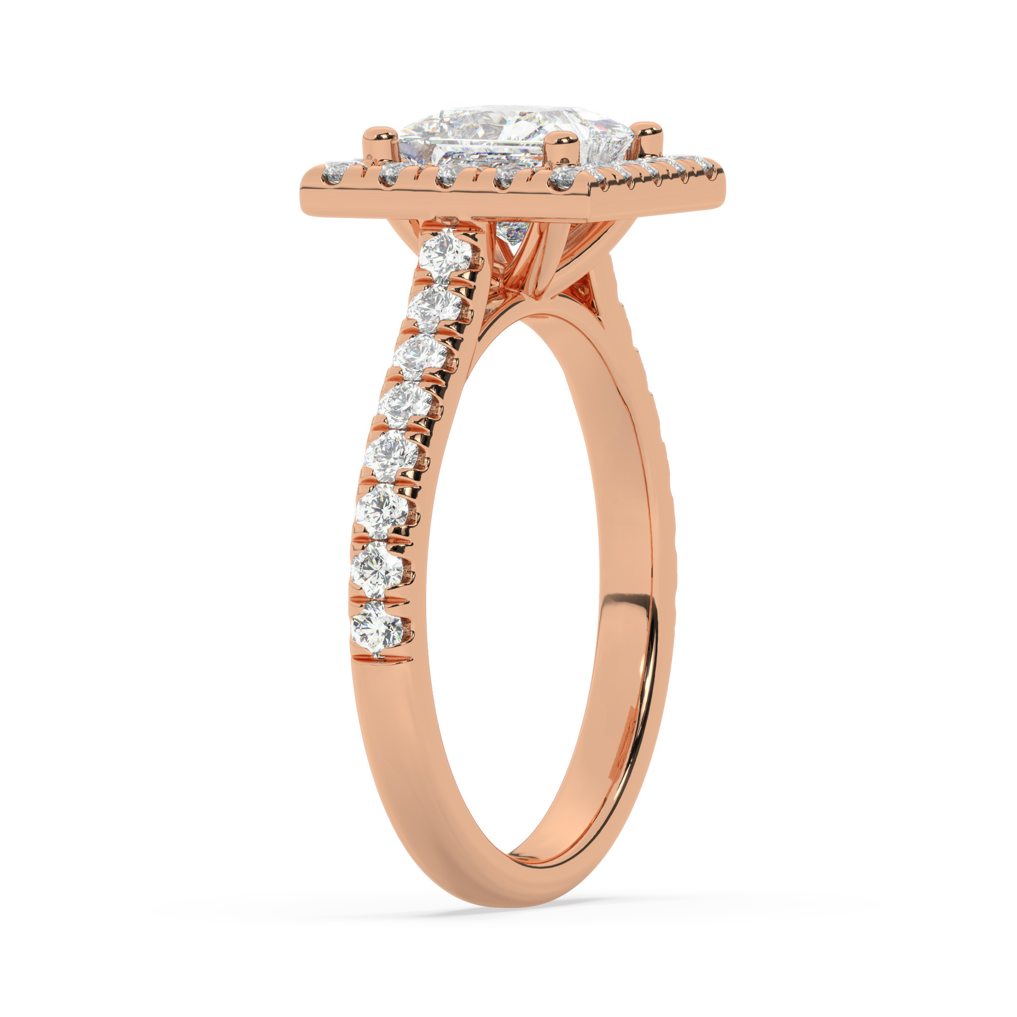 טבעת אירוסין היילו דגם 50026 כסף מצופה זהב אדום רוזגולד במרכז יהלום מעבדה 1 קראט בחיתוך פרינסס עם תעודה גמולוגית אירופאית IGI מסביב ובצדדים יהלומי מעבדה במשקל כולל של 0.60 קראט בחיתוך עגול