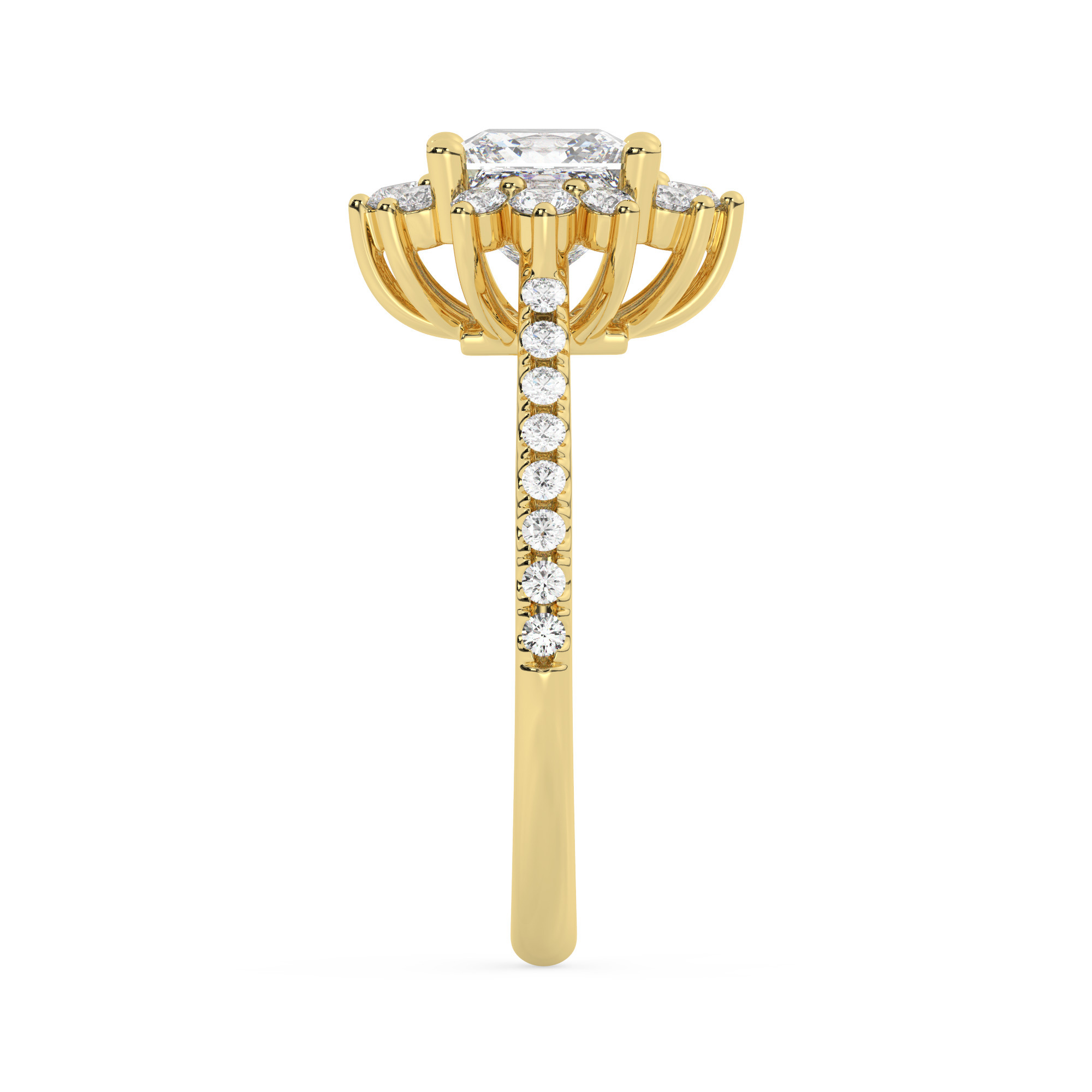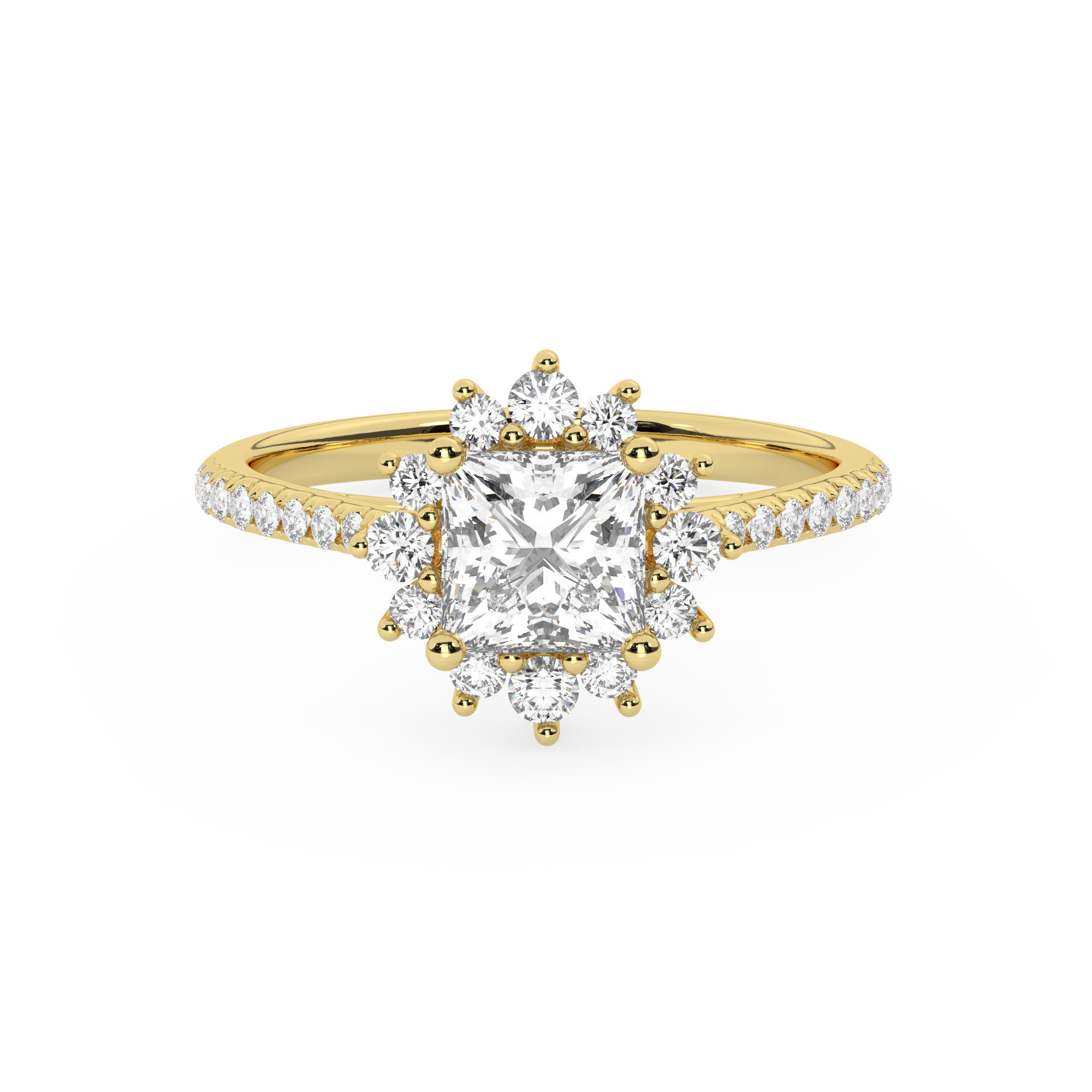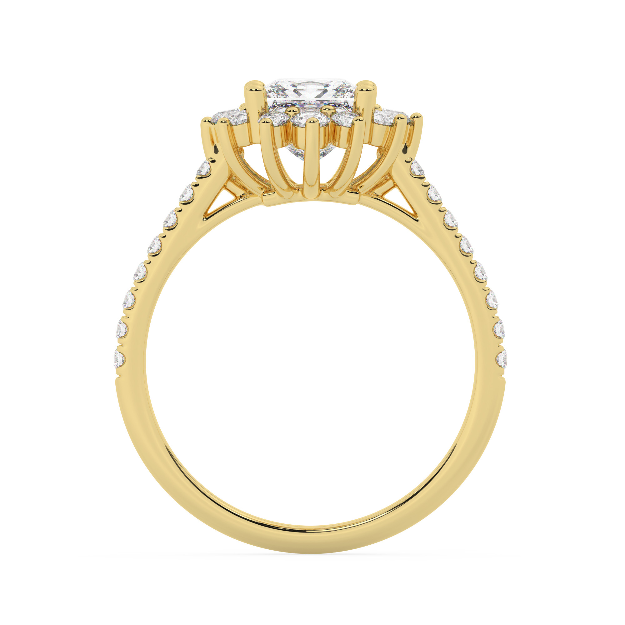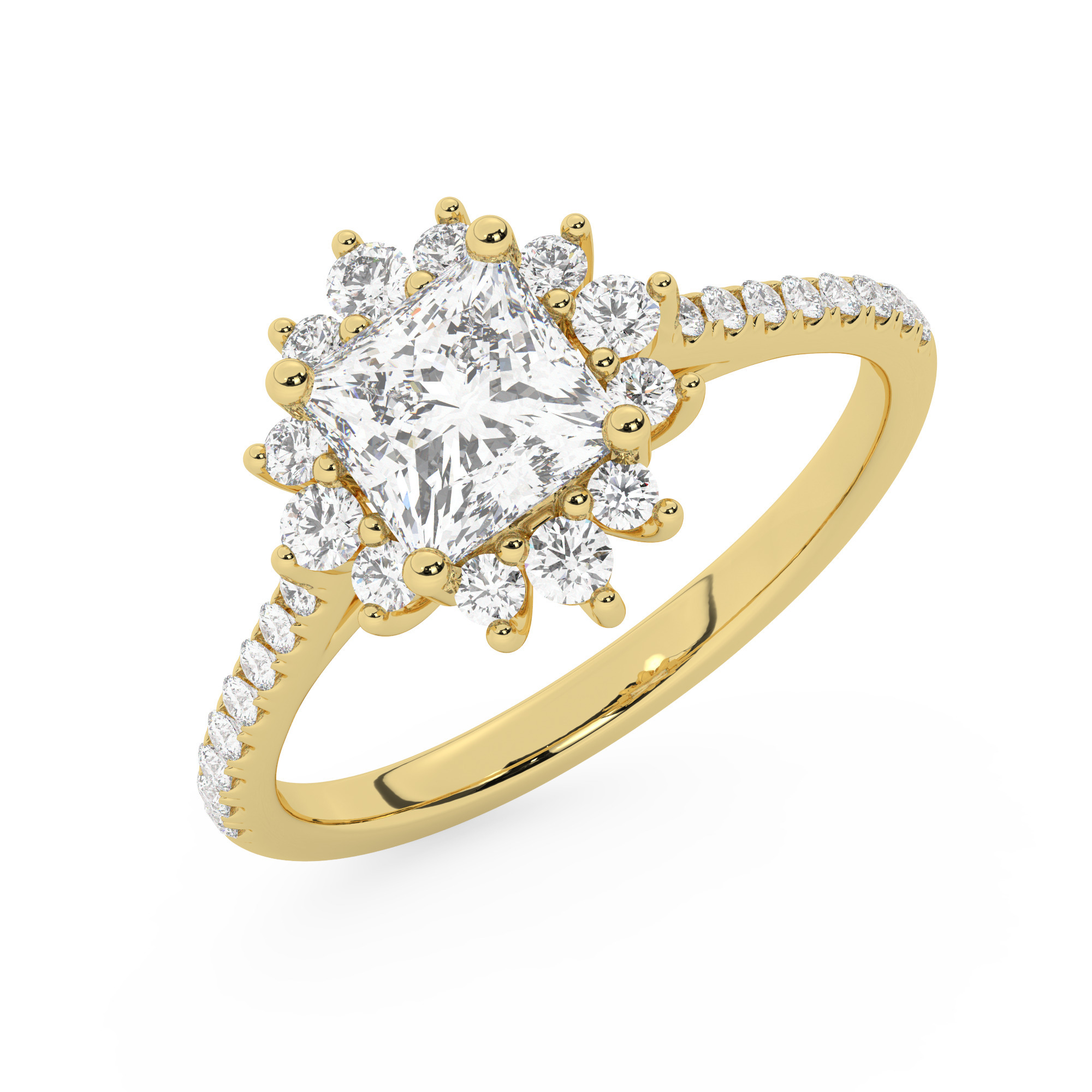 טבעת אירוסין היילו דגם 50024 כסף מצופה זהב צהוב במרכז יהלום מעבדה 1 קראט בחיתוך פרינסס עם תעודה גמולוגית אירופאית IGI מסביב ובצדדים יהלומי מעבדה במשקל כולל של 0.39 קראט בחיתוך עגול