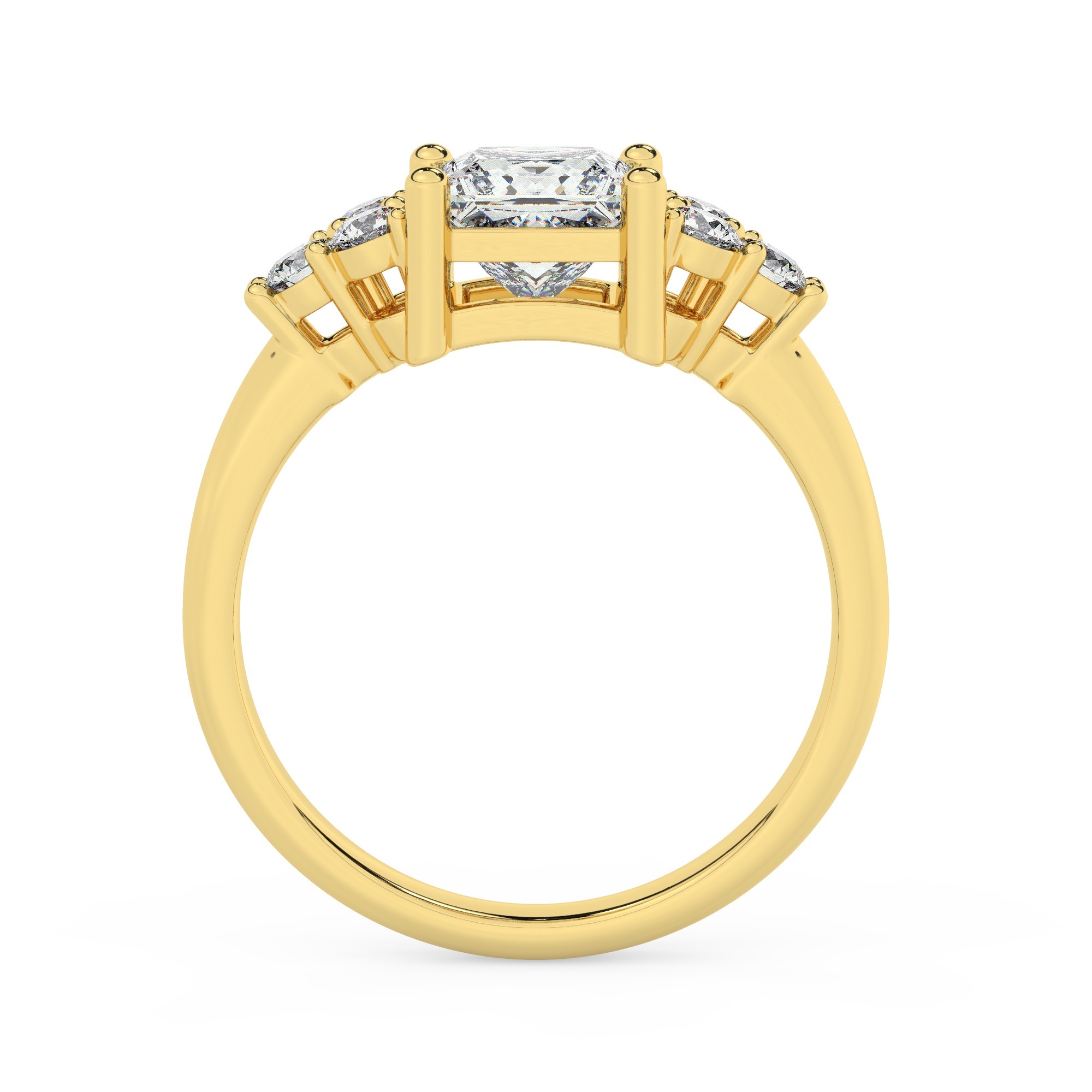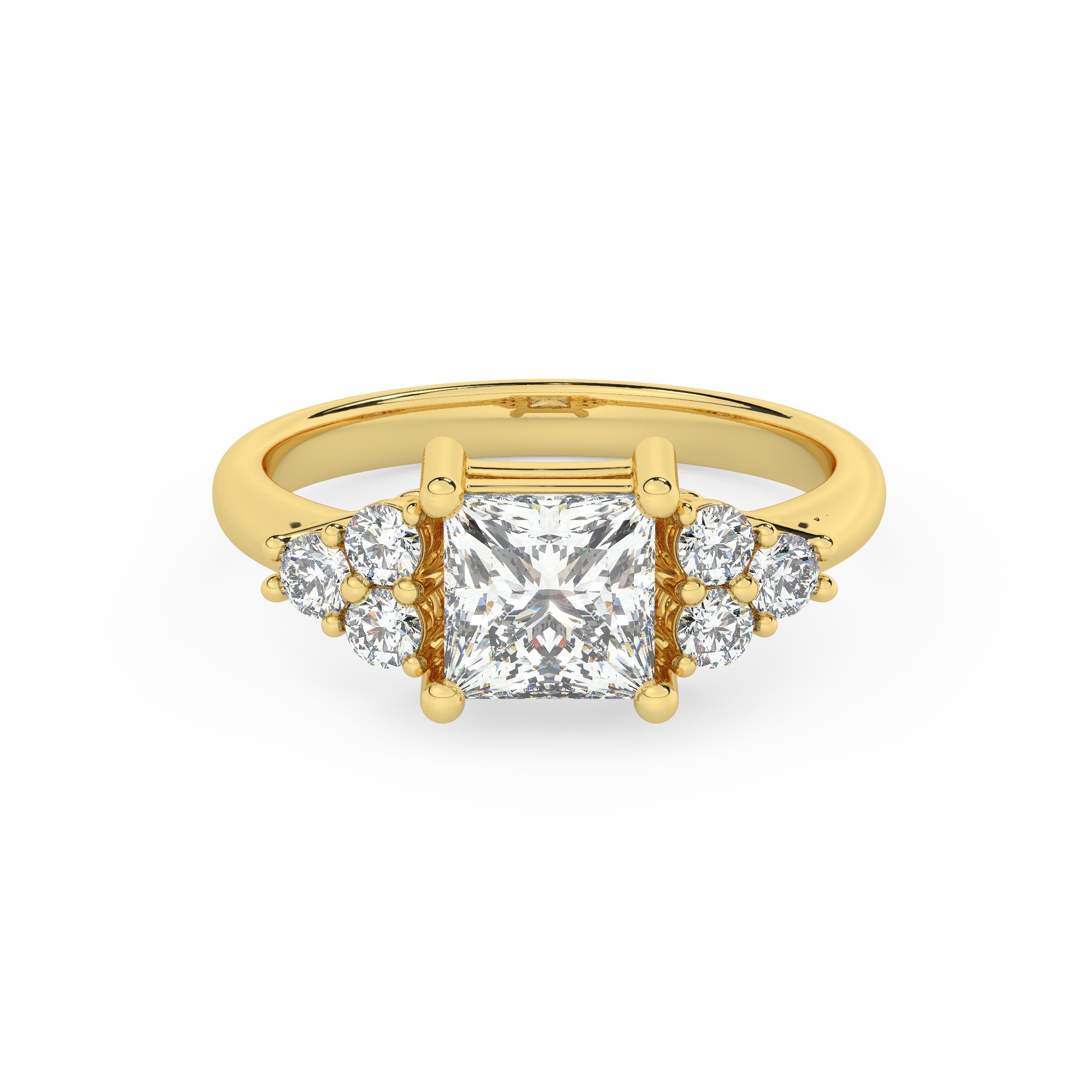 טבעת אירוסין סוליטר ויהלומים בצדדים דגם 50041 כסף מצופה זהב צהוב במרכז יהלום מעבדה 1 קראט בחיתוך פרינסס עם תעודה גמולוגית אירופאית IGI מסביב ובצדדים יהלומי מעבדה במשקל כולל של 0.30 קראט בחיתוך עגול