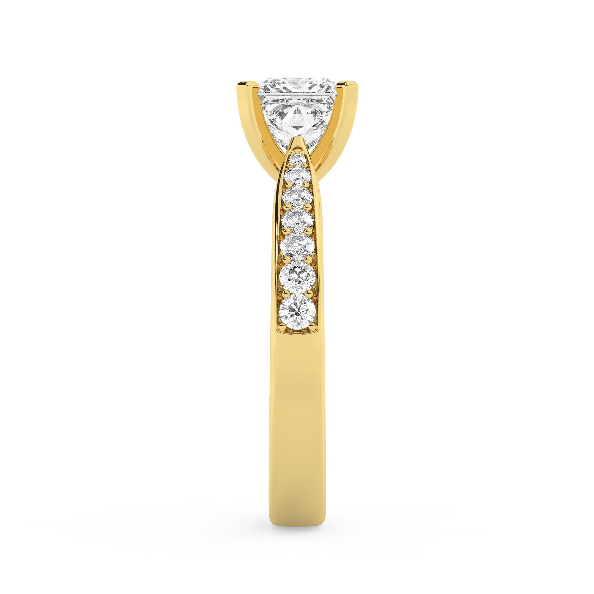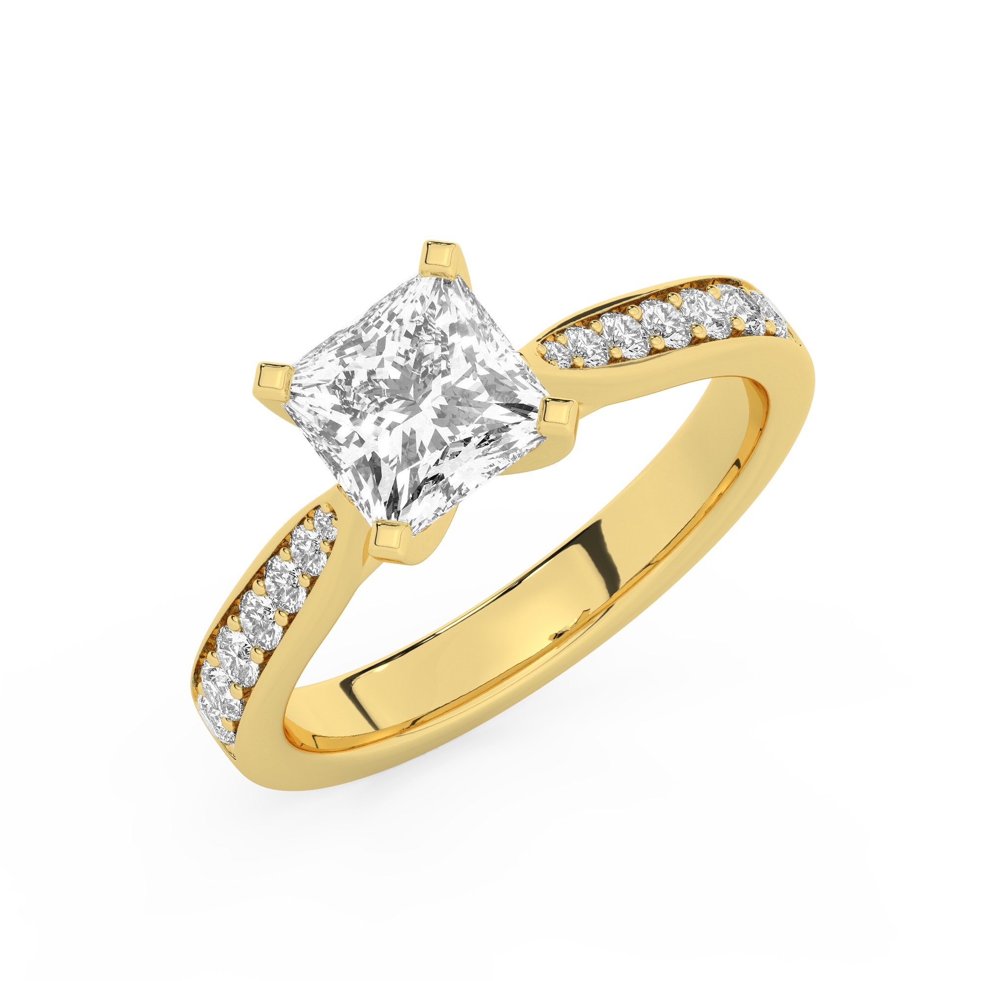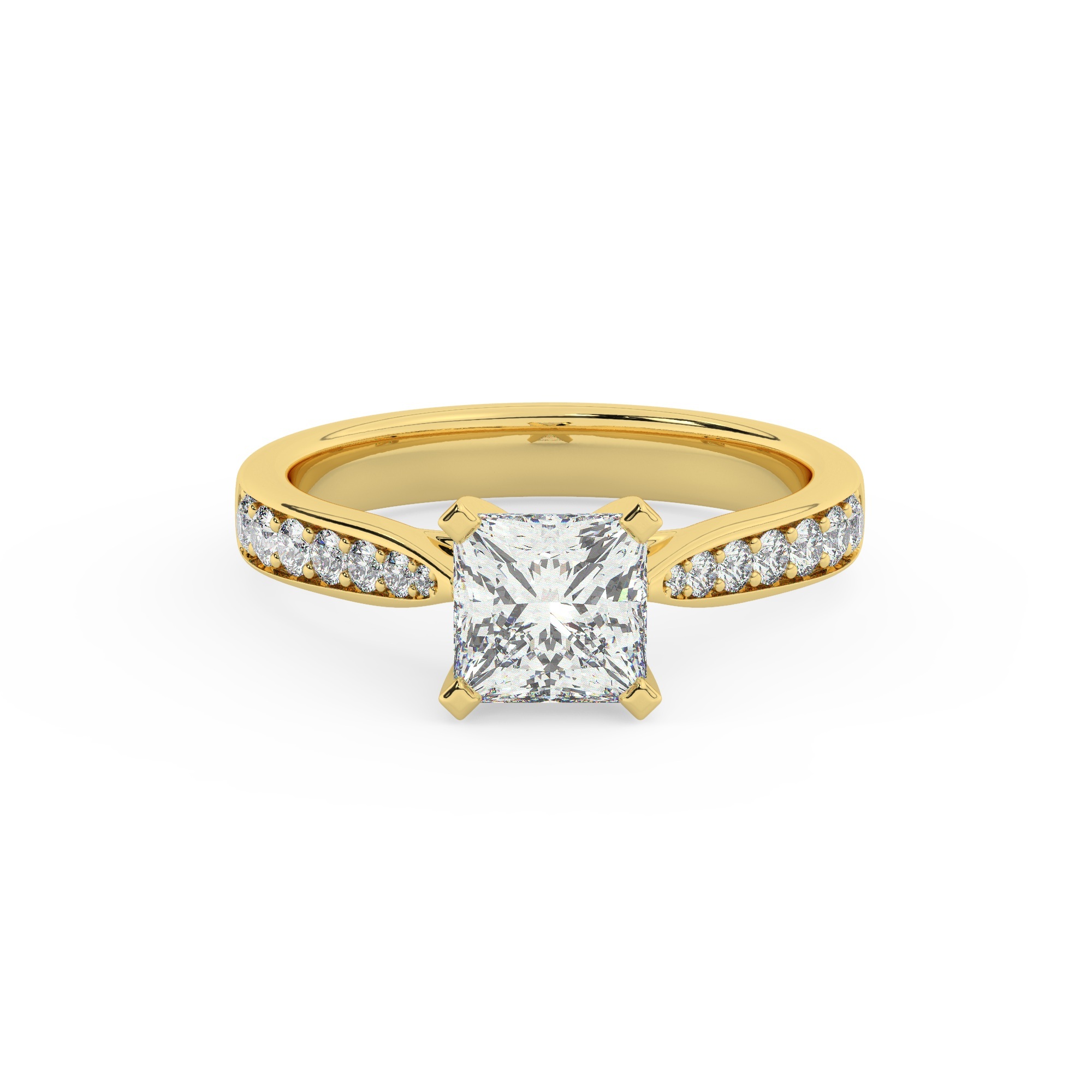 טבעת אירוסין סוליטר ויהלומים בצדדים דגם 50017 כסף מצופה זהב צהוב במרכז יהלום מעבדה 1.50 קראט בחיתוך פרינסס עם תעודה גמולוגית אירופאית IGI מסביב ובצדדים יהלומי מעבדה במשקל כולל של 0.15 קראט בחיתוך עגול