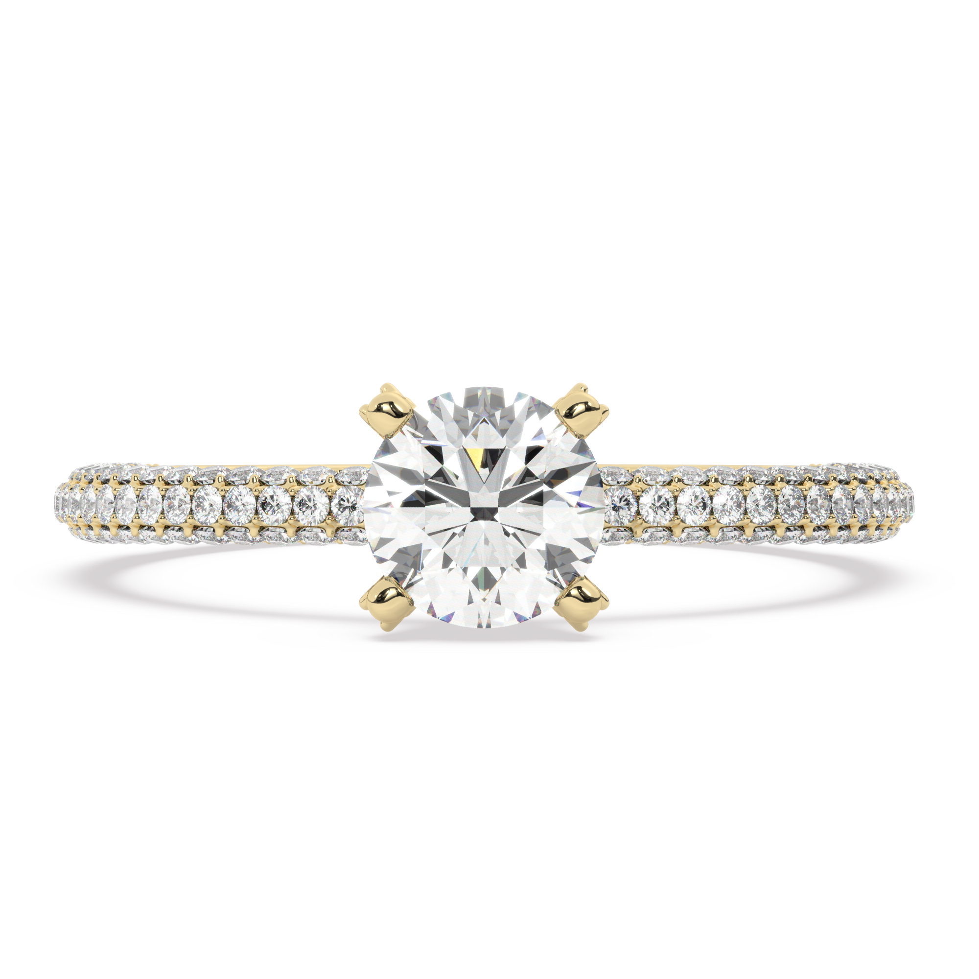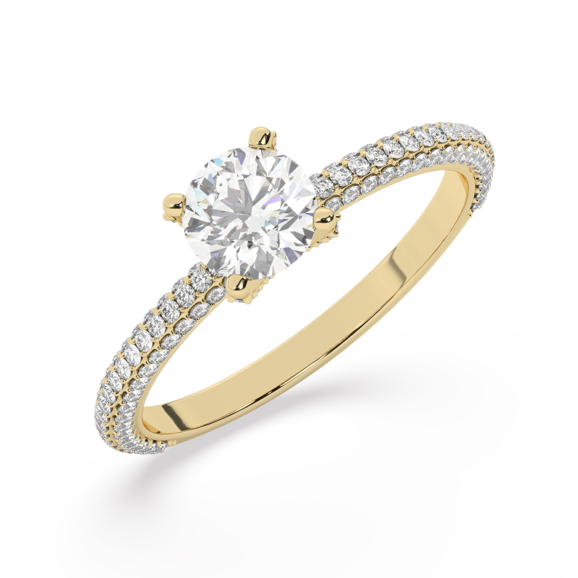 טבעת אירוסין סוליטר ויהלומים בצדדים דגם 50012 כסף מצופה זהב צהוב במרכז יהלום מעבדה 0.75 קראט בחיתוך עגול עם תעודה גמולוגית מסביב ובצדדים יהלומי מעבדה במשקל כולל של 0.40 קראט בחיתוך עגול
