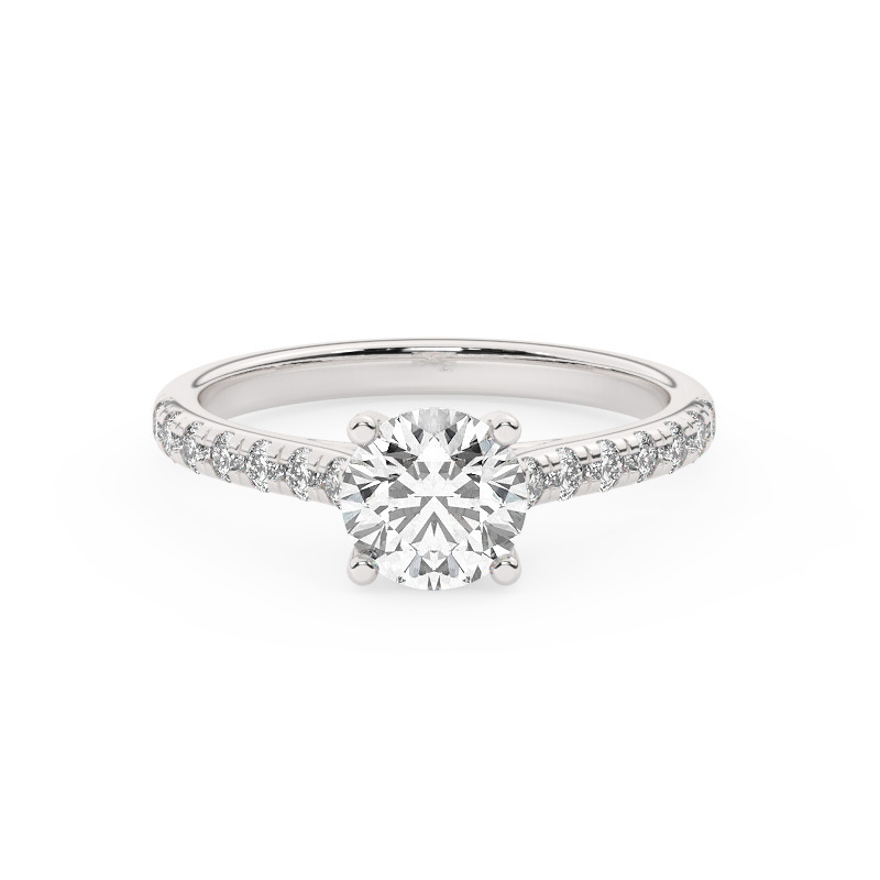 טבעת אירוסין סוליטר ויהלומים בצדדים דגם 50019 כסף מצופה זהב לבן במרכז יהלום מעבדה 1 קראט בחיתוך עגול עם תעודה גמולוגית אירופאית IGI מסביב ובצדדים יהלומי מעבדה במשקל כולל של 0.28 קראט בחיתוך עגול
