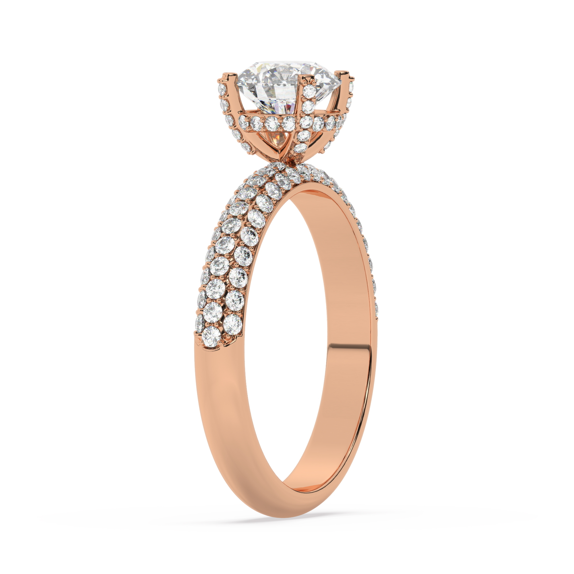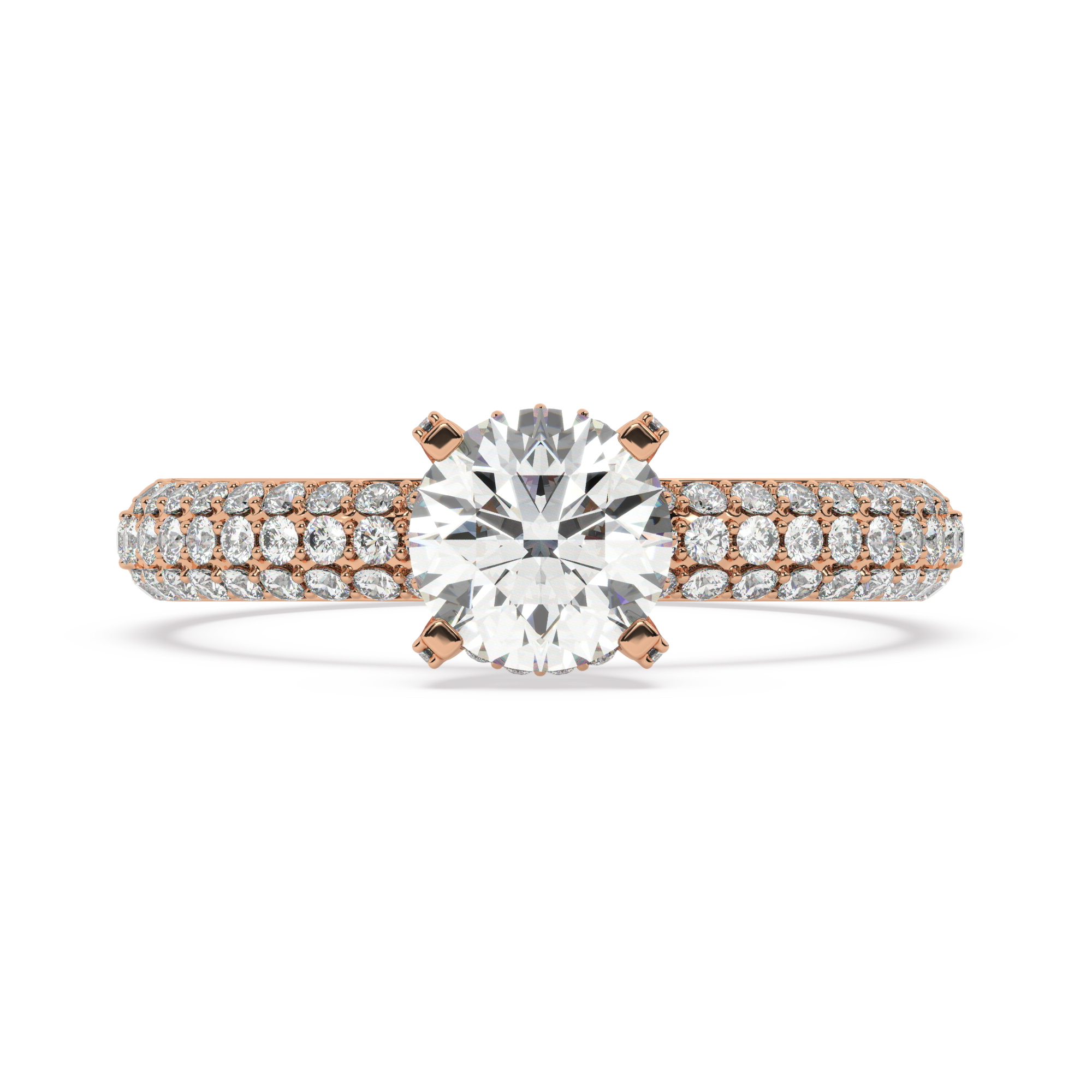 טבעת אירוסין סוליטר מרהיבה עם יהלום מרכזי עגול במשקל 1.50 קראט ו-100 יהלומי צד מבריקים. עשויה כסף מצופה בזהב אדום (רוזגולד), בעלת מראה יוקרתי ועדין כאחד. טבעת נוצצת זו מגיעה עם תעודה גמולוגית אירופאית של IGI.