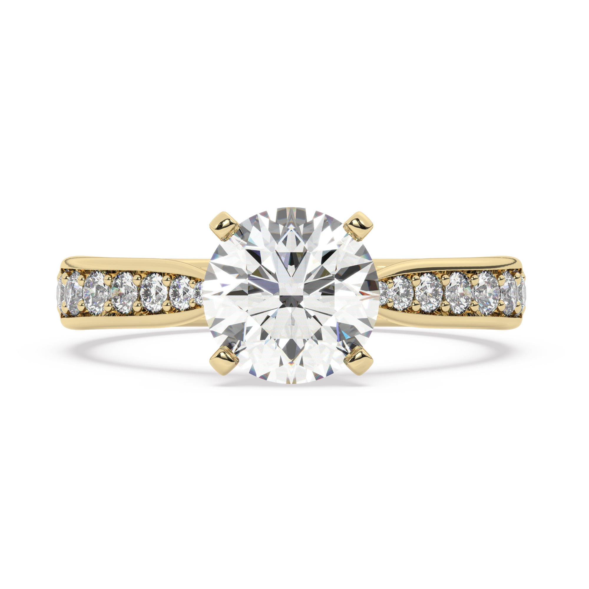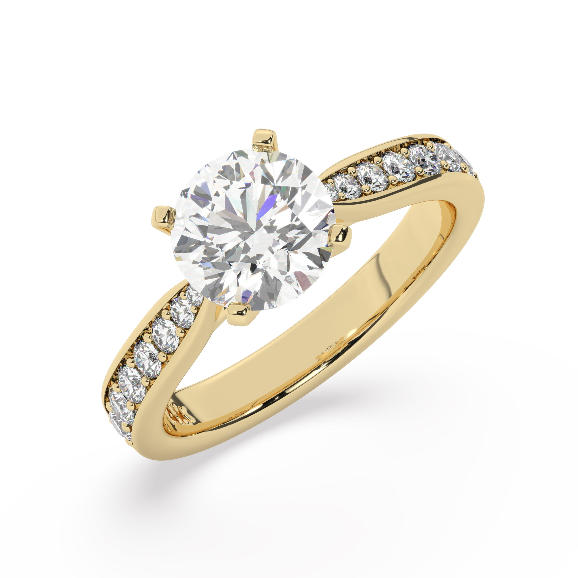 טבעת אירוסין סוליטר ויהלומים בצדדים דגם 50017 כסף מצופה זהב צהוב במרכז יהלום מעבדה 1.50 קראט בחיתוך עגול עם תעודה גמולוגית אירופאית IGI מסביב ובצדדים יהלומי מעבדה במשקל כולל של 0.15 קראט בחיתוך עגול
