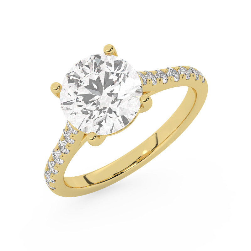טבעת אירוסין סוליטר ויהלומים בצדדים דגם 50019 כסף מצופה זהב צהוב במרכז יהלום מעבדה 2.50 קראט בחיתוך עגול עם תעודה גמולוגית אירופאית IGI מסביב ובצדדים יהלומי מעבדה במשקל כולל של 0.28 קראט בחיתוך עגול