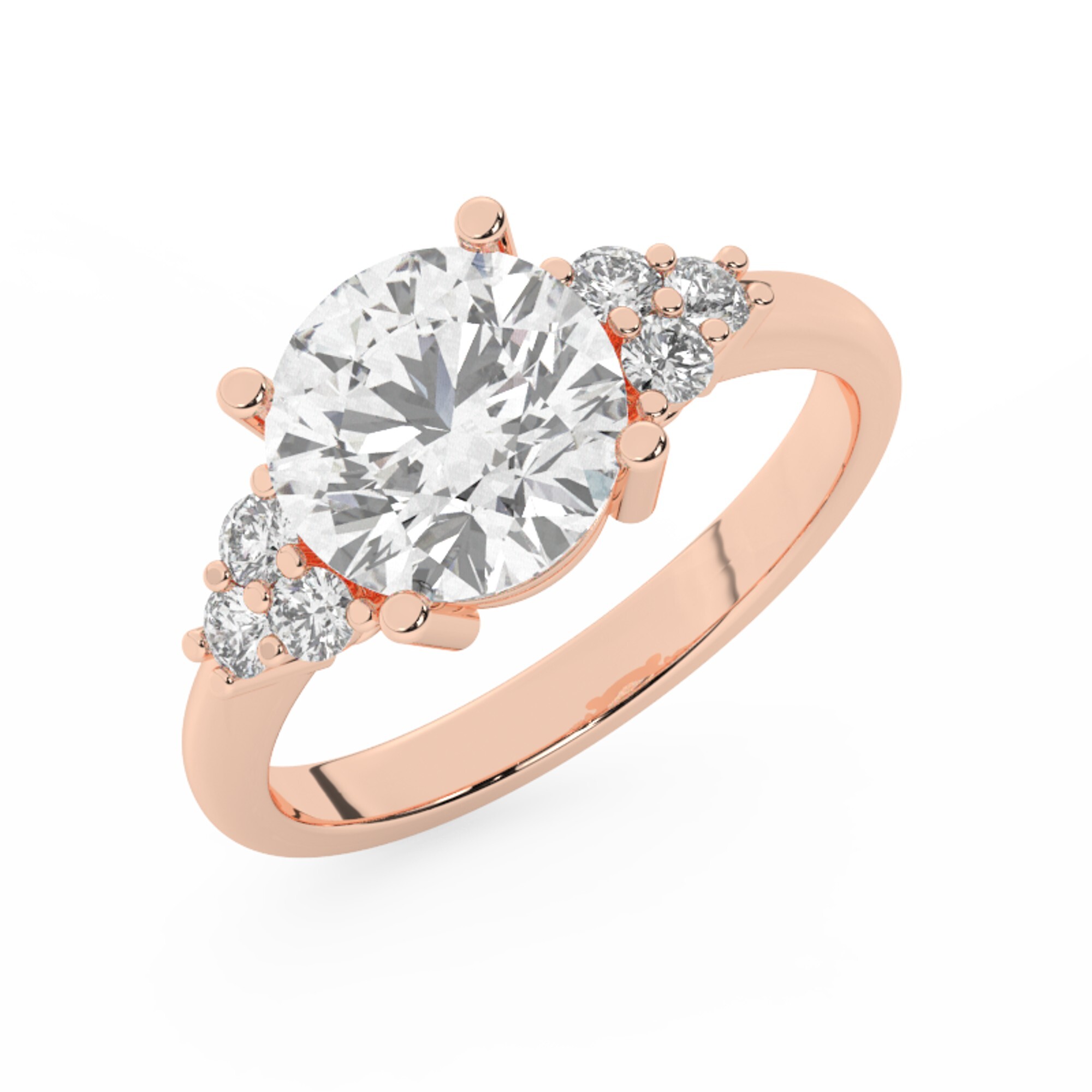 טבעת אירוסין סוליטר ויהלומים בצדדים דגם 50041 כסף מצופה זהב אדום רוזגולד במרכז יהלום מעבדה 3 קראט בחיתוך עגול עם תעודה גמולוגית אירופאית IGI מסביב ובצדדים יהלומי מעבדה במשקל כולל של 0.30 קראט בחיתוך עגול