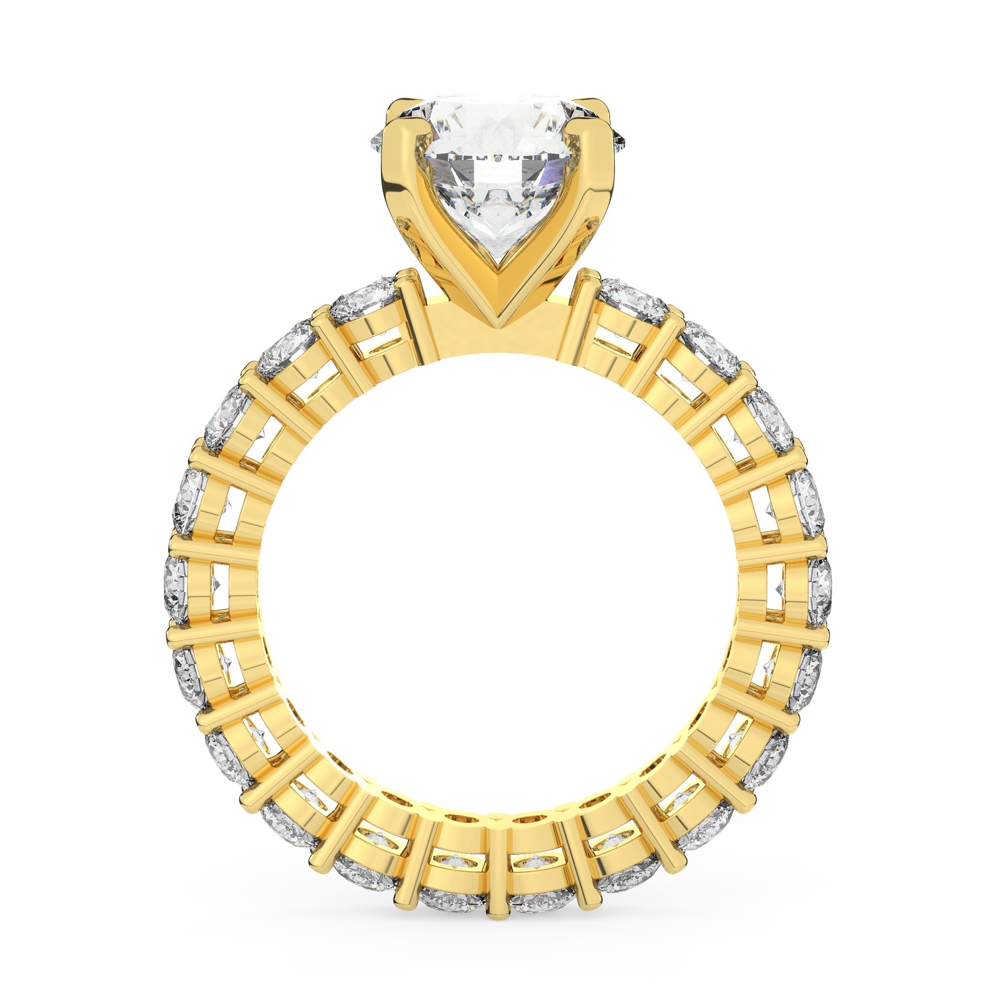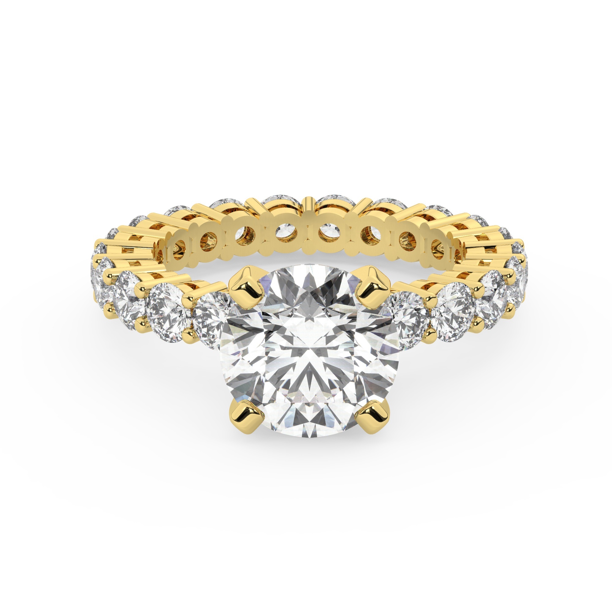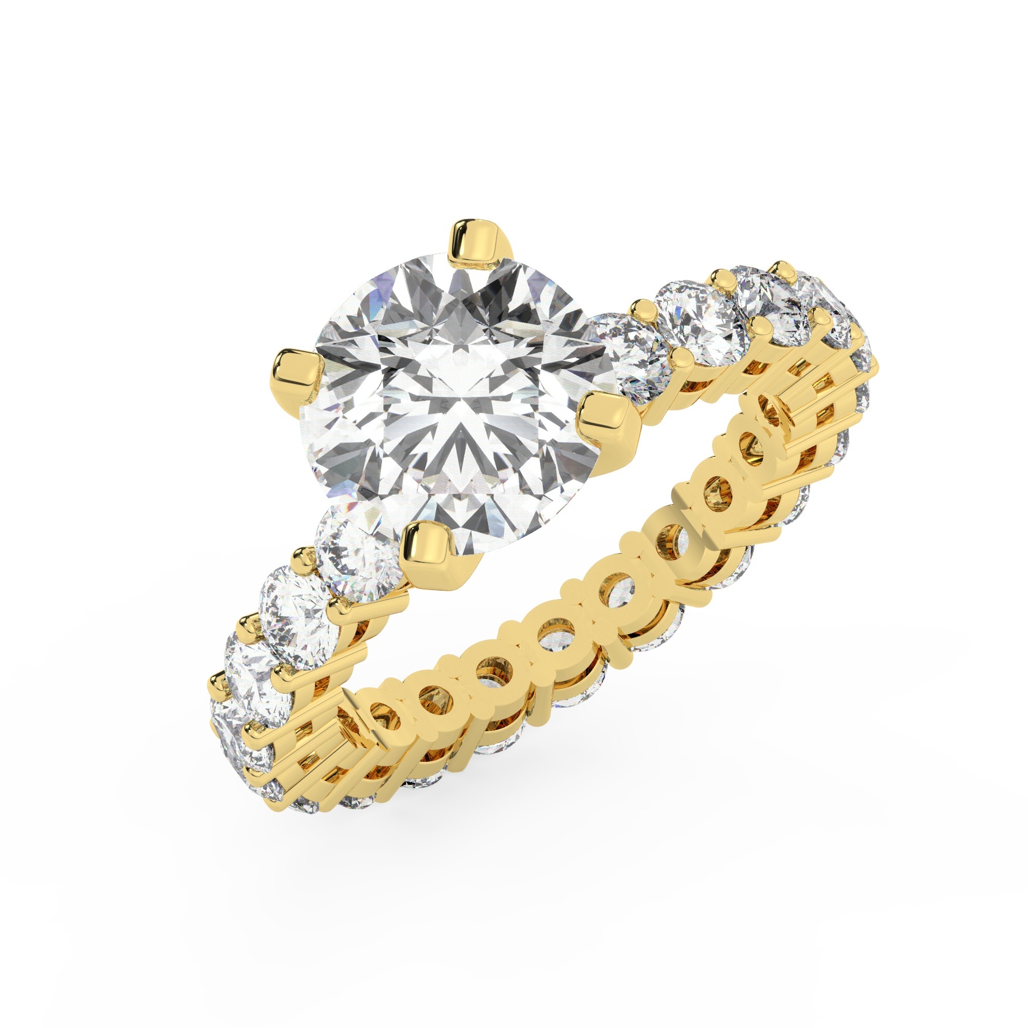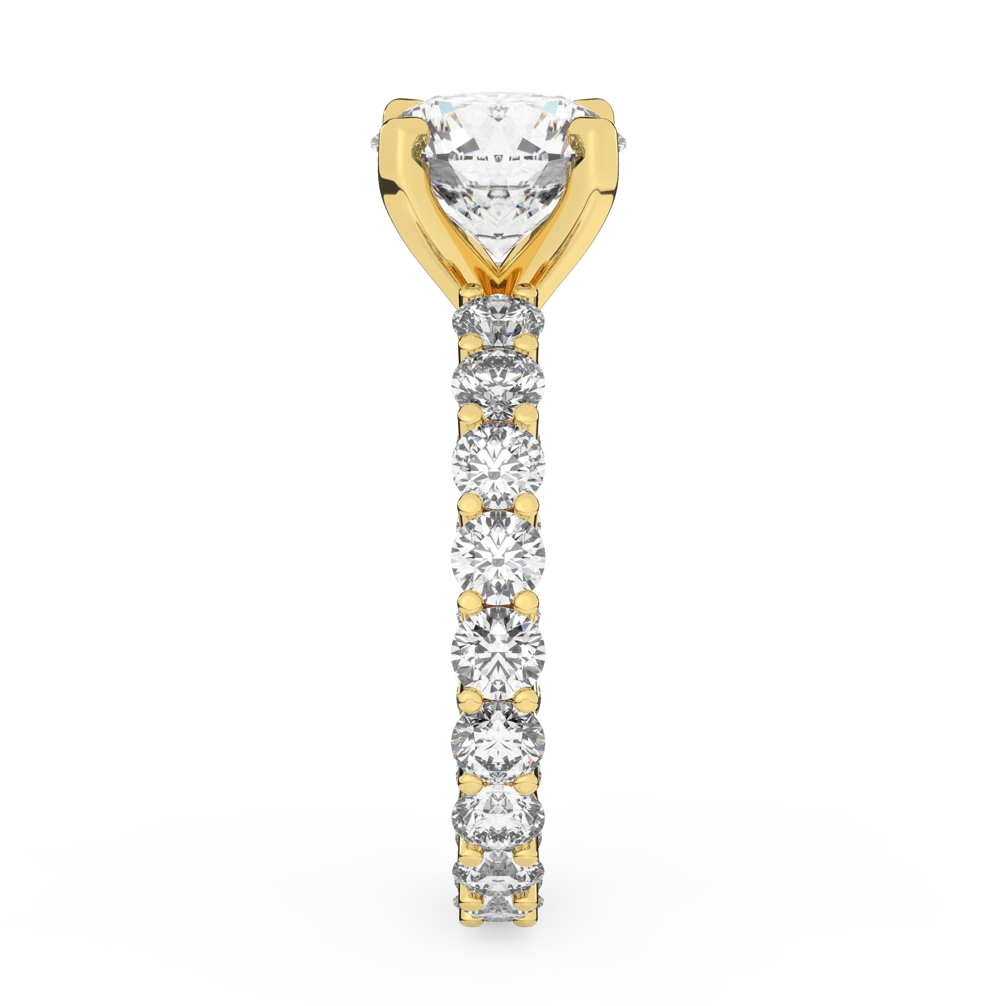 טבעת אירוסין סוליטר ויהלומים בצדדים איטרנטיני דגם 50044 כסף מצופה זהב צהוב במרכז יהלום מעבדה 3 קראט בחיתוך עגול עם תעודה גמולוגית אירופאית IGI מסביב ובצדדים יהלומי מעבדה במשקל כולל של 1.80 קראט בחיתוך עגול