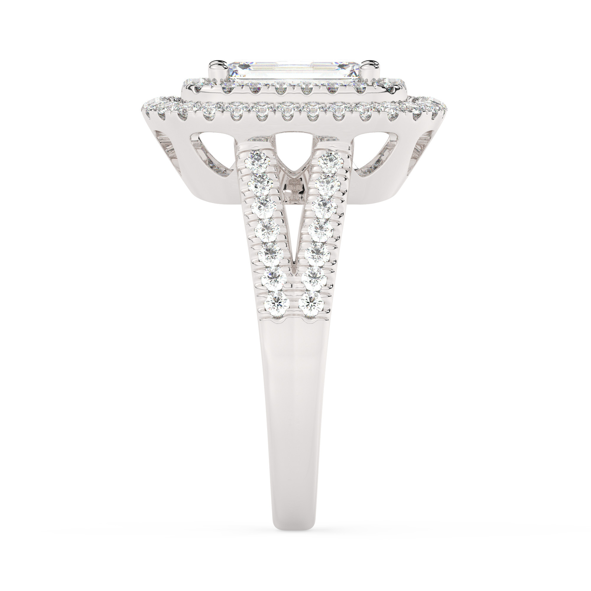 טבעת אירוסין היילו דגם 50025 כסף מצופה זהב לבן במרכז אבן מעבדה מוסונייט 0.75 קראט בחיתוך אמרלד עם תעודה גמולוגית מסביב ובצדדים אבני מעבדה מוסונייט במשקל כולל של 0.62 קראט בחיתוך עגול