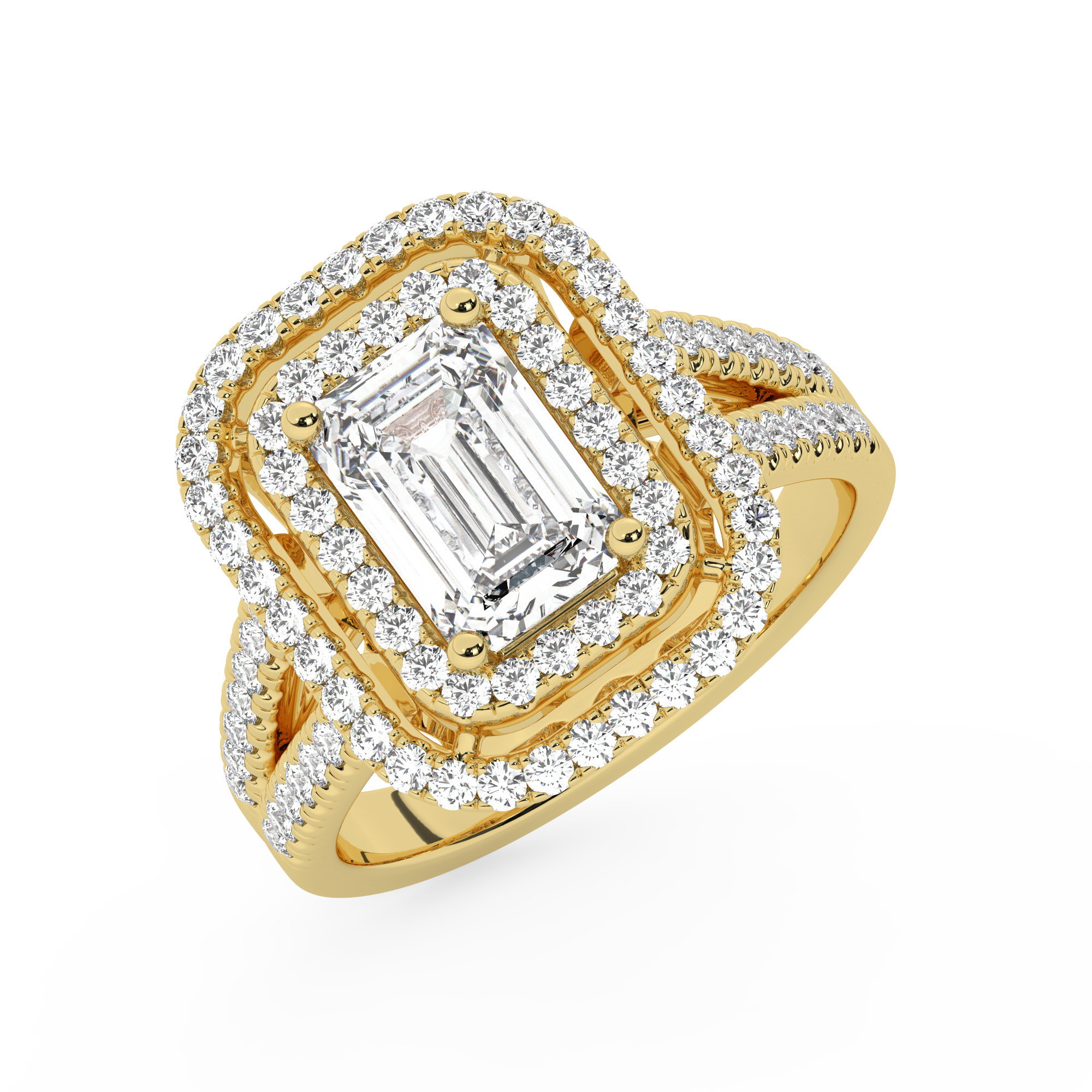 טבעת אירוסין היילו דגם 50025 זהב צהוב 14 קראט במרכז אבן מעבדה מוסונייט 1 קראט בחיתוך אמרלד עם תעודה גמולוגית בינלאומית GRA מסביב ובצדדים אבני מעבדה מוסונייט במשקל כולל של 0.62 קראט בחיתוך עגול