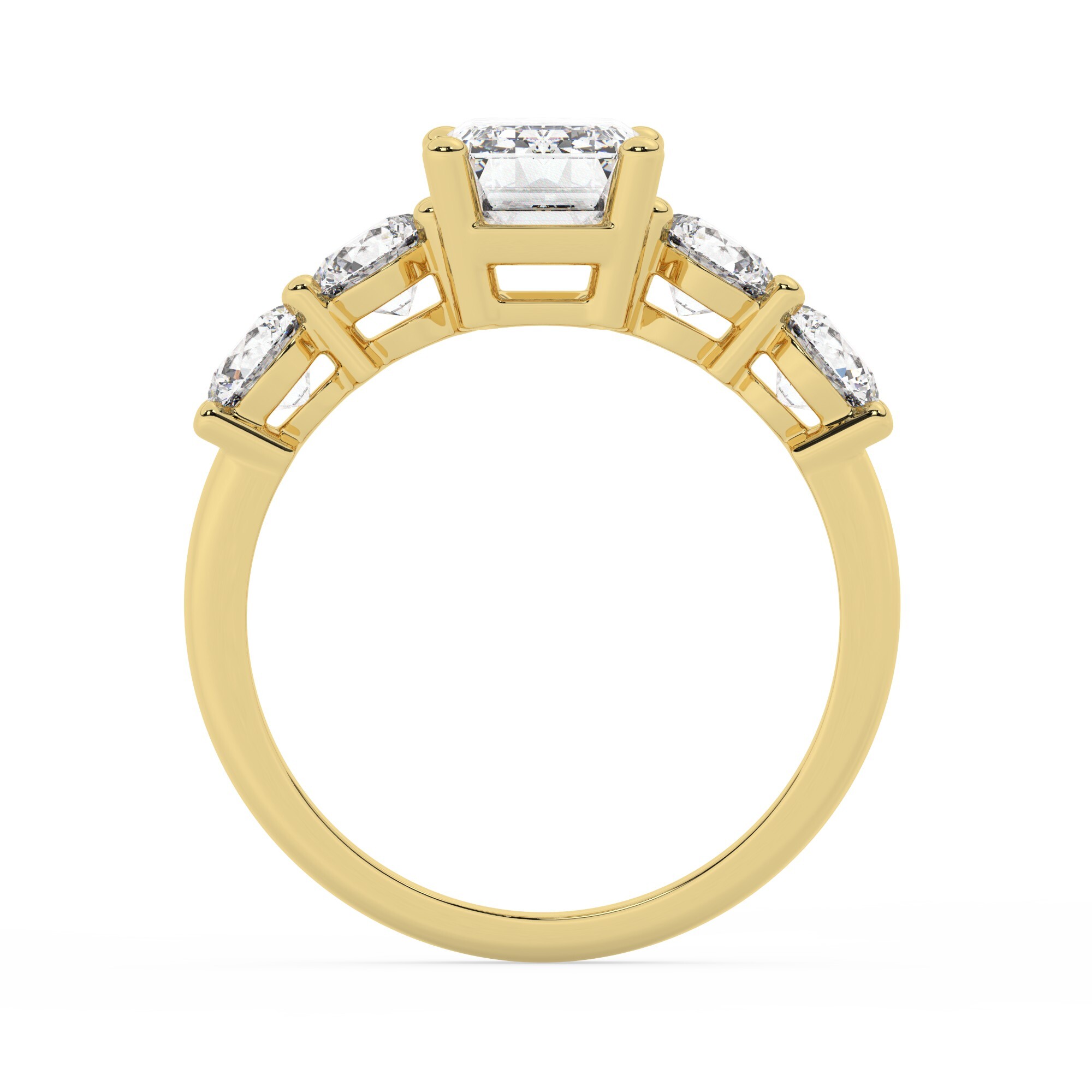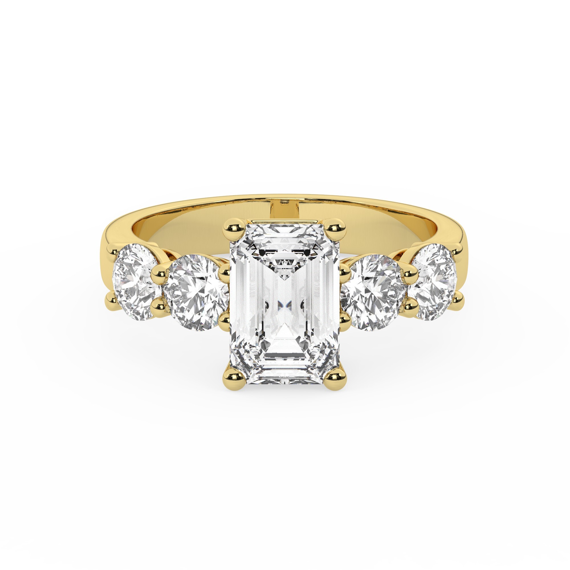 טבעת אירוסין סוליטר ומוסונייט בצדדים דגם 50030 זהב צהוב 14 קראט במרכז אבן מעבדה מוסונייט 1 קראט בחיתוך אמרלד עם תעודה גמולוגית בינלאומית GRA מסביב ובצדדים אבני מעבדה מוסונייט במשקל כולל של 1.08 קראט בחיתוך עגול