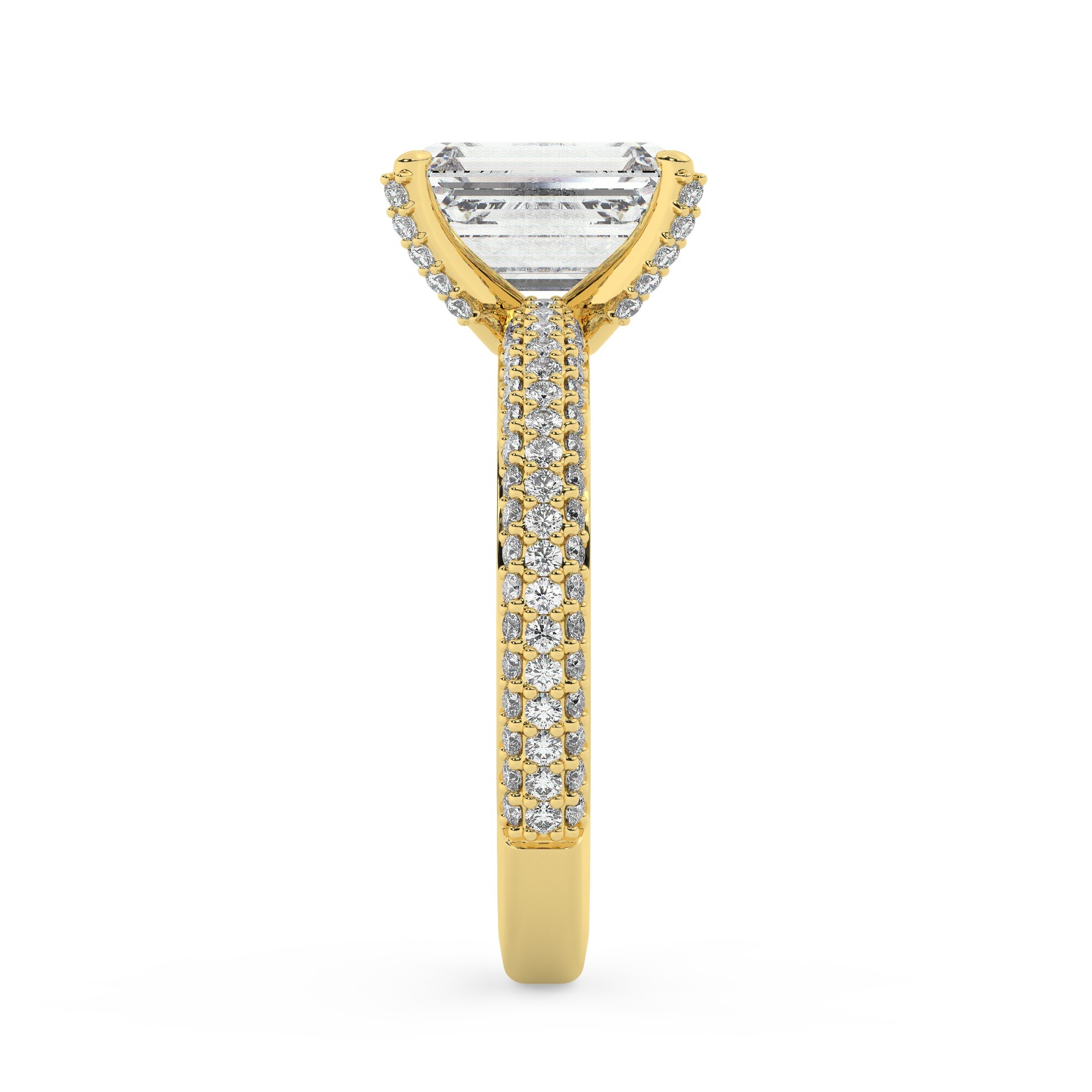 טבעת אירוסין סוליטר ויהלומים בצדדים דגם 50012 כסף מצופה זהב צהוב במרכז אבן מעבדה מוסונייט 1 קראט בחיתוך אמרלד עם תעודה גמולוגית בינלאומית GRA מסביב ובצדדים אבני מעבדה מוסונייט במשקל כולל של 0.40 קראט בחיתוך עגול