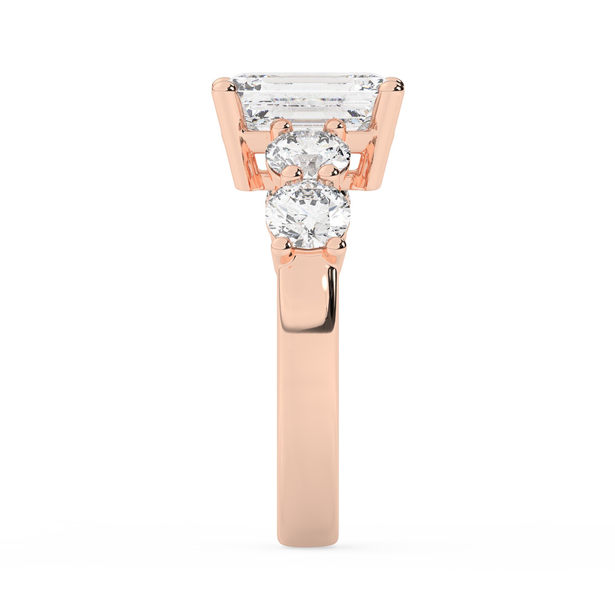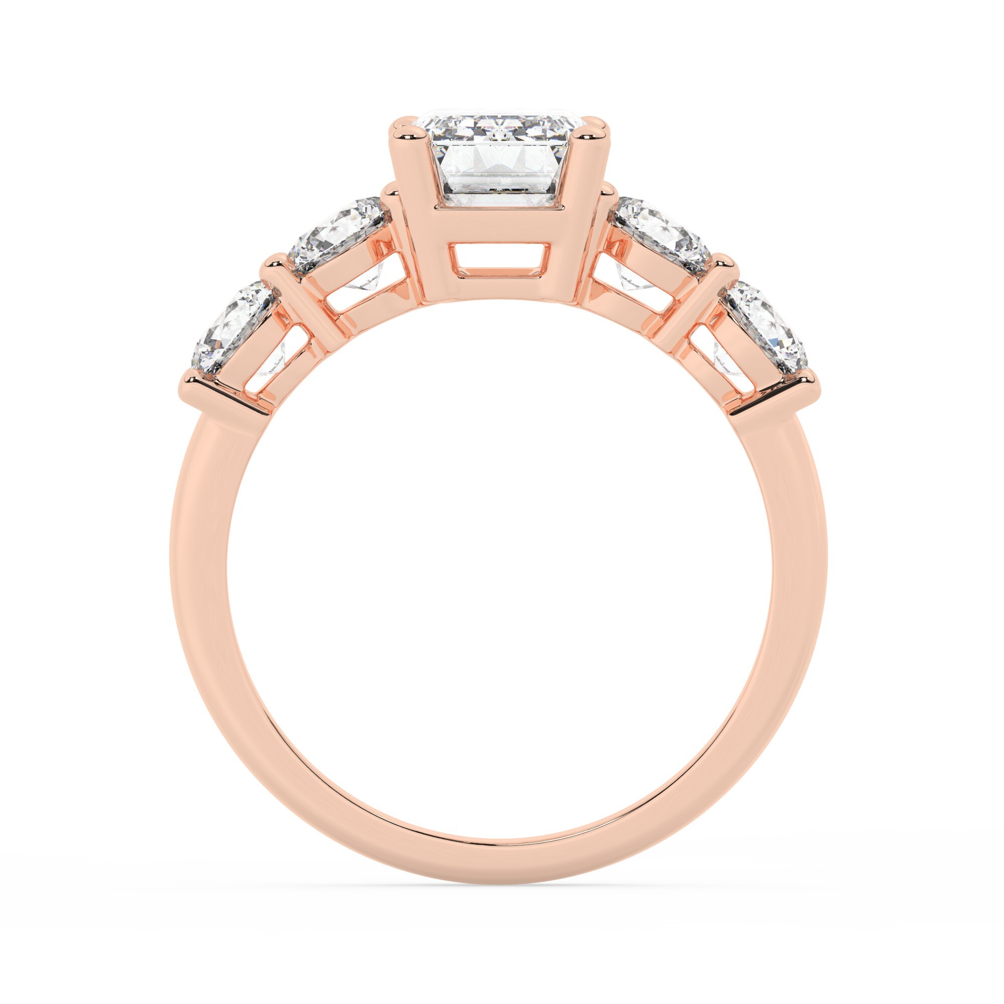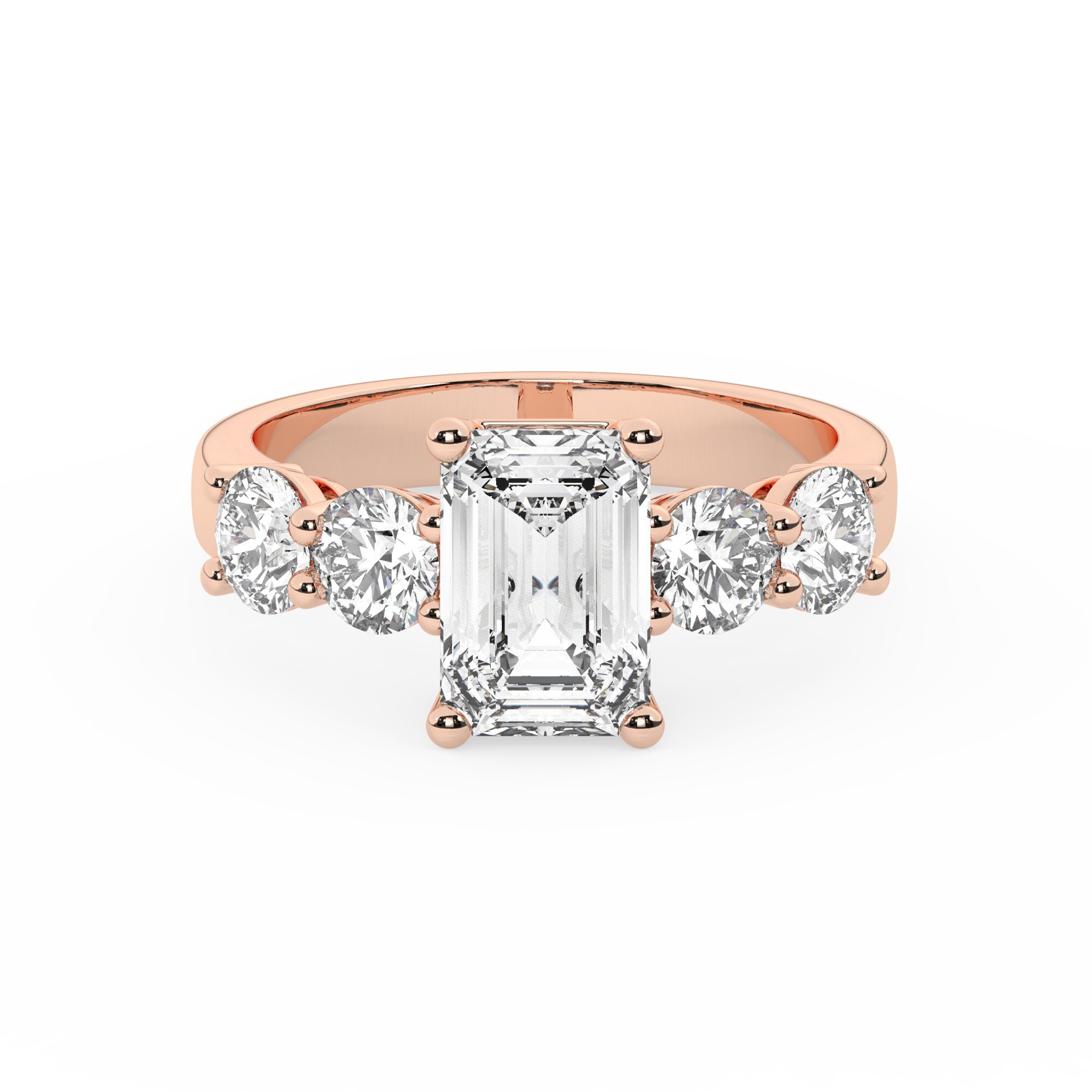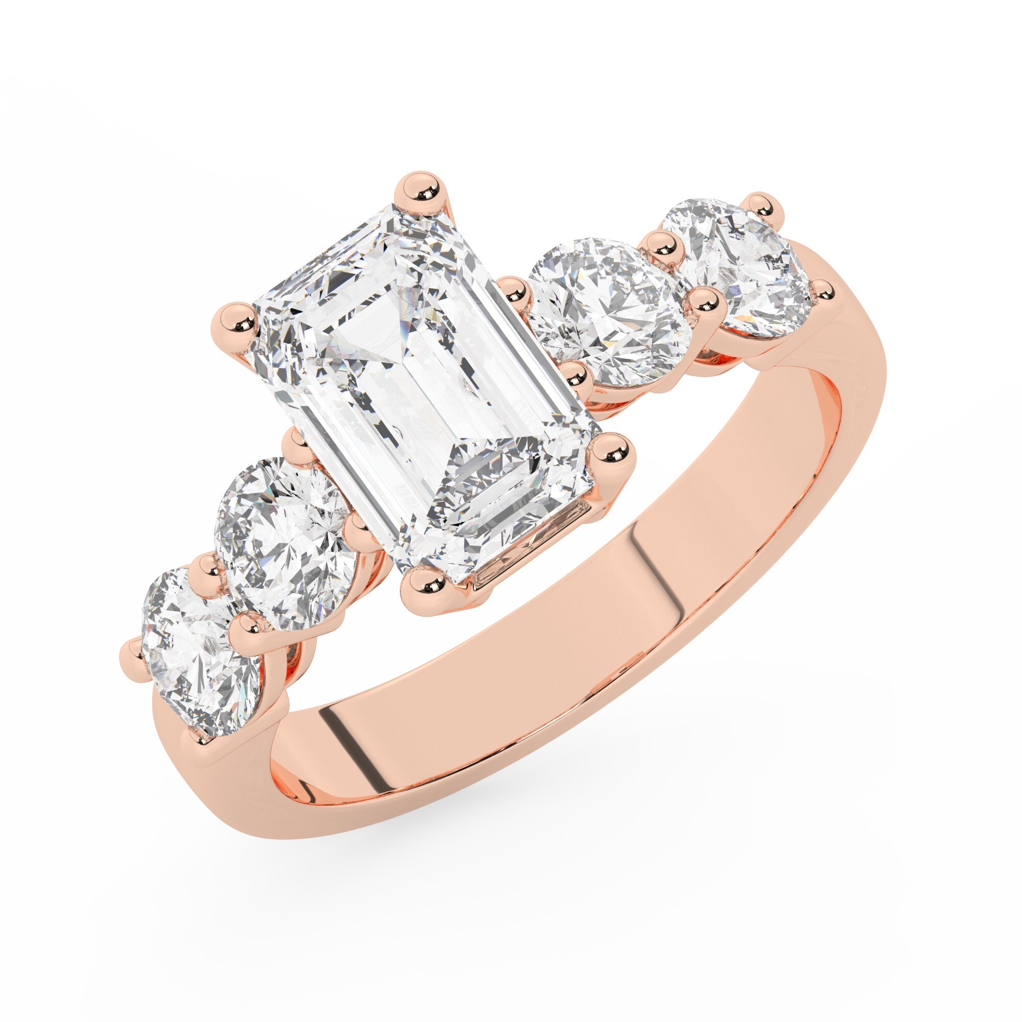 טבעת אירוסין סוליטר ומוסונייט בצדדים דגם 50030 כסף מצופה זהב אדום רוזגולד במרכז אבן מעבדה מוסונייט 1.50 קראט בחיתוך אמרלד עם תעודה גמולוגית בינלאומית GRA מסביב ובצדדים אבני מעבדה מוסונייט במשקל כולל של 1.08 קראט בחיתוך עגול