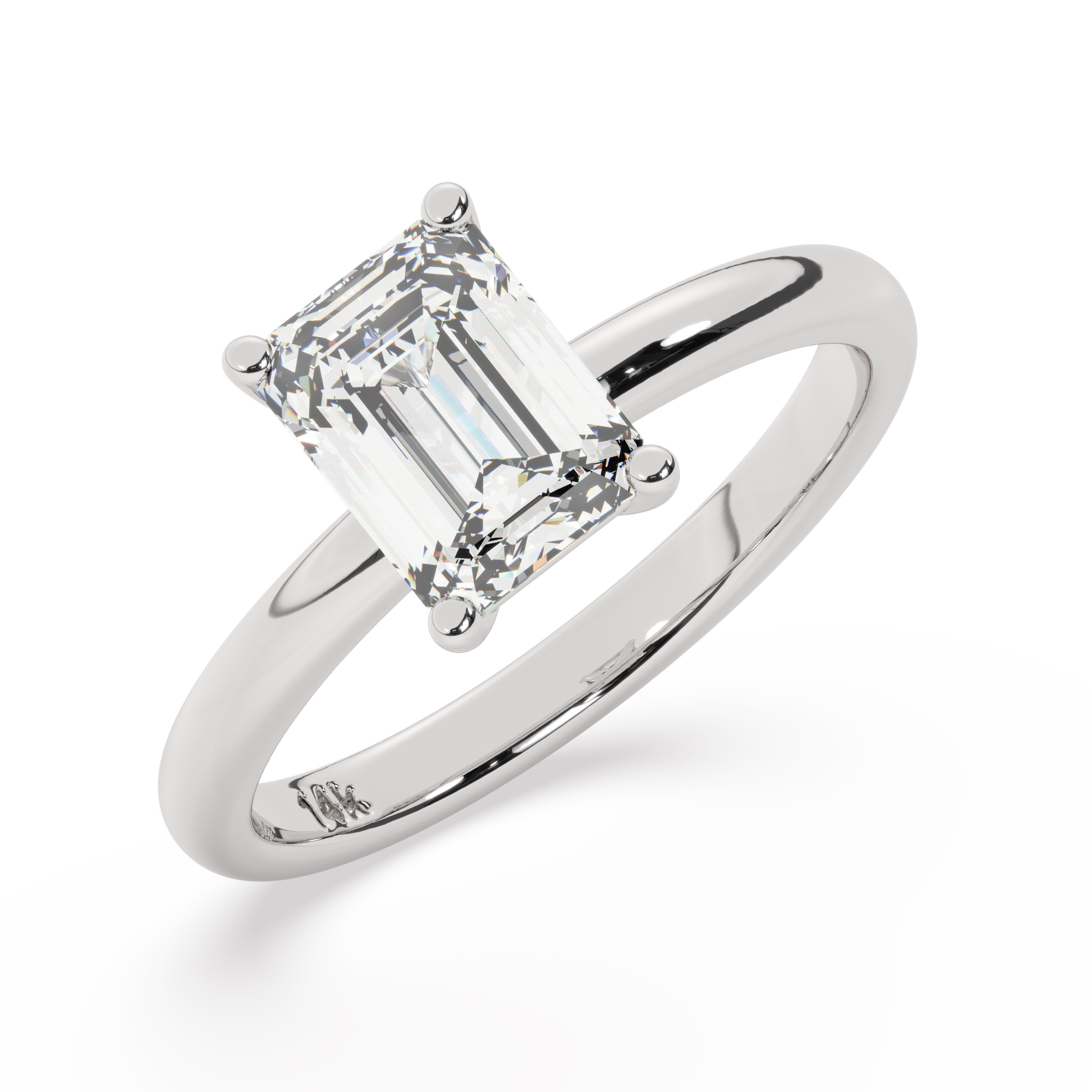 טבעת אירוסין סוליטר דגם 50016 זהב לבן 14 קראט במרכז אבן מעבדה מוסונייט במשקל כולל של 2 קראט בחיתוך אמרלד עם תעודה גמולוגית בינלאומית GRA