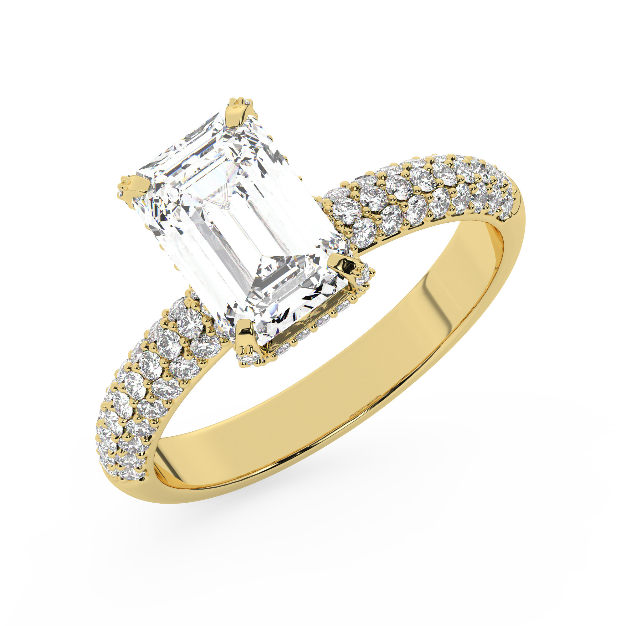 טבעת אירוסין סוליטר ומוסונייט בצדדים דגם 50014 זהב צהוב 14 קראט במרכז אבן מעבדה מוסונייט 2 קראט בחיתוך אמרלד עם תעודה גמולוגית בינלאומית GRA מסביב ובצדדים אבני מעבדה מוסונייט במשקל כולל של 0.50 קראט בחיתוך עגול