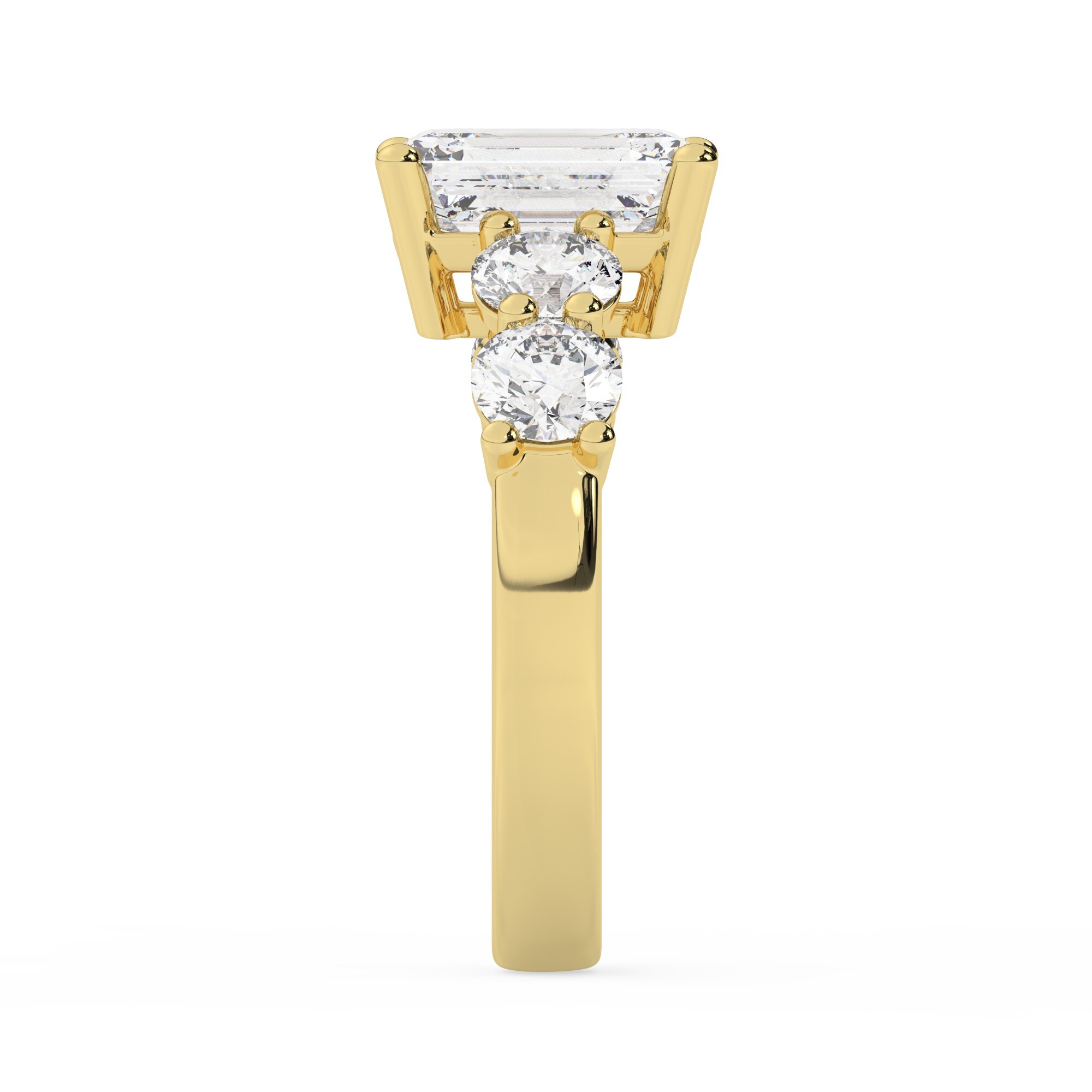 טבעת אירוסין סוליטר ומוסונייט בצדדים דגם 50030 זהב צהוב 14 קראט במרכז אבן מעבדה מוסונייט 2.50 קראט בחיתוך אמרלד עם תעודה גמולוגית בינלאומית GRA מסביב ובצדדים אבני מעבדה מוסונייט במשקל כולל של 1.08 קראט בחיתוך עגול