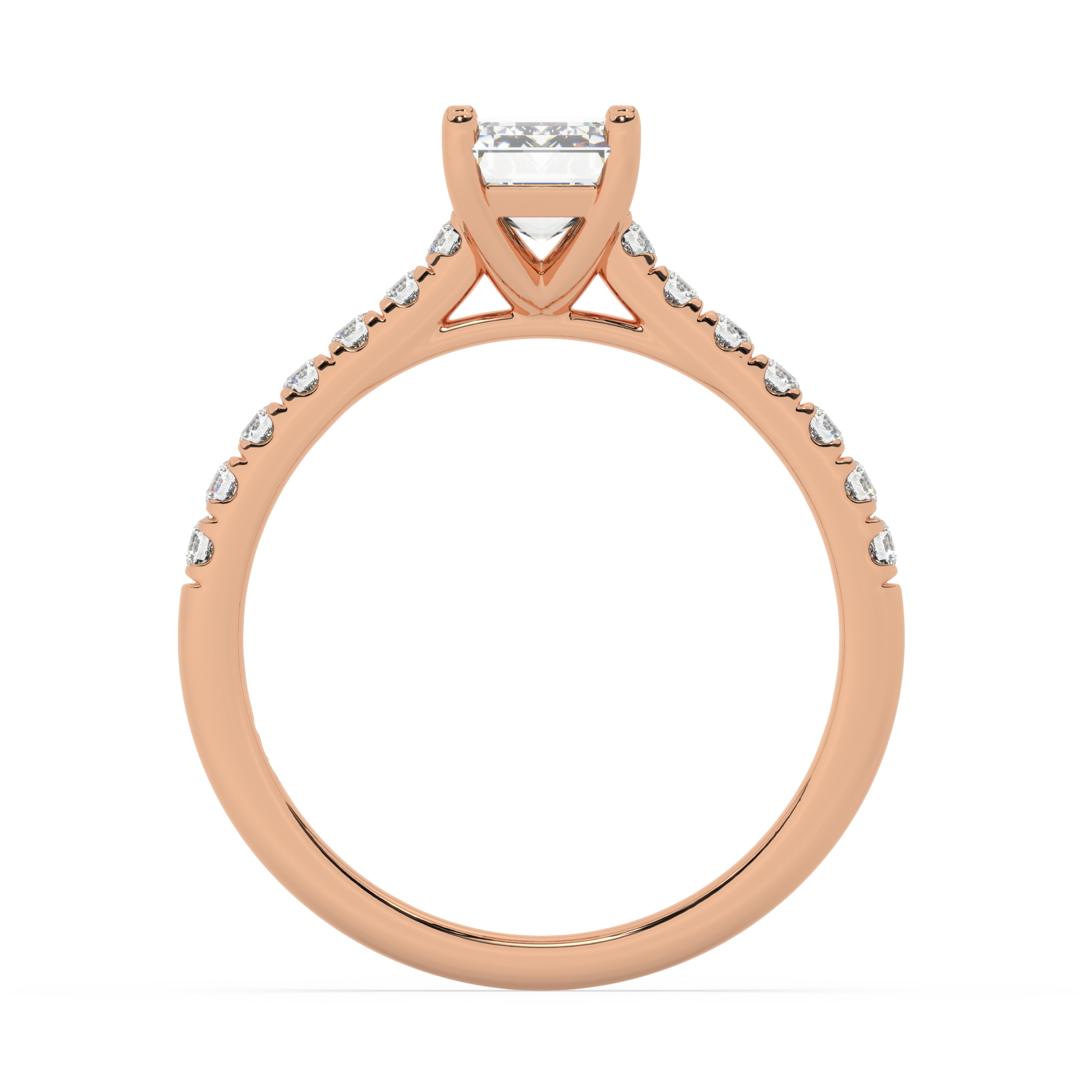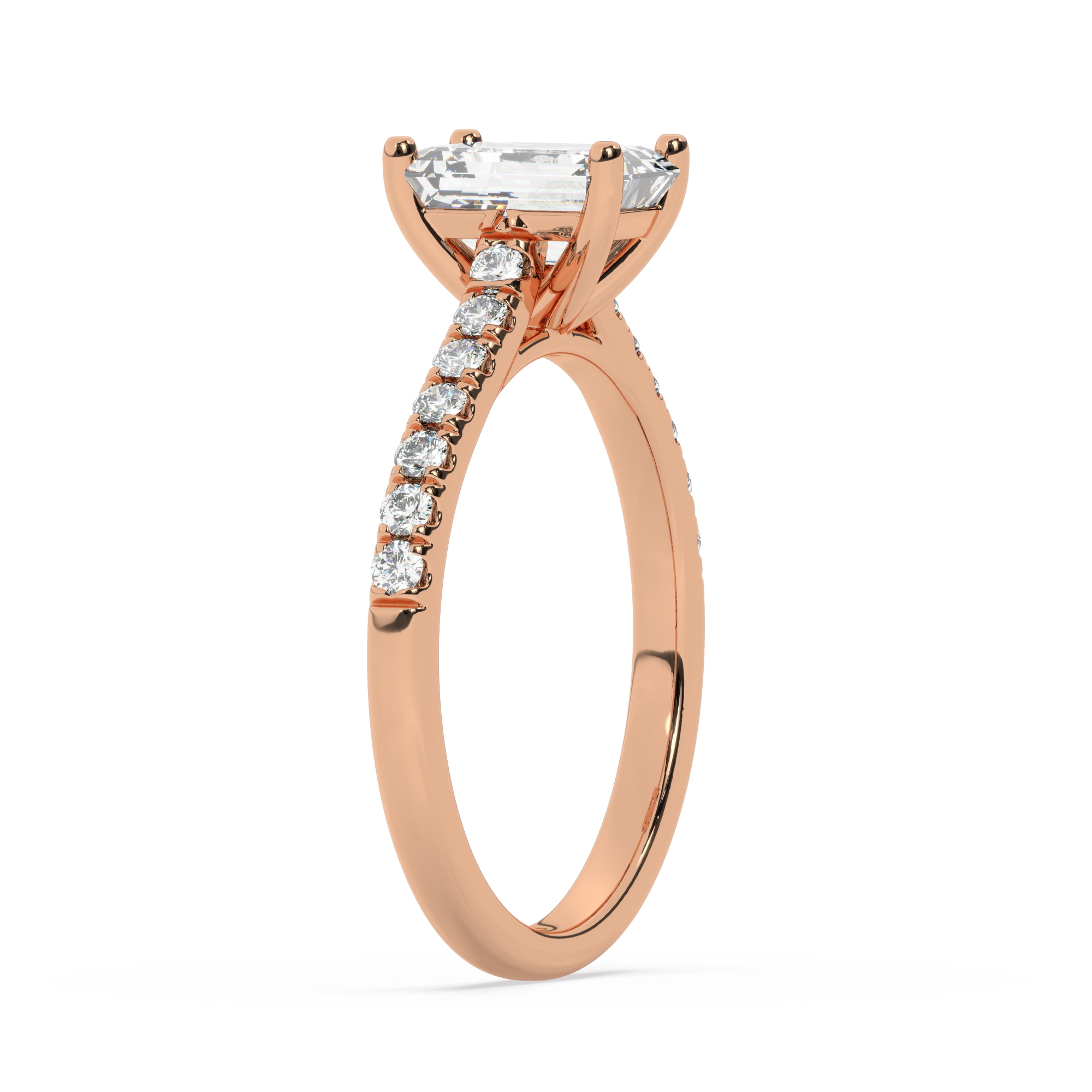 טבעת אירוסין סוליטר ויהלומים בצדדים דגם 50019 כסף מצופה זהב אדום רוזגולד במרכז אבן מעבדה מוסונייט 4 קראט בחיתוך אמרלד עם תעודה גמולוגית בינלאומית GRA מסביב ובצדדים אבני מעבדה מוסונייט במשקל כולל של 0.28 קראט בחיתוך עגול