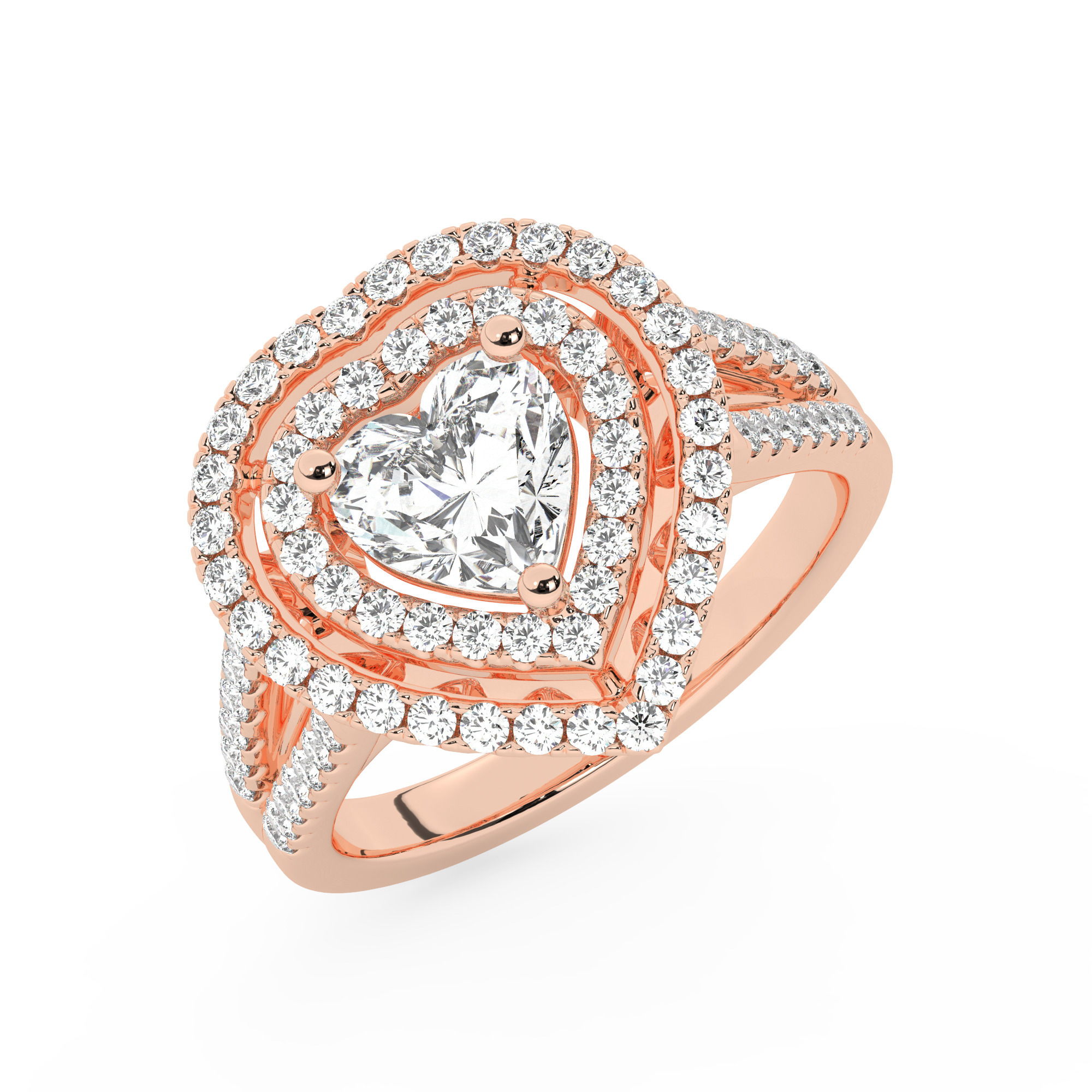 טבעת אירוסין היילו דגם 50025 כסף מצופה זהב אדום רוזגולד במרכז אבן מעבדה מוסונייט 0.50 קראט בחיתוך לב עם תעודה גמולוגית מסביב ובצדדים אבני מעבדה מוסונייט במשקל כולל של 0.62 קראט בחיתוך עגול