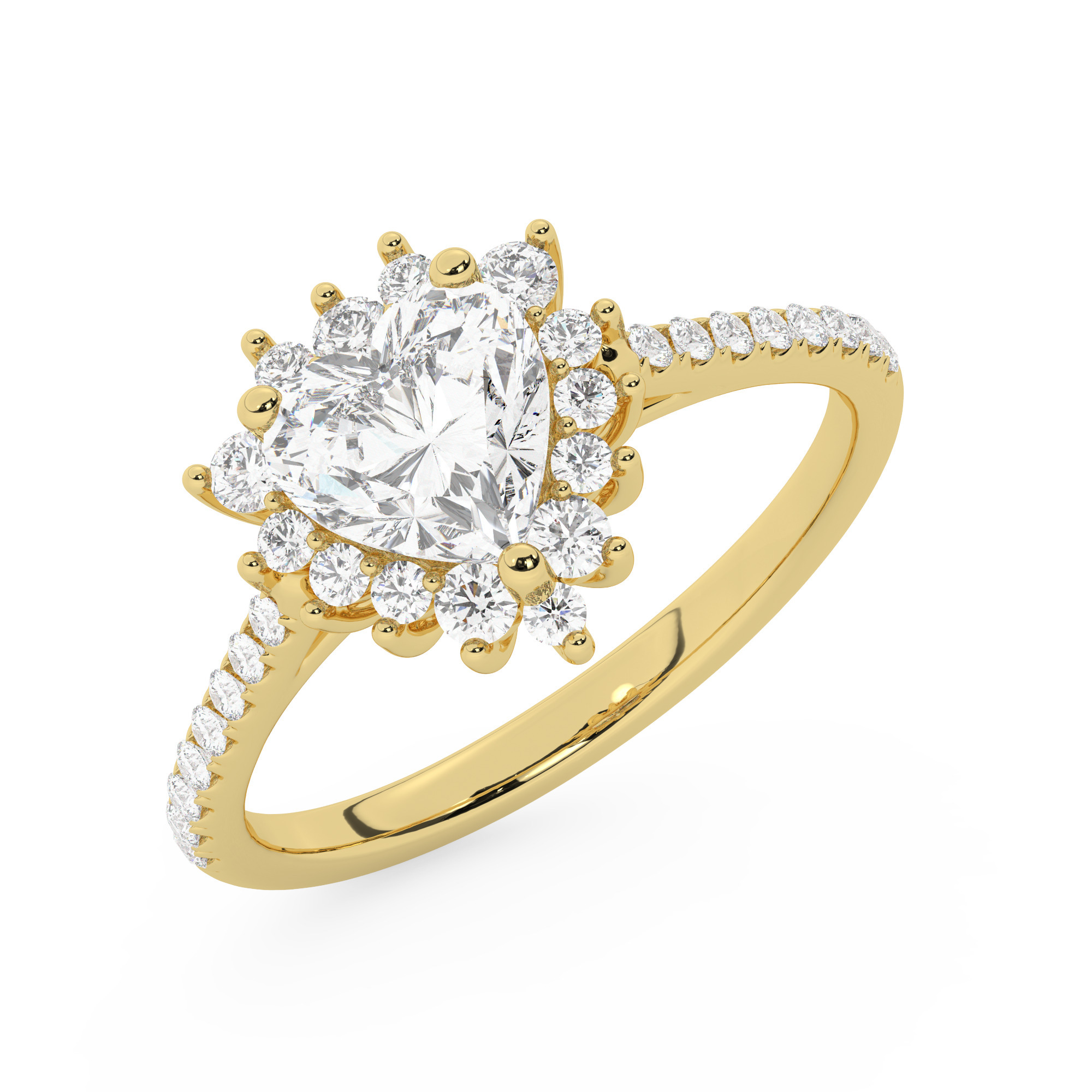 טבעת אירוסין היילו דגם 50024 כסף מצופה זהב צהוב במרכז אבן מעבדה מוסונייט 0.50 קראט בחיתוך לב עם תעודה גמולוגית מסביב ובצדדים אבני מעבדה מוסונייט במשקל כולל של 0.39 קראט בחיתוך עגול