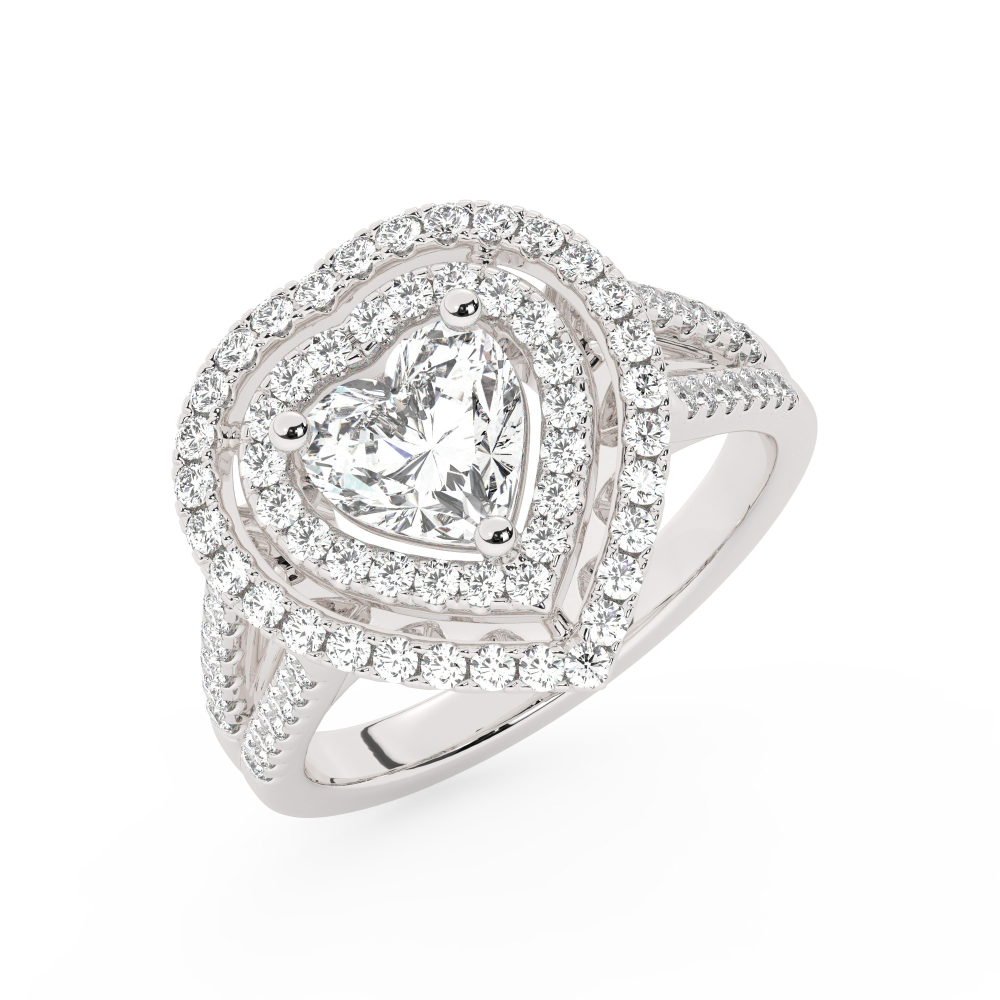 טבעת אירוסין היילו דגם 50025 כסף מצופה זהב לבן במרכז אבן מעבדה מוסונייט 1 קראט בחיתוך לב עם תעודה גמולוגית בינלאומית GRA מסביב ובצדדים אבני מעבדה מוסונייט במשקל כולל של 0.62 קראט בחיתוך עגול