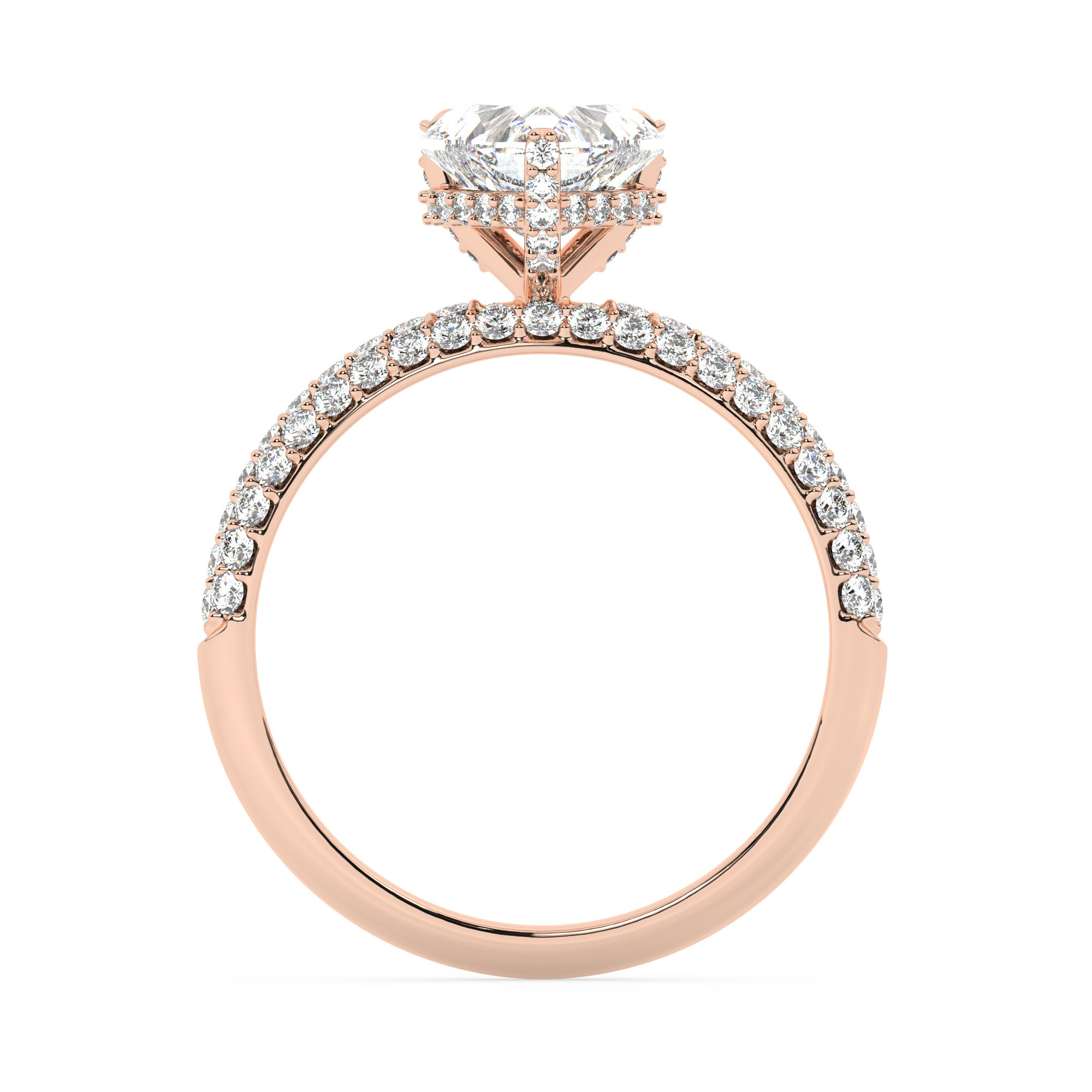 טבעת אירוסין יוקרתית בסגנון סוליטר, משובצת באבן לב מוסונייט מבריקה במשקל 2.50 קראט, מוקפת ב-100 יהלומים צדדים, עשויה כסף מצופה זהב אדום רוזגולד לקבלת מראה רומנטי ואלגנטי במיוחד.