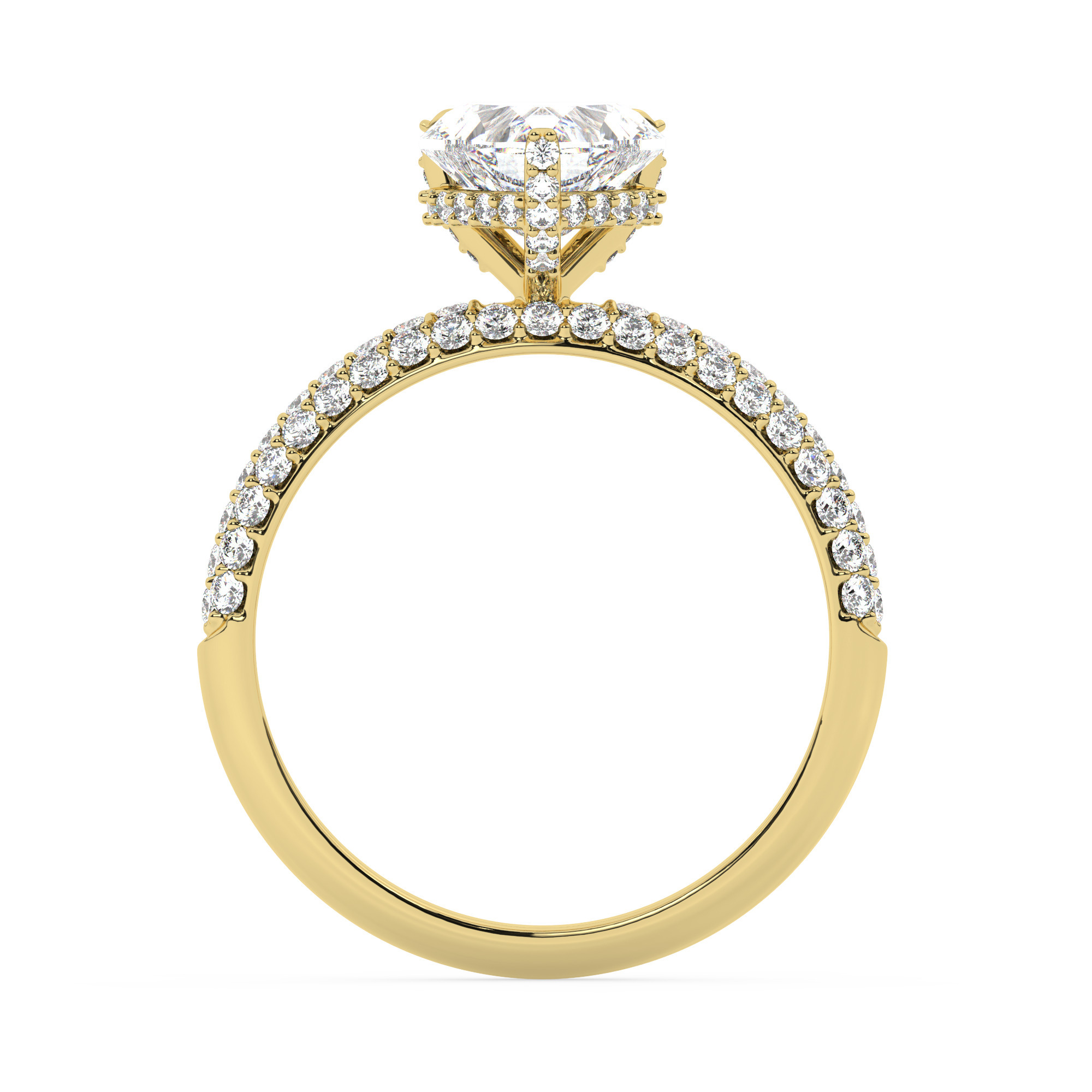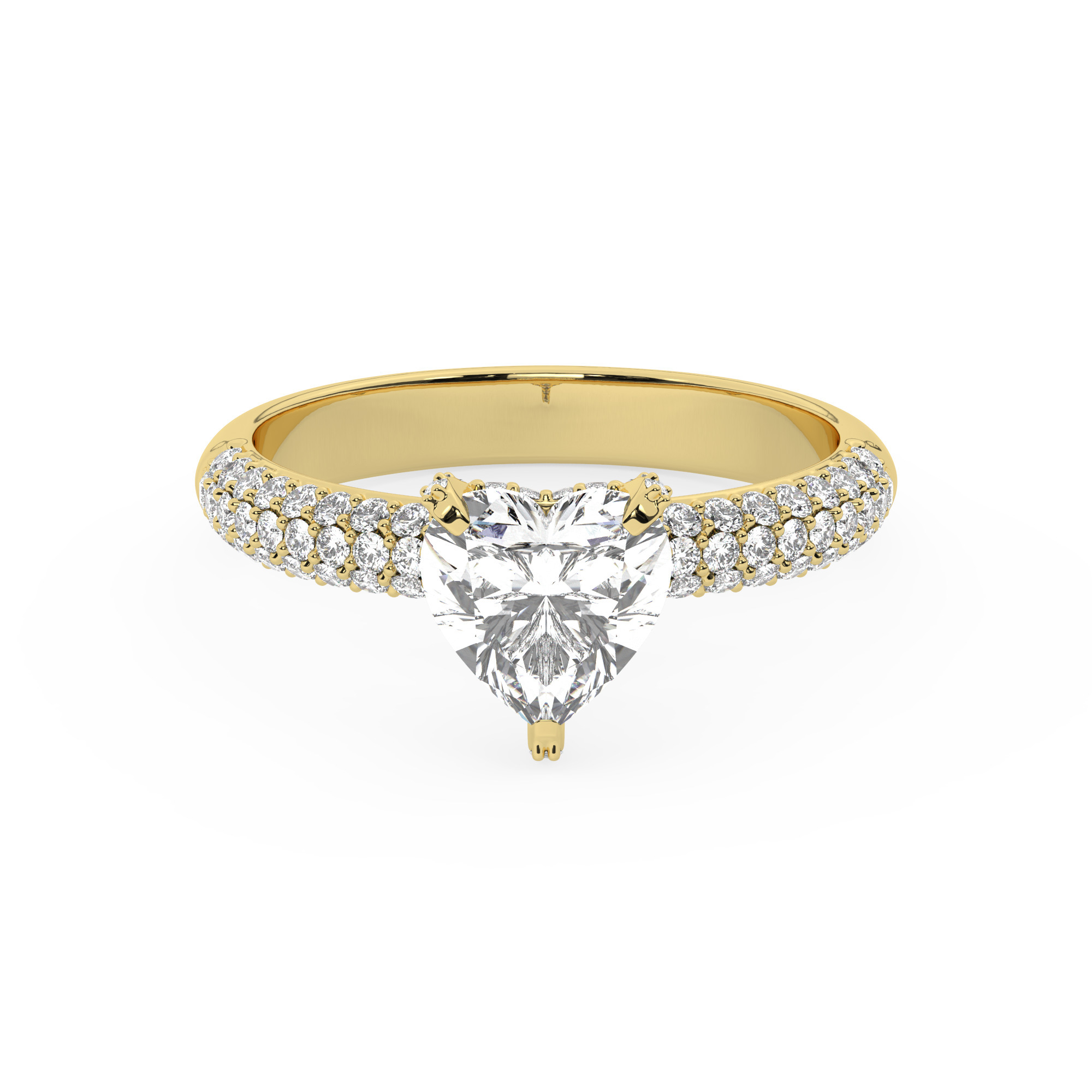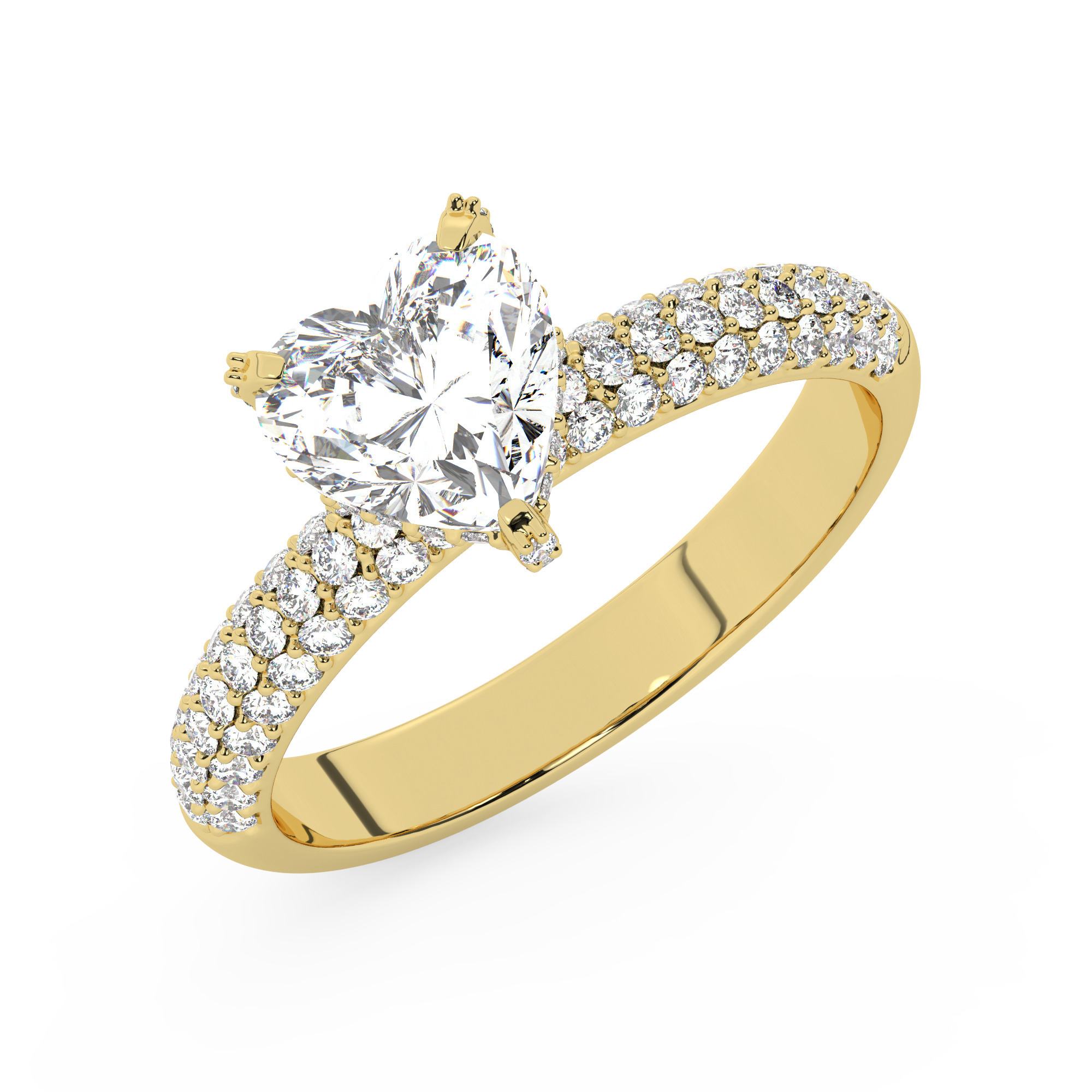 טבעת אירוסין סוליטר קלאסית ומרשימה עם אבן מרכזית בצורת לב ממשיבה נשימה, עשויה כסף מצופה זהב צהוב וכוללת 101 אבנים עם משקל כולל של 3 קרט. מוסונייט איכותי בדרגת ניקיון גבוהה ותעודה גמולוגית בינלאומית GRA.