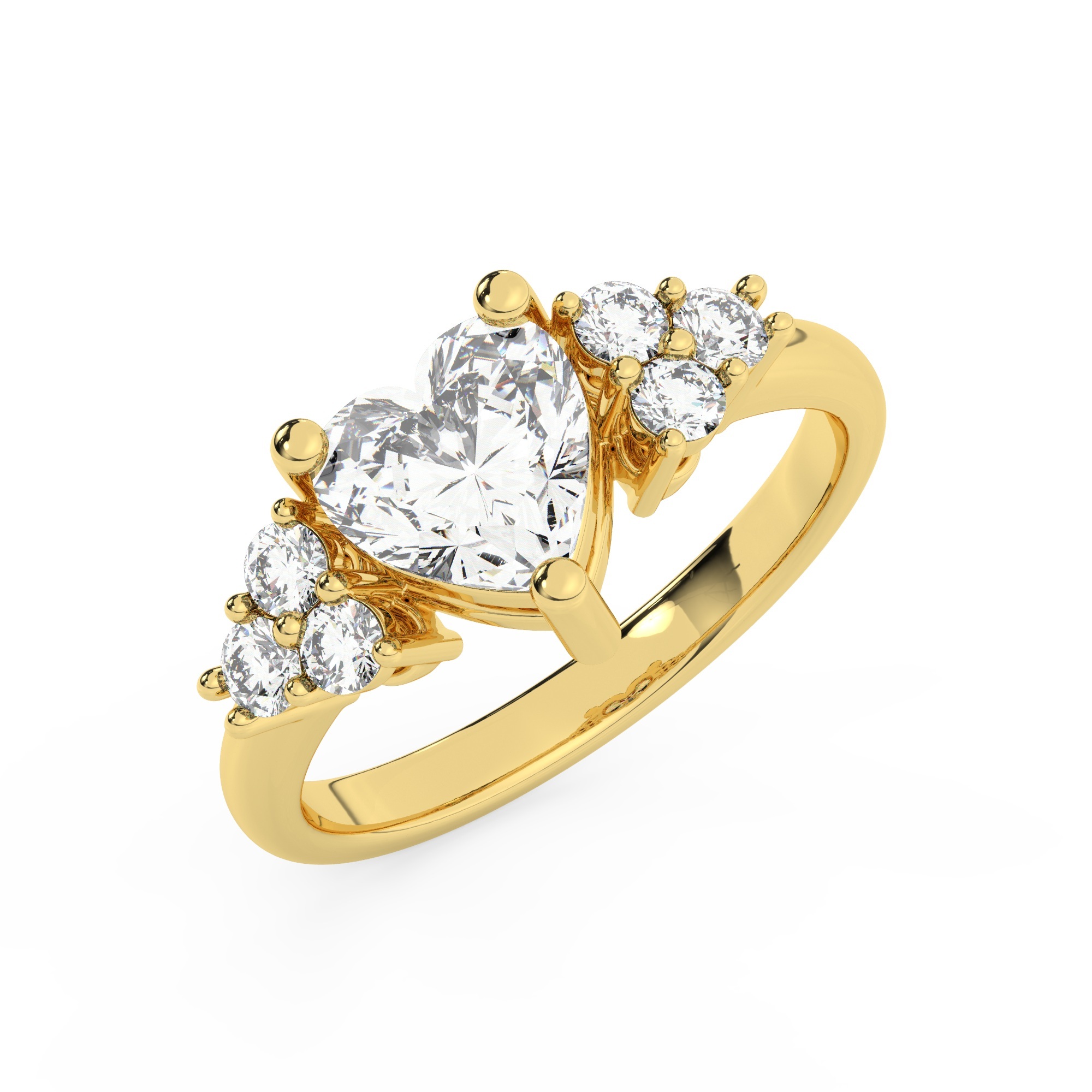 טבעת אירוסין סוליטר ומוסונייט בצדדים דגם 50041 זהב צהוב 14 קראט במרכז אבן מעבדה מוסונייט 4 קראט בחיתוך לב עם תעודה גמולוגית בינלאומית GRA מסביב ובצדדים אבני מעבדה מוסונייט במשקל כולל של 0.30 קראט בחיתוך עגול