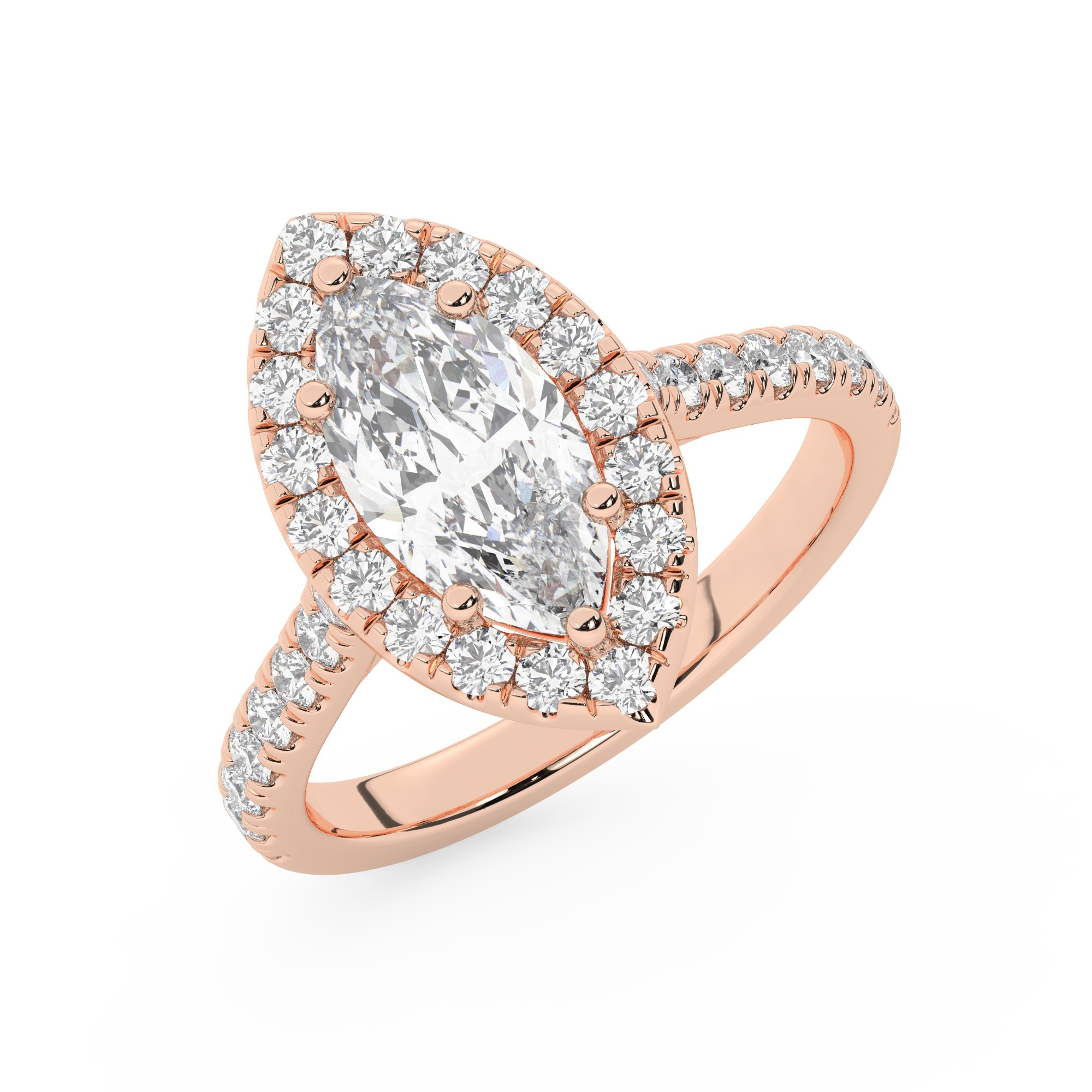 טבעת אירוסין היילו דגם 50026 כסף מצופה זהב אדום רוזגולד במרכז אבן מעבדה מוסונייט 0.50 קראט בחיתוך מרקיזה עם תעודה גמולוגית מסביב ובצדדים אבני מעבדה מוסונייט במשקל כולל של 0.54 קראט בחיתוך עגול