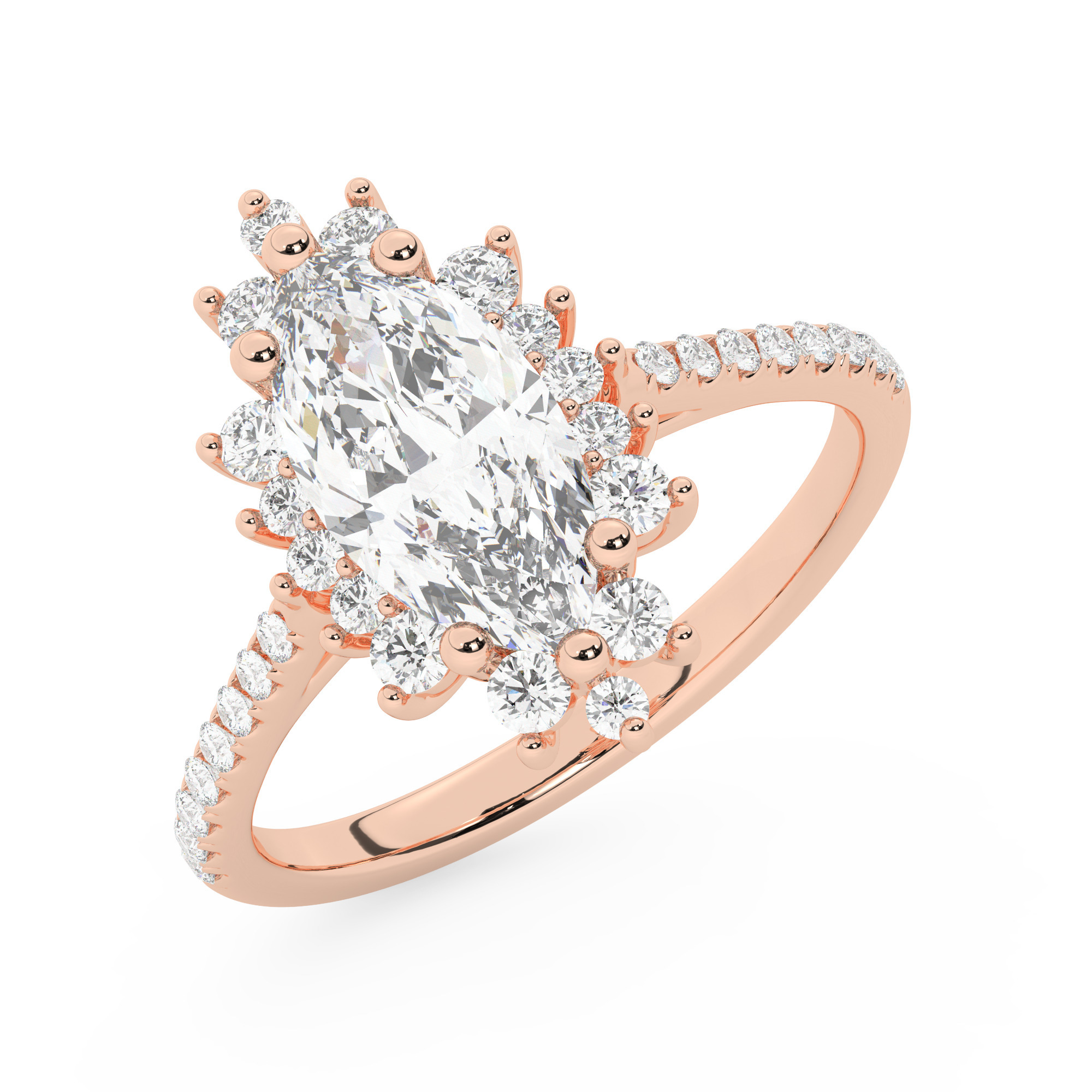 טבעת אירוסין היילו דגם 50024 כסף מצופה זהב אדום רוזגולד במרכז אבן מעבדה מוסונייט 1 קראט בחיתוך מרקיזה עם תעודה גמולוגית בינלאומית GRA מסביב ובצדדים אבני מעבדה מוסונייט במשקל כולל של 0.39 קראט בחיתוך עגול
