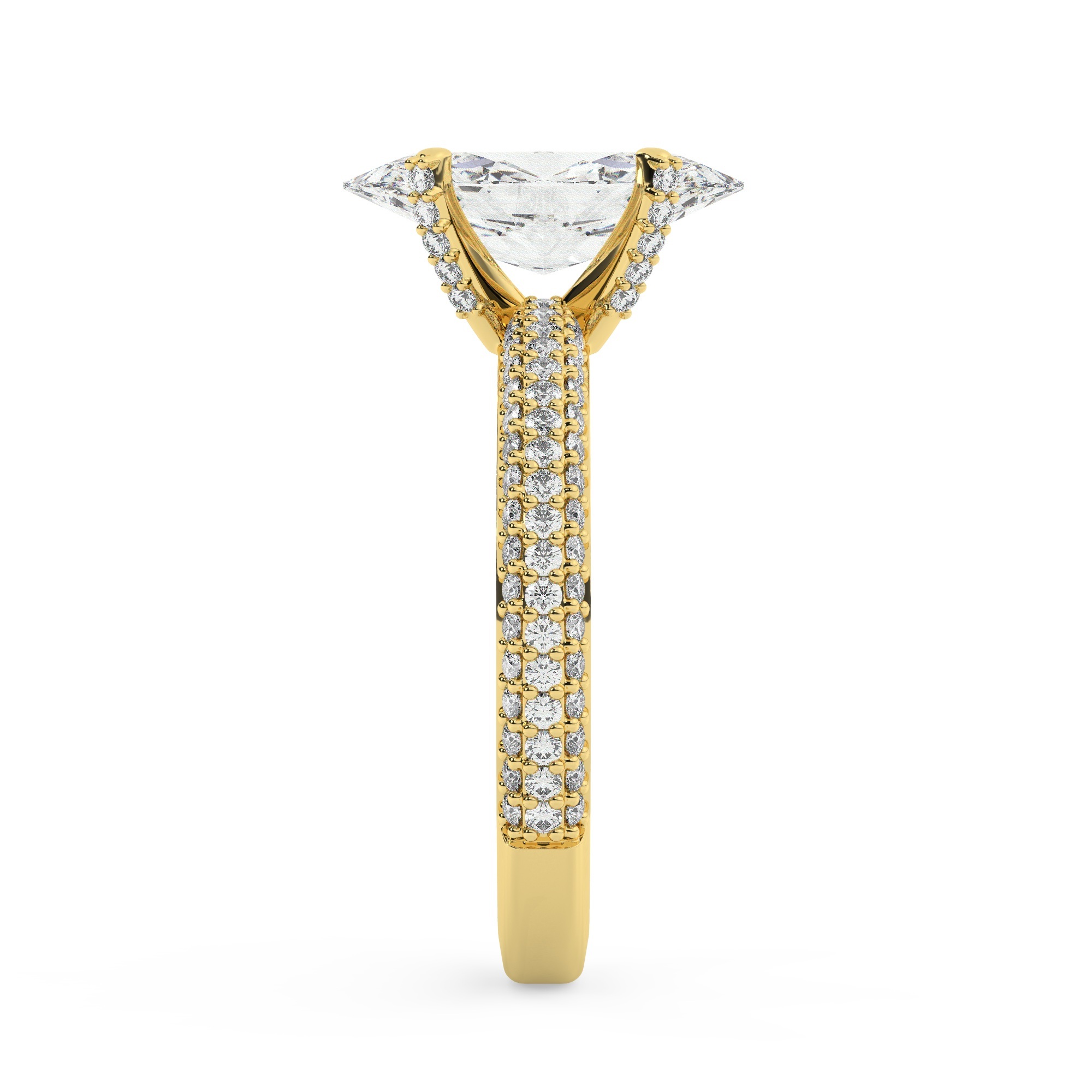 טבעת אירוסין סוליטר יוקרתית בעיצוב מרהיב, עשויה כסף מצופה זהב צהוב ומשובצת 117 אבנים נוצצות במשקל כולל של 1.40 קראט. האבן המרכזית המעבדתית בצורת מרקיזה, במשקל 1 קראט, צבע D וניקיון VVS1, עם תעודה גמולוגית בינלאומית GRA.