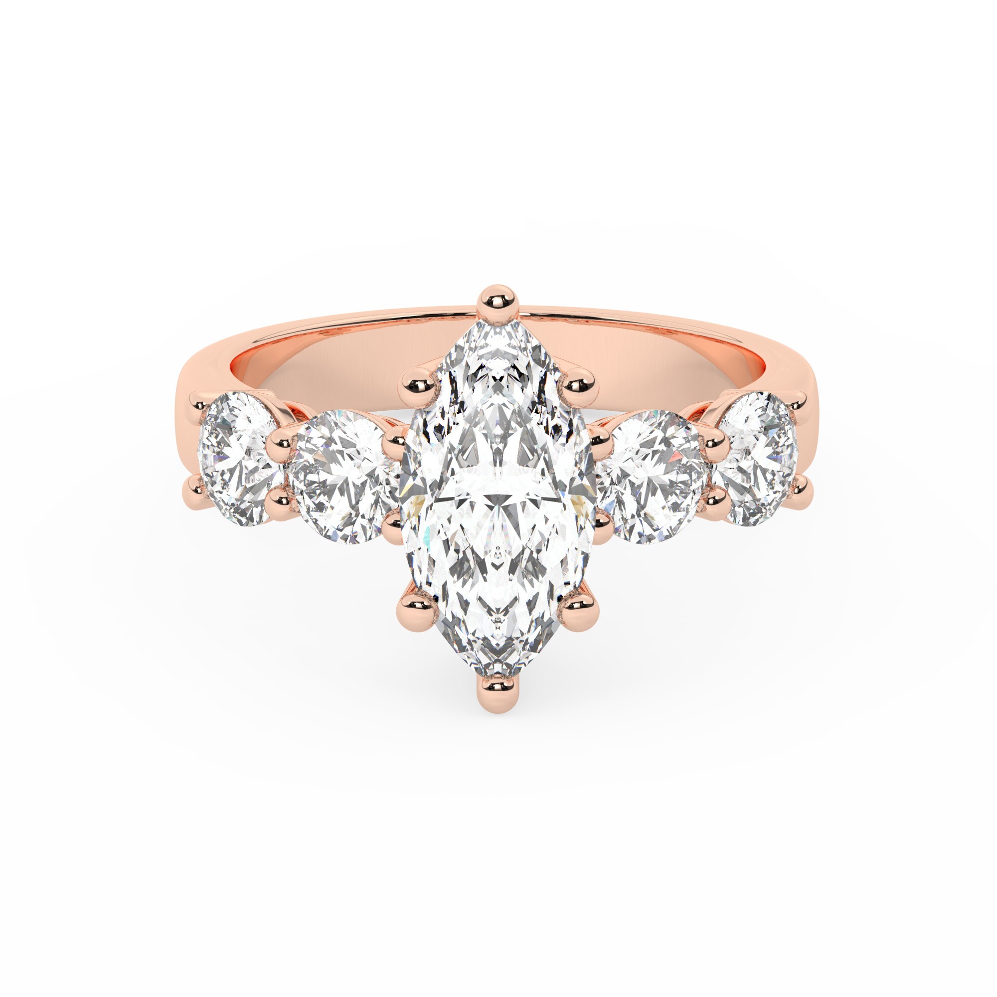 טבעת אירוסין סוליטר ומוסונייט בצדדים דגם 50030 כסף מצופה זהב אדום רוזגולד במרכז אבן מעבדה מוסונייט 1.50 קראט בחיתוך מרקיזה עם תעודה גמולוגית בינלאומית GRA מסביב ובצדדים אבני מעבדה מוסונייט במשקל כולל של 1.08 קראט בחיתוך עגול