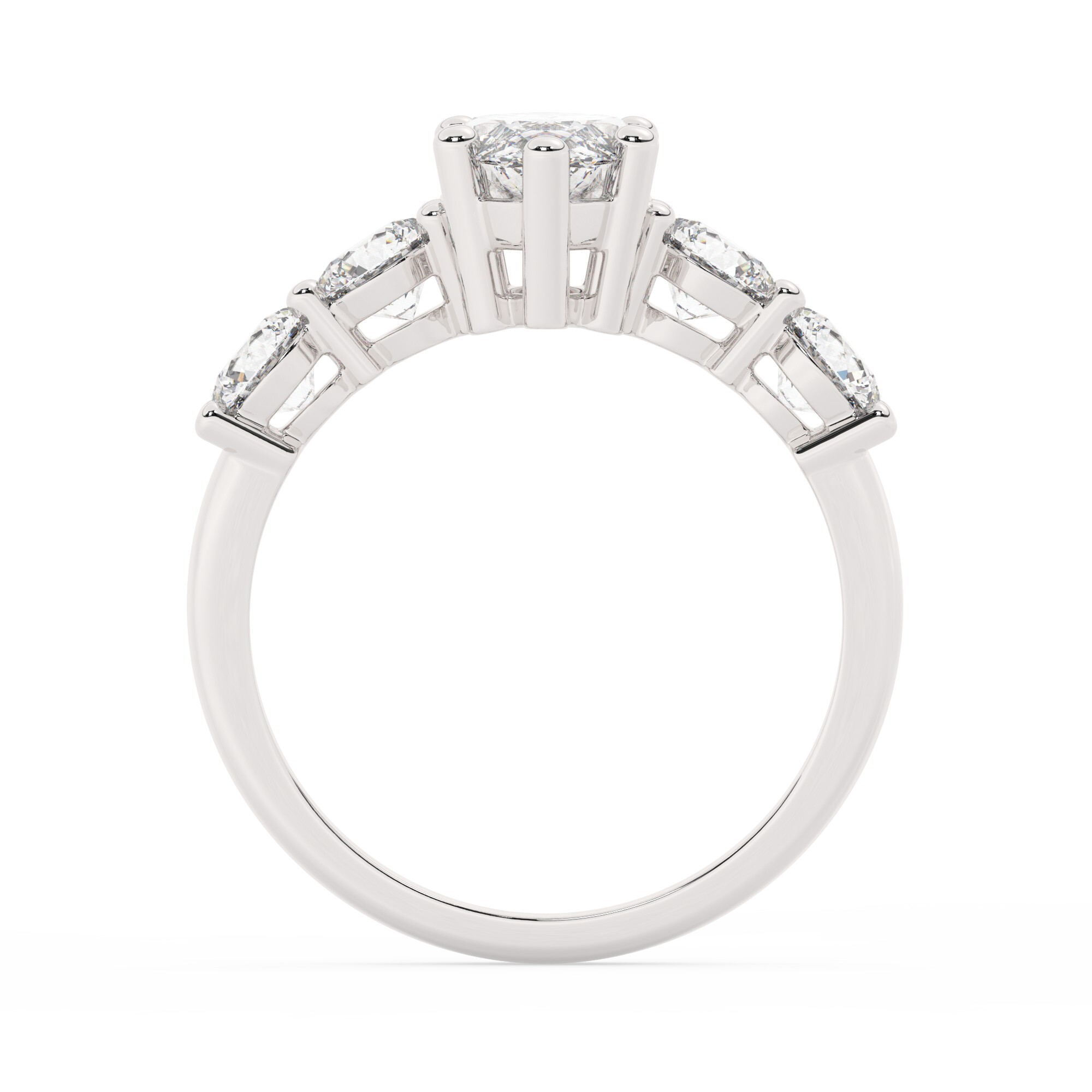 טבעת אירוסין סוליטר ומוסונייט בצדדים דגם 50030 כסף מצופה זהב לבן במרכז אבן מעבדה מוסונייט 1.50 קראט בחיתוך מרקיזה עם תעודה גמולוגית בינלאומית GRA מסביב ובצדדים אבני מעבדה מוסונייט במשקל כולל של 1.08 קראט בחיתוך עגול