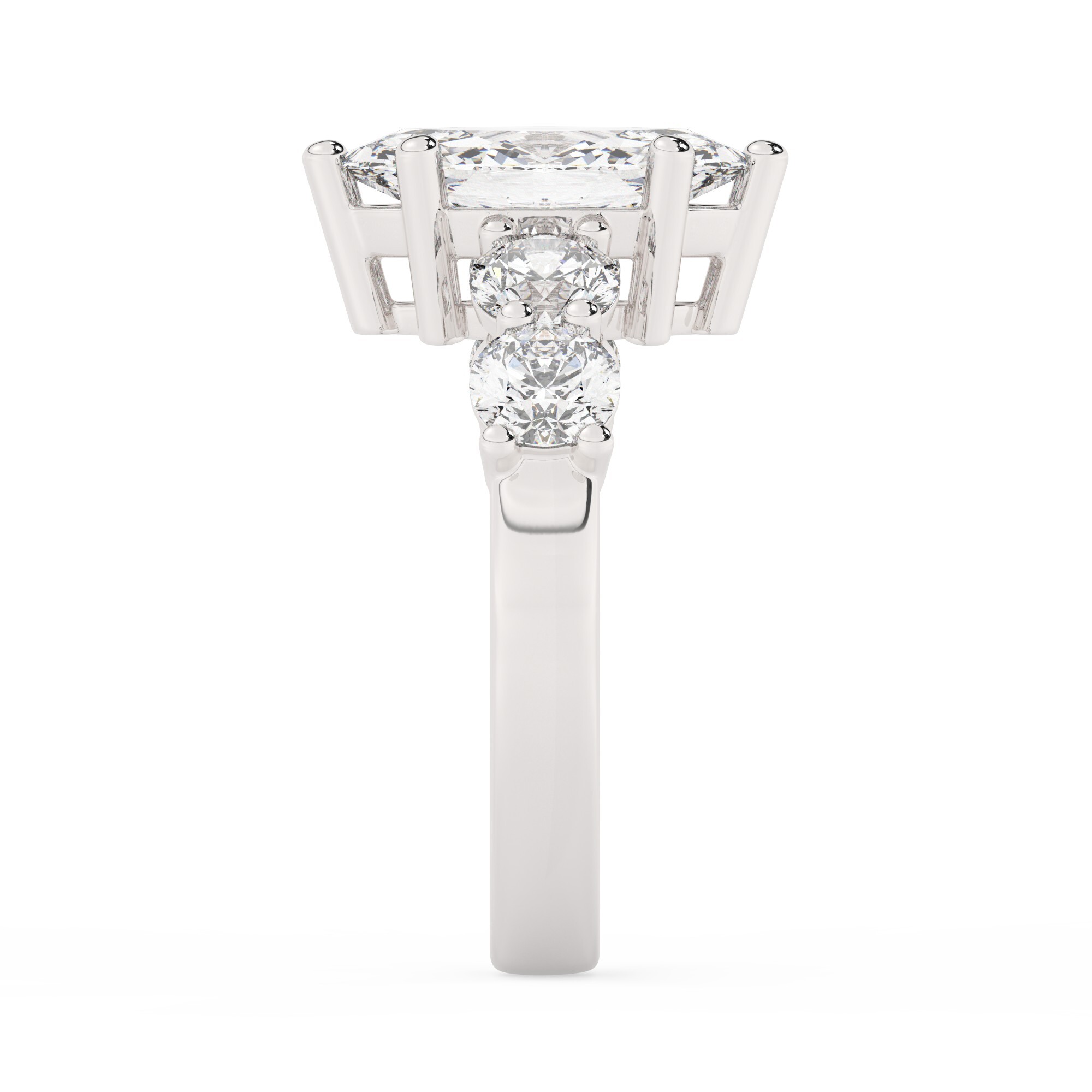 לצד האבן המרכזית מופיעות ארבע אבני מעבדה מוסונייט נוספות בעיצוב עגול, שמשקלן הכולל הוא 1.08 קרט. האבנים הללו, עם הצבע D והבהירות VVS1, משדרות עוצמה ונוכחות ומעצימות את יופייה של הטבעת באופן מרהיב. המראה הסוליטרי המהפנט של הטבעת מושך את העיניים, כשהאבן המרכזית עומדת בבולטות ומוקפת באבני צד שמוסיפות קסם ועניין.