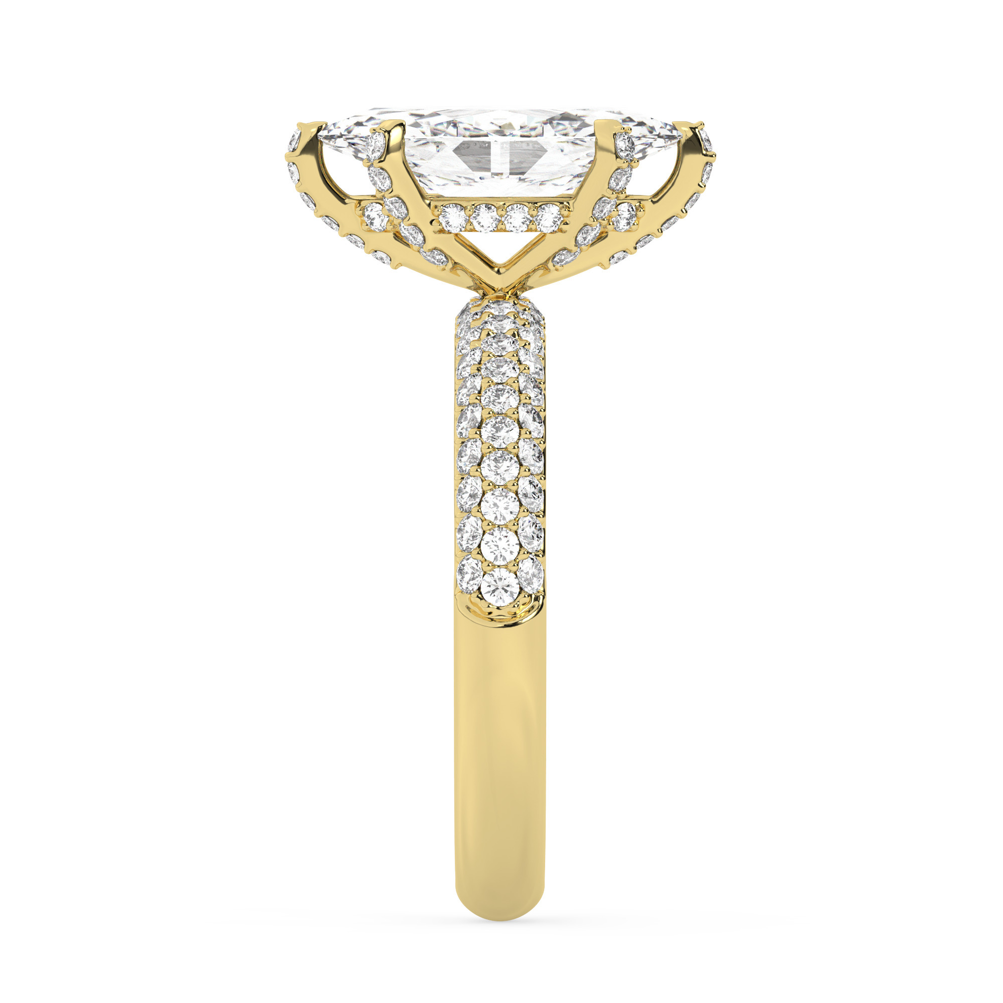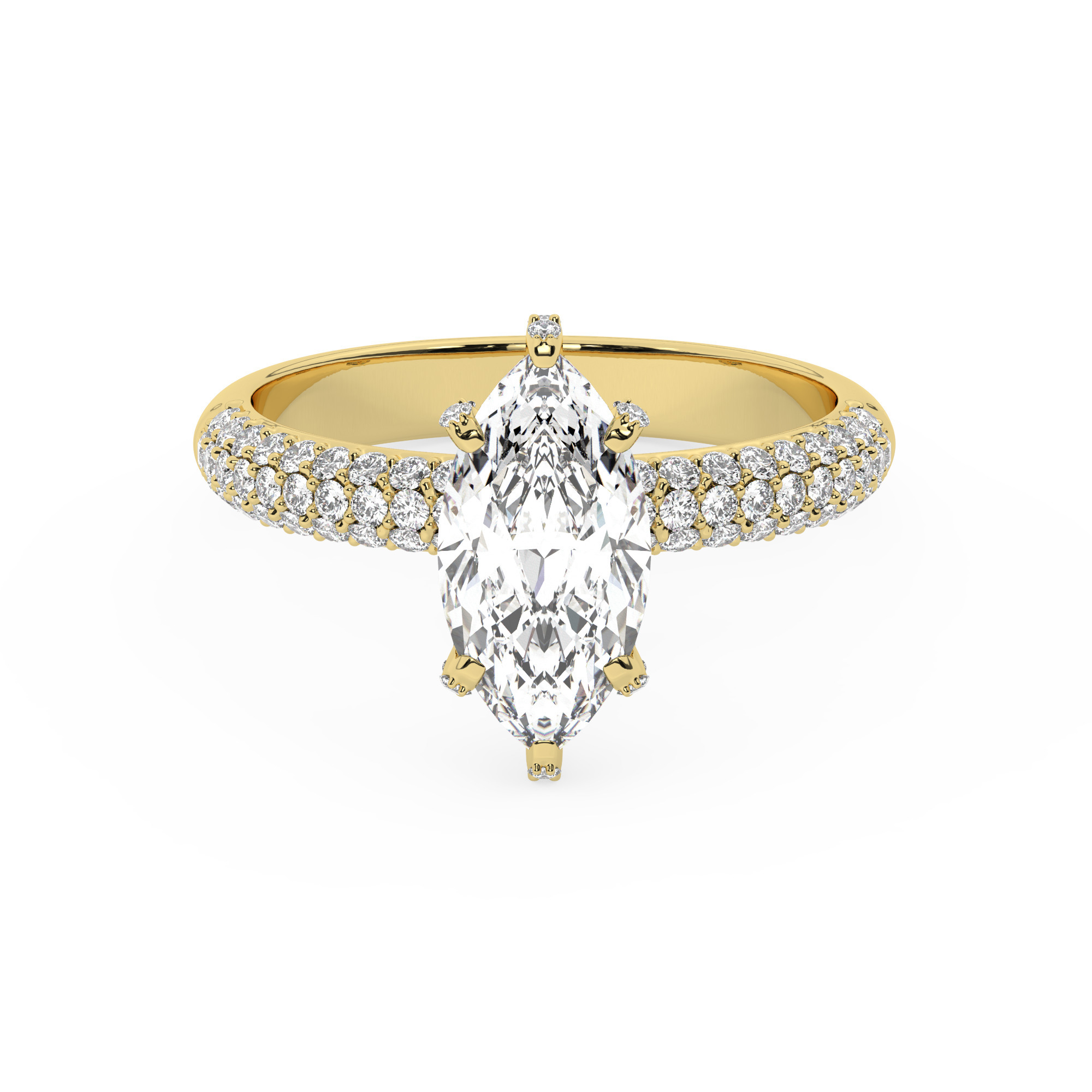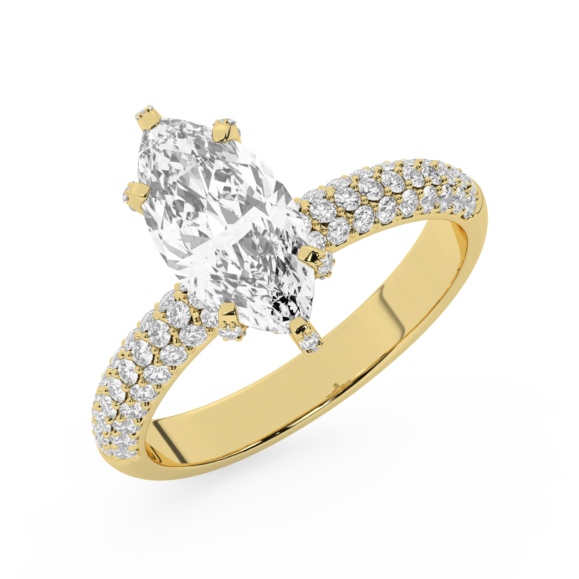 טבעת אירוסין סוליטר יוקרתית עם אבן מוסונייט מרקיזה במשקל 2.50 קראט, מוקפת ב-100 יהלומים מנצנצים בצדדים. עשויה מכסף בציפוי זהב צהוב, באיכות וניראות בלתי מתפשרת. האבנים בליטוש מדויק בציון ניקיון VVS1 ובצבע D.