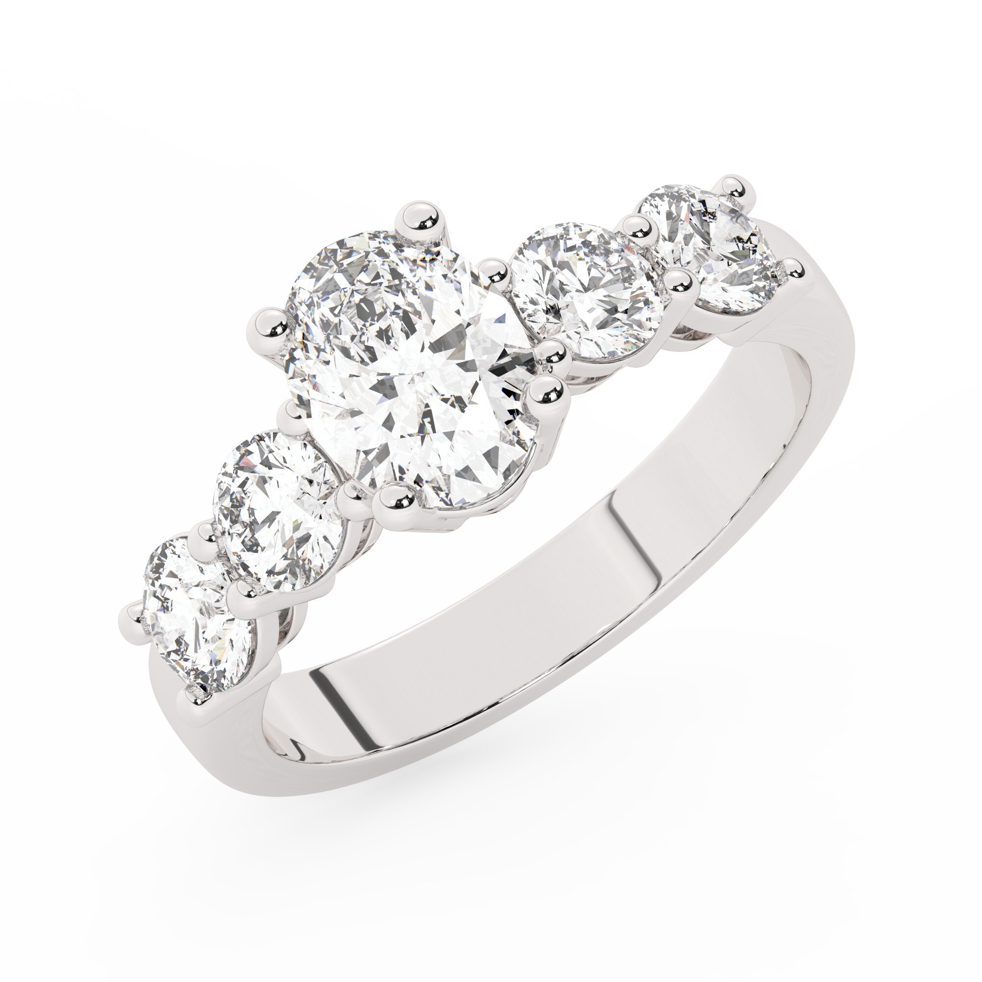 טבעת אירוסין סוליטר ומוסונייט בצדדים דגם 50030 כסף מצופה זהב לבן במרכז אבן מעבדה מוסונייט 0.75 קראט בחיתוך אובל עם תעודה גמולוגית מסביב ובצדדים אבני מעבדה מוסונייט במשקל כולל של 1.08 קראט בחיתוך עגול