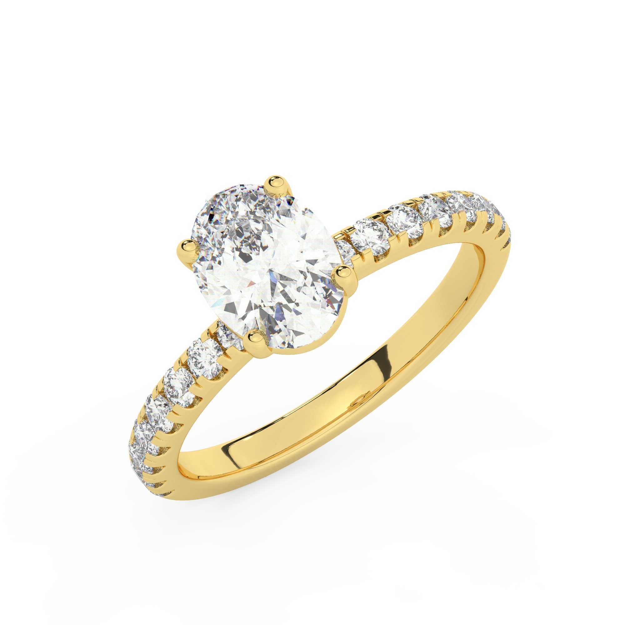 טבעת אירוסין סוליטר ומוסונייט בצדדים דגם 50037 זהב צהוב 14 קראט במרכז אבן מעבדה מוסונייט 1 קראט בחיתוך אובל עם תעודה גמולוגית בינלאומית GRA מסביב ובצדדים אבני מעבדה מוסונייט במשקל כולל של 0.32 קראט בחיתוך עגול