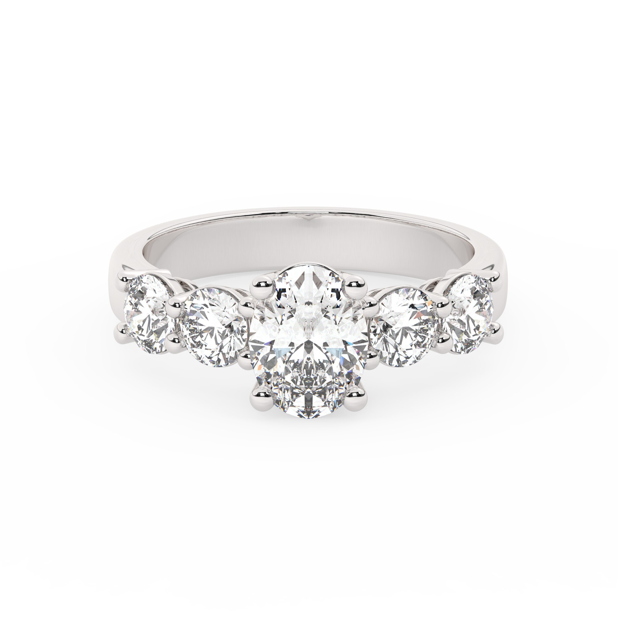 טבעת אירוסין סוליטר ומוסונייט בצדדים דגם 50030 כסף מצופה זהב לבן במרכז אבן מעבדה מוסונייט 1.50 קראט בחיתוך אובל עם תעודה גמולוגית בינלאומית GRA מסביב ובצדדים אבני מעבדה מוסונייט במשקל כולל של 1.08 קראט בחיתוך עגול