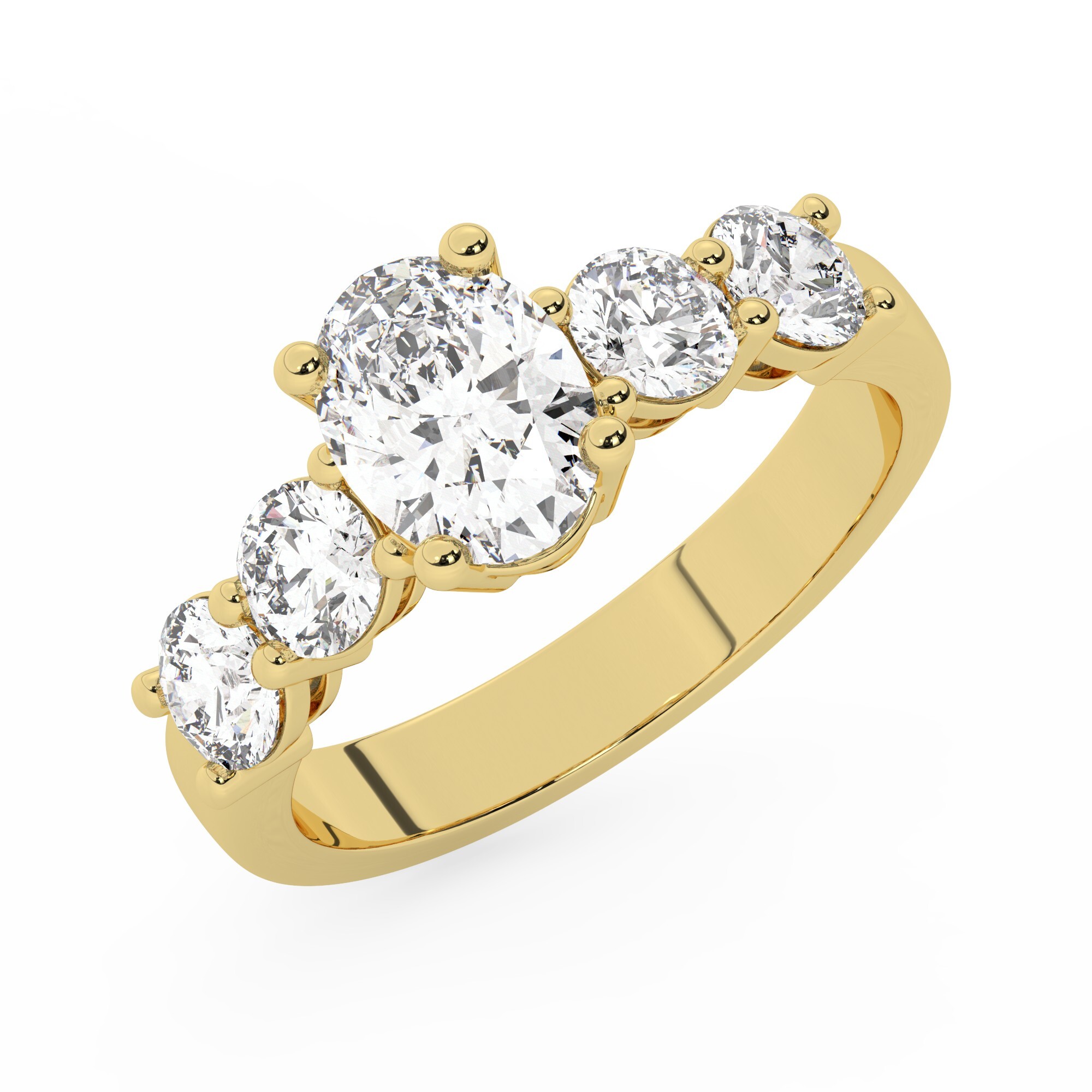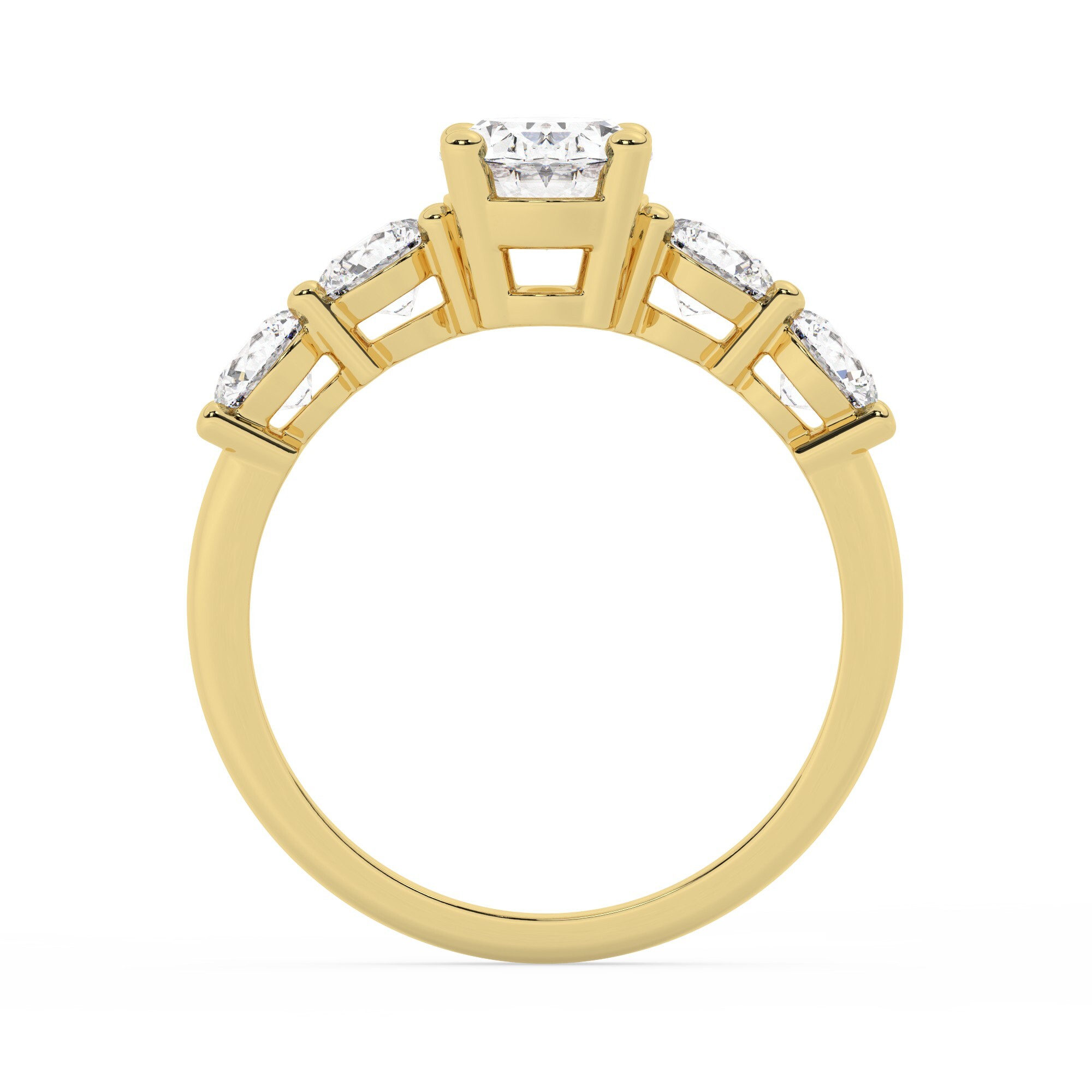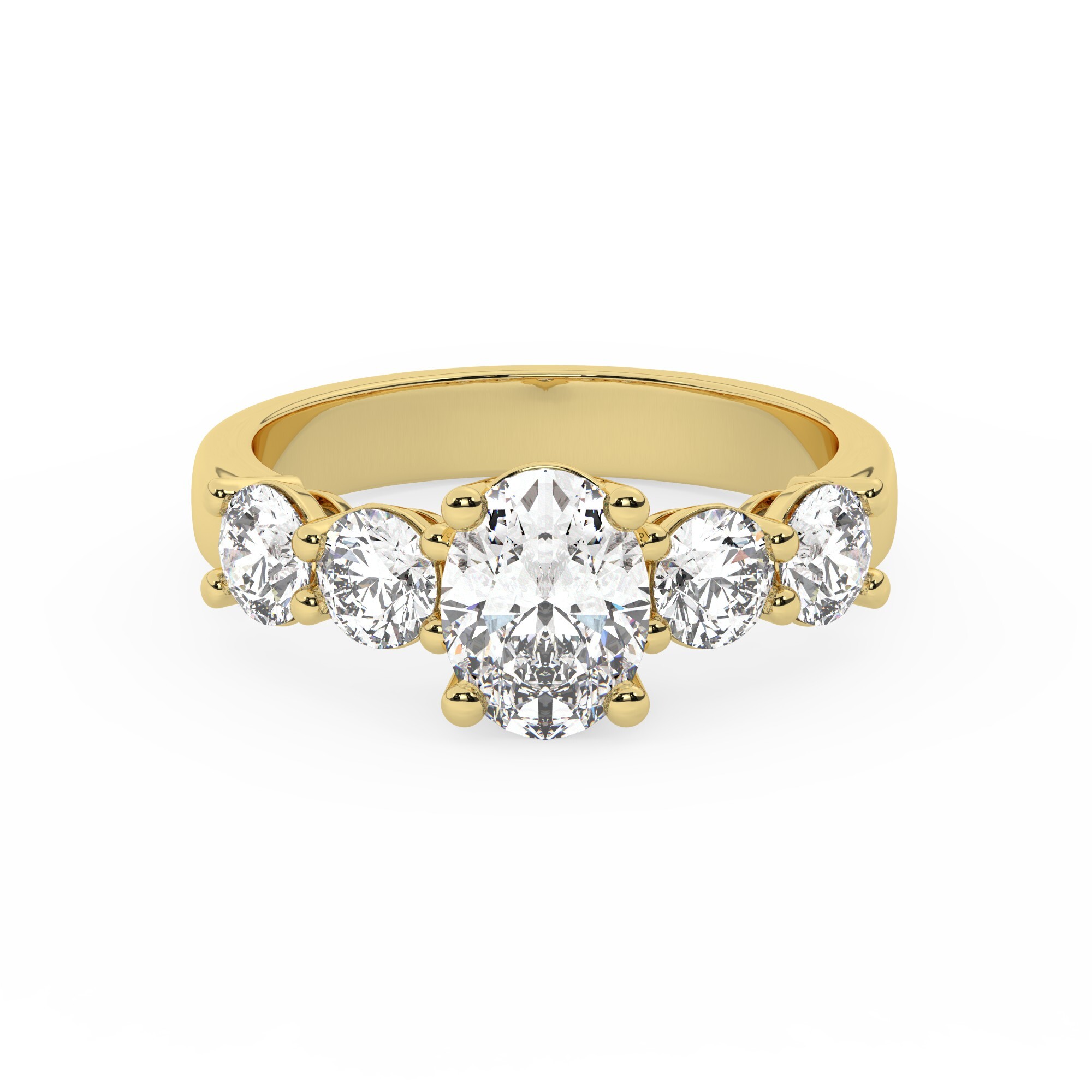 טבעת אירוסין סוליטר ומוסונייט בצדדים דגם 50030 כסף מצופה זהב צהוב במרכז אבן מעבדה מוסונייט 1.50 קראט בחיתוך אובל עם תעודה גמולוגית בינלאומית GRA מסביב ובצדדים אבני מעבדה מוסונייט במשקל כולל של 1.08 קראט בחיתוך עגול