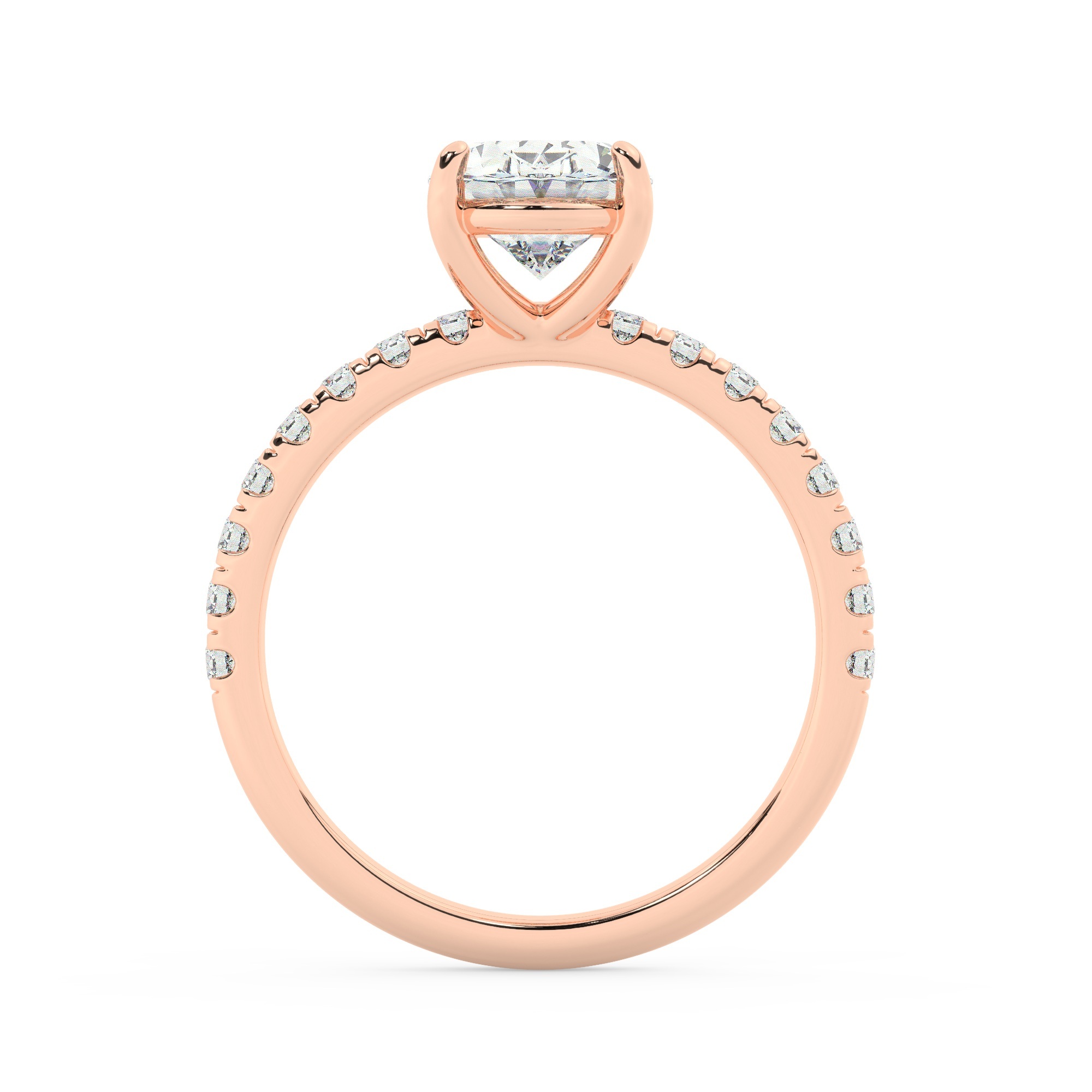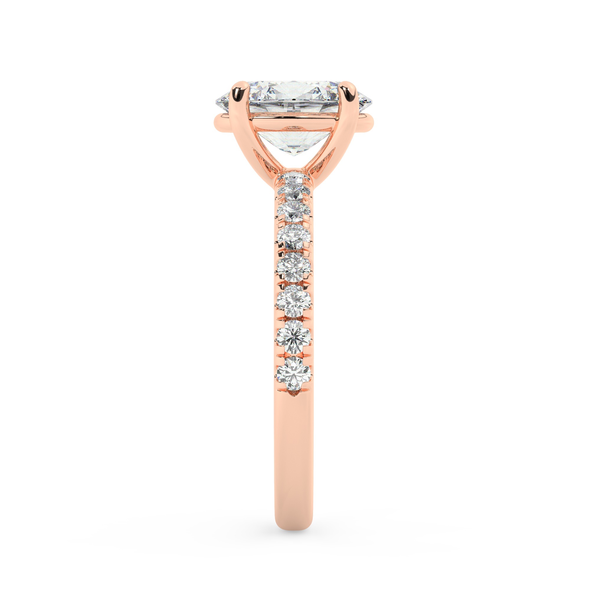 טבעת אירוסין סוליטר ומוסונייט בצדדים דגם 50037 זהב אדום רוזגולד 14 קראט במרכז אבן מעבדה מוסונייט 2 קראט בחיתוך אובל עם תעודה גמולוגית בינלאומית GRA מסביב ובצדדים אבני מעבדה מוסונייט במשקל כולל של 0.32 קראט בחיתוך עגול