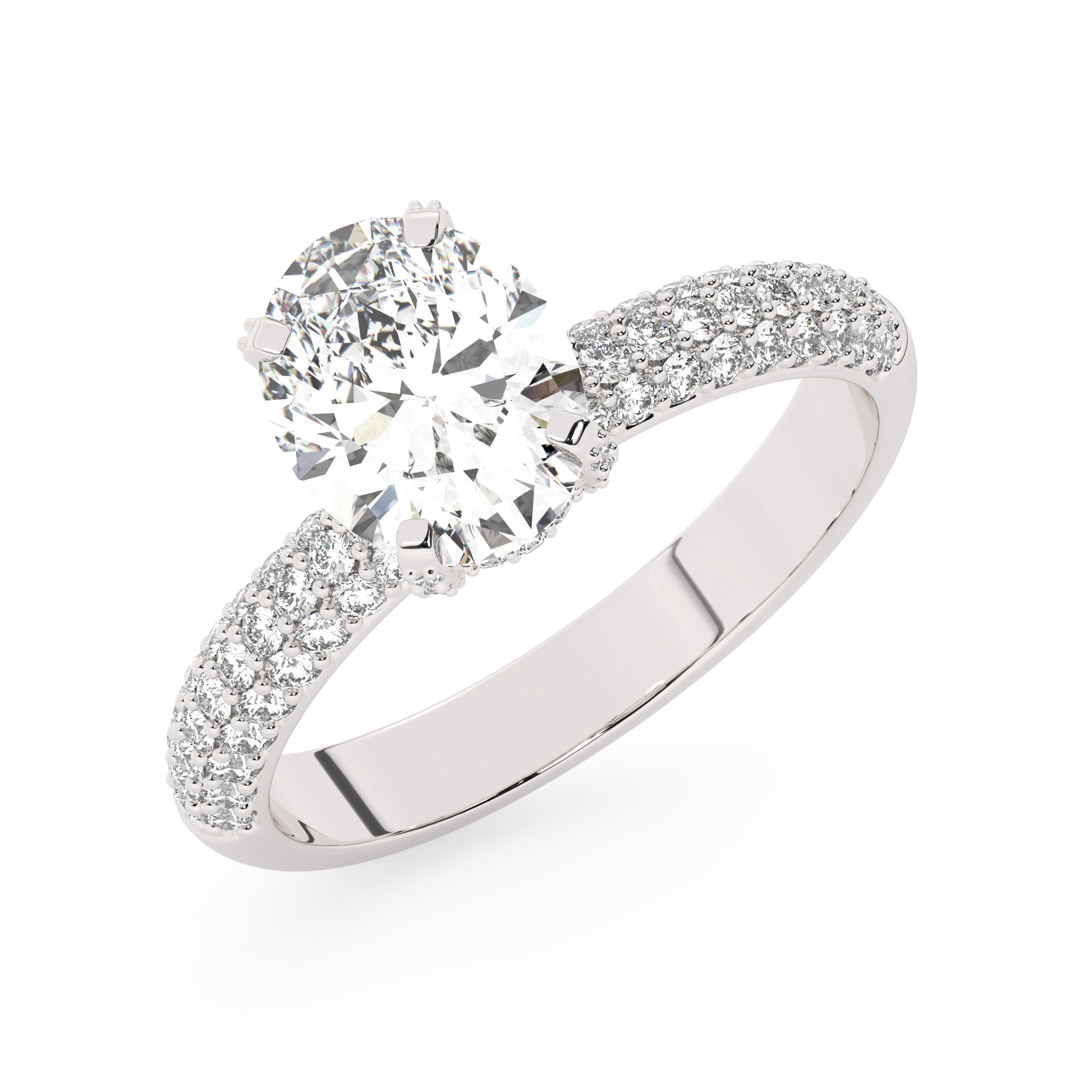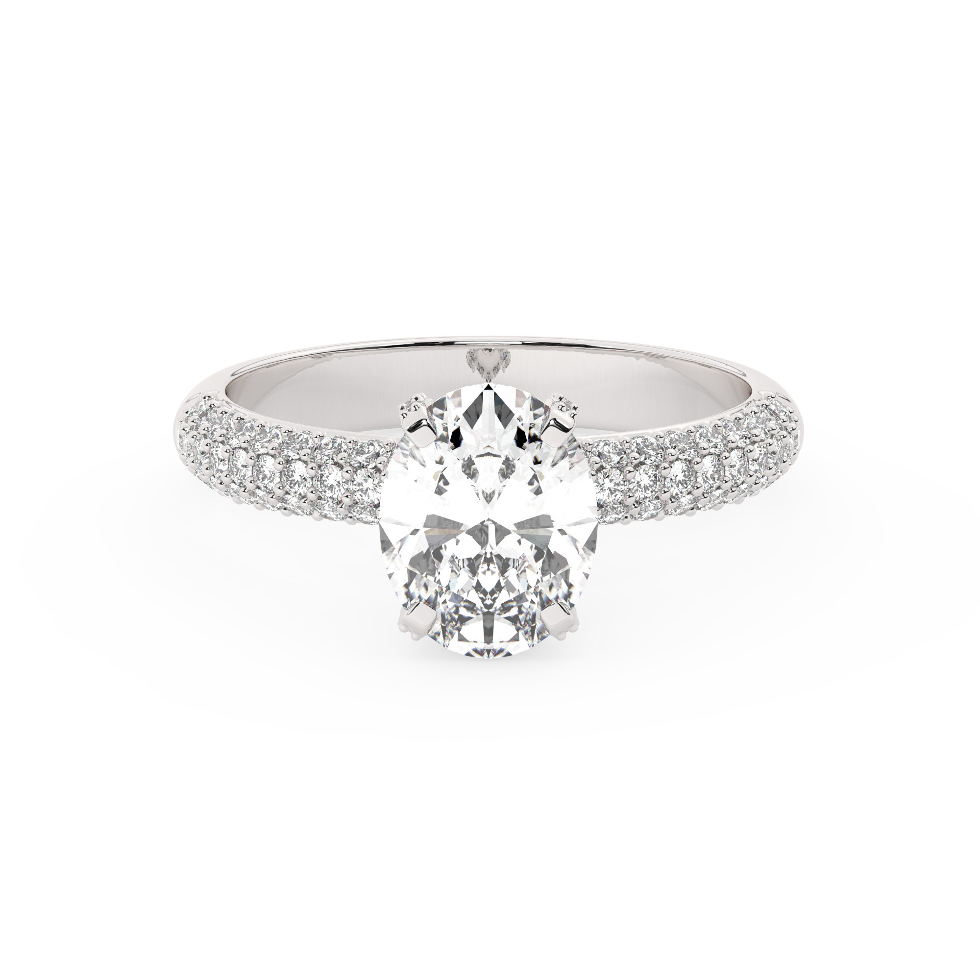טבעת האירוסין המושלמת לשלב הבא בחיים – עיצוב סוליטר ייחודי אשר נמצא בליבת הקלאסיקה, עם טוויסט מודרני ויוקרתי במיוחד. האבן המרכזית, מוסונייט מעבדה איכותית בצורת אובל במשקל 2 קראט, נוצצת וברורה עם גימור מושלם, מוקפת ב-100 אבנים קטנות שמחוזקות לאורך הצדדים ומעצימות את הברק.