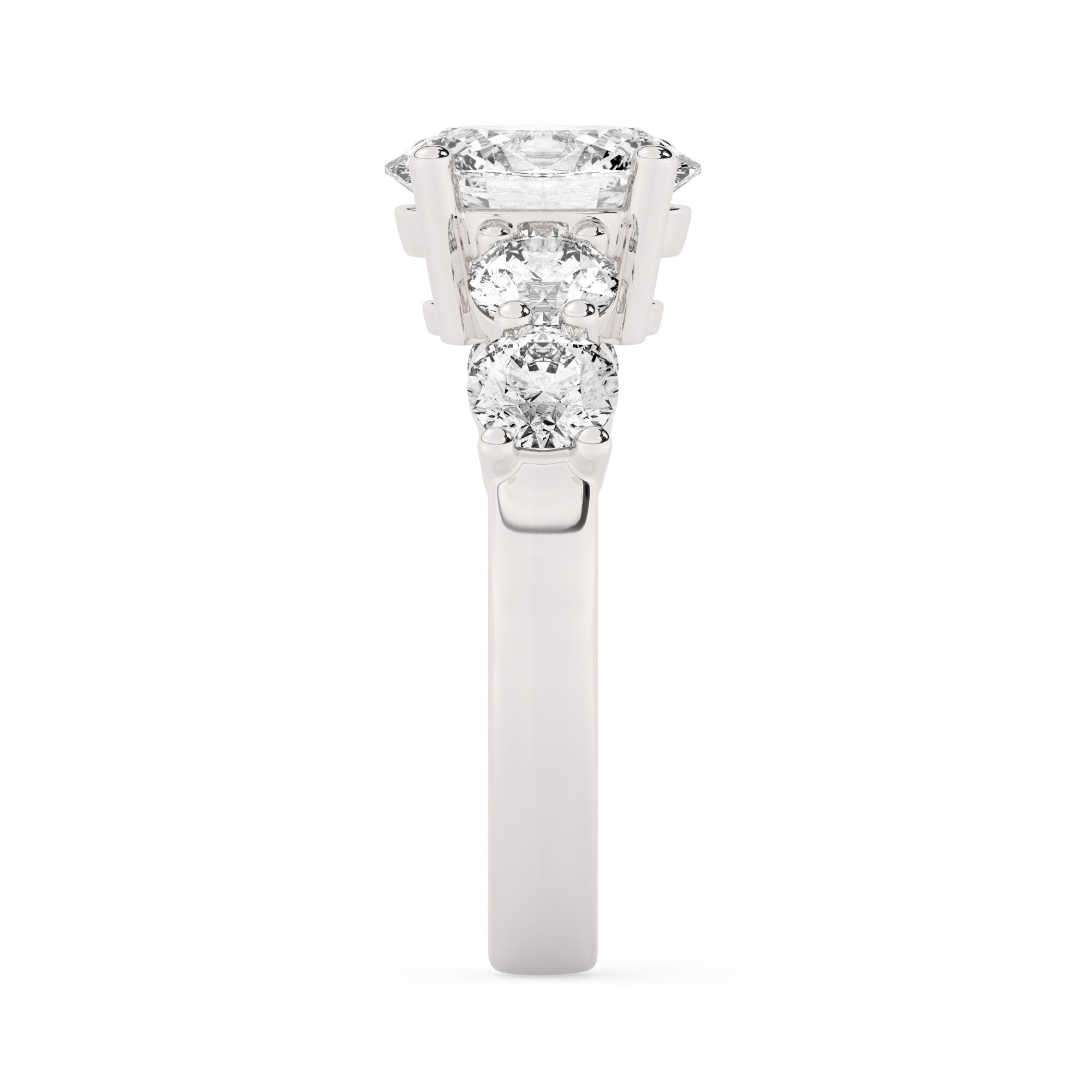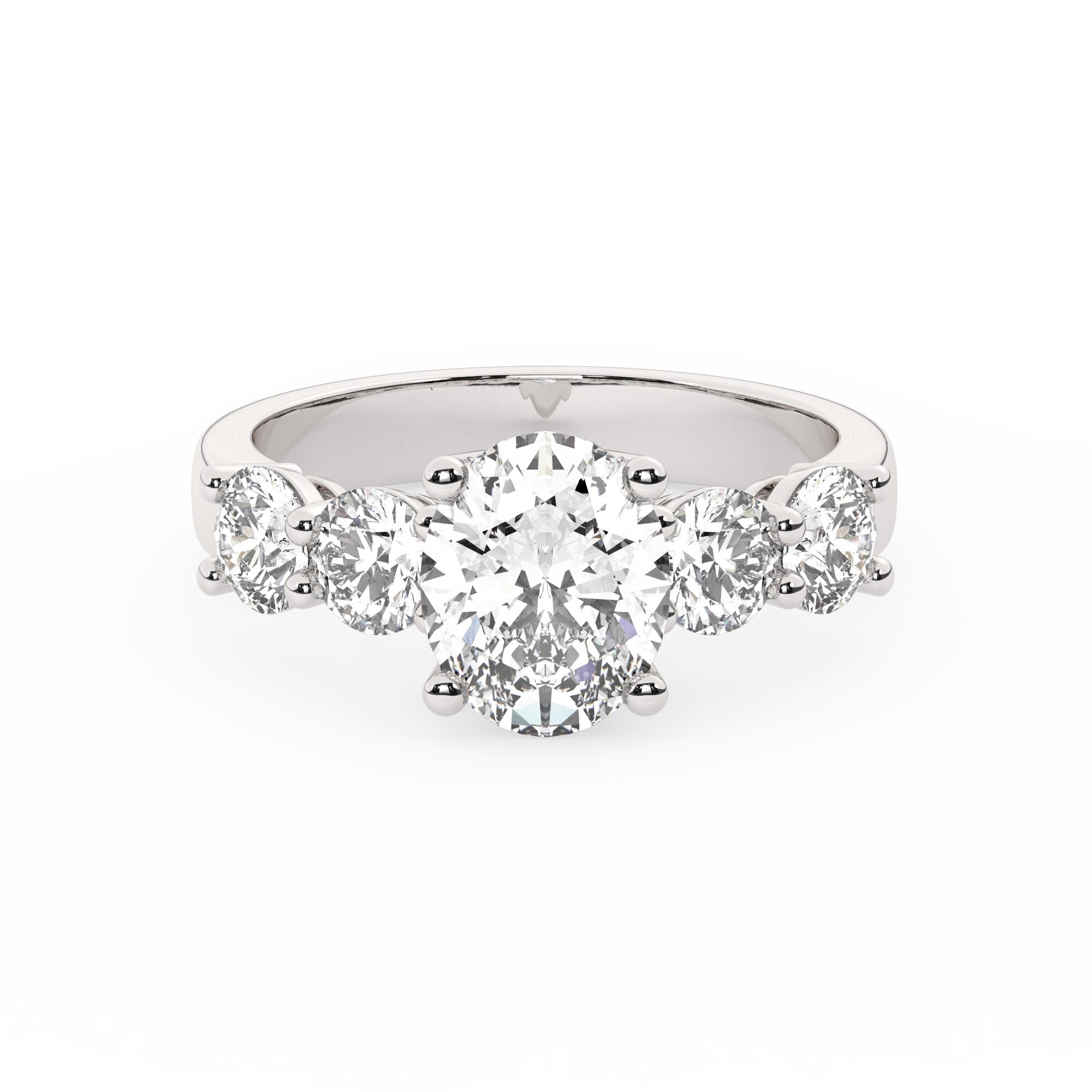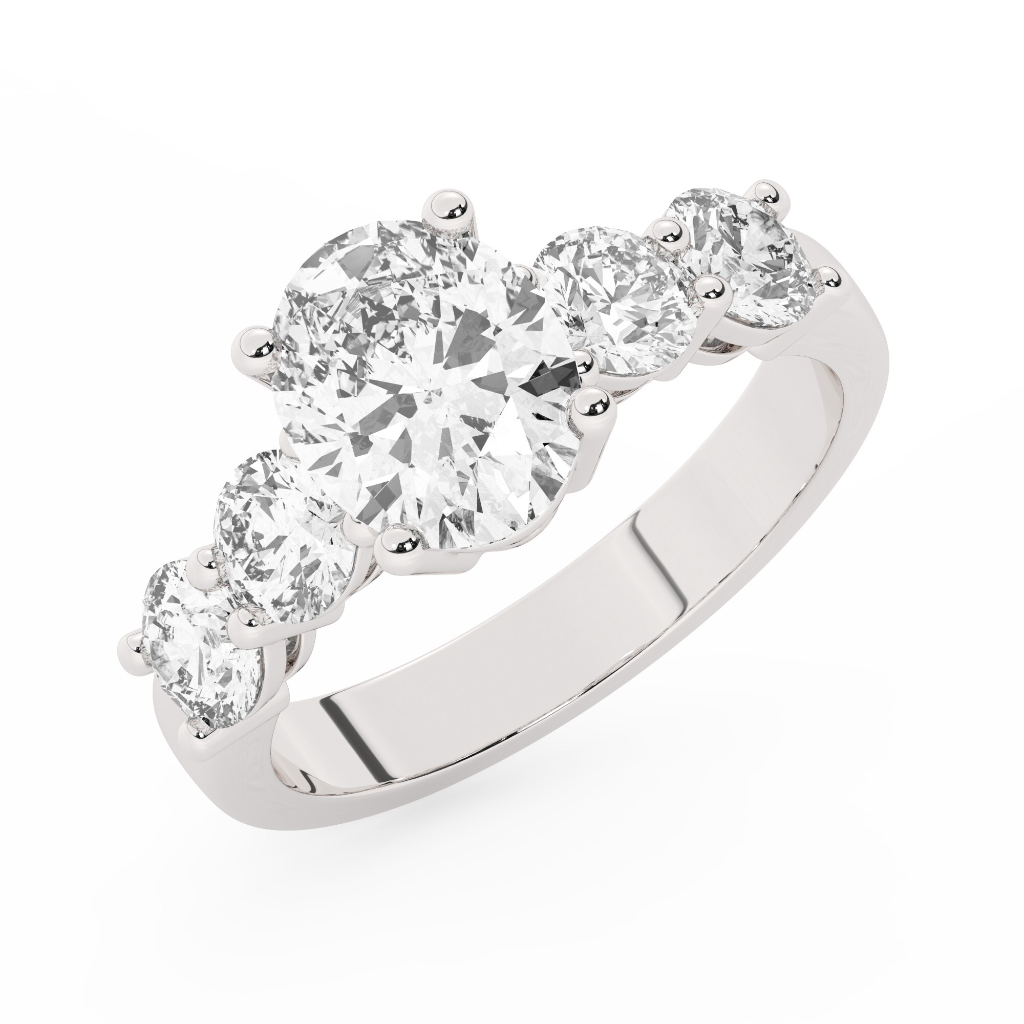 טבעת אירוסין סוליטר ומוסונייט בצדדים דגם 50030 זהב לבן 14 קראט במרכז אבן מעבדה מוסונייט 2.50 קראט בחיתוך אובל עם תעודה גמולוגית בינלאומית GRA מסביב ובצדדים אבני מעבדה מוסונייט במשקל כולל של 1.08 קראט בחיתוך עגול